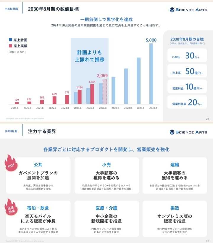 ⬇サイエンスアーツが発表した「事業計画及び成長可 能性に関する事項」から、一部引用しています⬇ こんばんは😊 本日の投資結果どうだったですか? 僕の日本株資産は、1.50%の増加、 米国株資産は、1.21%の増加で株式資産は増加した😜 NISAの米国株の保有株も多くが上昇、 なぜか、NISAの含み益が増えるのが一番嬉しいかも😌 銘柄選択含め、全てが自己流のやり方だから、 NISA資産を2倍という目標に近づくのが楽しいのだ。 また、本日、サイエンスアーツが、 「事業計画及び成長可能性に関する事項」を発表した。 発表資料から一部引用しているが、 2030年8月期の目標数値【売上高50億円】目指して、 更に、営業販売を頑張って欲しいと思っている。 株価は、業績拡大が予定通り進めば、 高確率で上昇すると信じるのが、中長期的投資だ😌 最低4年間、保有継続して、確かめてみたい😁☝ 冷静に考えると非効率な投資とも言えるが、 5年で10倍になってたら、まぁまぁなんじゃない😋 本日もお読みいただきありがとうございます。 ✳✳投資は、自己責任でお願いします✳✳ ⬇サイエンスアーツの4年後の株価に期待しよう😜⬇ ☆米国株の情報なら 米国株四半期速報2025年秋号 [ 亜州リサーチ株式会社 ] ☆中国株の情報なら 中国株二季報2025年夏秋号 [ DZHフィナンシャルリサーチ ] ☆スマホ対応ドアホンなら SALE【レビュー特典付★日本メーカー製スマートドアホン】インターホン ワイヤレス 工事不要 連動 録画 防犯カメラ付き 屋外 通話 暗視 玄関 wifi対応 呼び出しチャイム インターフォン バッテリー 充電式 配線不要 電源不要 賃貸 子機付き MI73(A) MI75 MJ75 ☆アセチルLカルニチンなら アセチル-Lカルニチン 500mg ベジカプセル 200粒 ナウフーズ ナウ ビタミン びたみん サプリ サプリメント アミノ酸 アセチルL-カルニチン【Now Foods Acetyl L-Carnitine 500mg, 200 Veg Capsules】 ☆有機桑茶なら 【総合1位★クーポンで2,754円】( 有機 みどりの桑茶 100包 ) 送料無料 わくわく園 有機JAS 国産 桑 桑茶 桑の葉 桑の葉茶 ティーバッグ お茶 パック オーガニック ノンカフェイン 茶 青汁 粉末 粉茶 パウダー 温活 茶 ミネラル