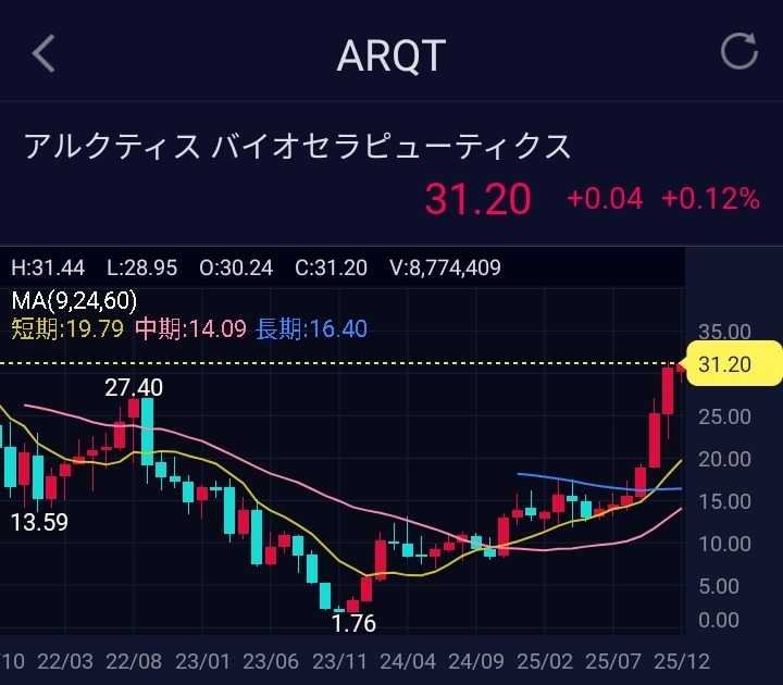 ⬇NISAの米国個別株の損益率は、+67.20%に上昇⬇ ⬇先週末のNISAの米国個別株の損益率は+66.26%⬇ ⬇個別株の全16銘柄で、利益確定を狙っていく😁⬇ ⬇1番の含み益銘柄は、株価5倍超えのARQTだ😊⬇ こんにちは😊 週末、いかがお過ごしでしょうか? 僕は、仕事を終えてシャワーを済ませ、 テレビでマラソン中継を見終わって、マッタリ中😜 さて、NISAの米国個別株の損益率は、 今週末は、+67.20%、先週末は、+66.26%で なんとか、先週末より0.96%の上昇となってくれた😌 含み益の金額は、+1,249,245円となり、 100万円を突破してきたので、良い感じである。 含み益150万円位で、 1度利益確定するのもありかと、最近は考えている😌 もう十分な利益額だし、 買いたい銘柄の購入資金も出来ることだしね😜 今後の相場次第だ! クリスマスラリーに期待しよう😉 本日もお読みいただきありがとうございます。 ✳✳投資は、自己責任でお願いします✳✳ ☆米国株の情報なら 米国株四半期速報2026年新年号 [ 亜州リサーチ株式会社 ] ☆中国株の情報なら 中国株二季報2026年春号 [ DZHフィナンシャルリサーチ ] ☆スマホ対応ドアホンなら 55%オフ&抽選でPバック【レビュー特典付★日本メーカー製スマートドアホン★スマホでドアホン】インターホン ワイヤレス 工事不要 録画 防犯カメラ付き 屋外 通話 暗視 玄関 wifi対応 呼び出しチャイム バッテリー 充電式 配線不要 電源不要 賃貸 子機付き MI73A MI75 MJ75 ☆アセチルLカルニチンなら アセチル-Lカルニチン 500mg ベジカプセル 200粒 ナウフーズ ナウ ビタミン びたみん サプリ サプリメント アミノ酸 アセチルL-カルニチン【Now Foods Acetyl L-Carnitine 500mg, 200 Veg Capsules】 ☆有機桑茶なら 【総合1位★クーポンで半額】( ほうじ茶 100包 有機 桑の葉 使用 ) 有機JAS 桑茶 桑の葉茶 桑の葉 ティーパック ティーバッグ 送料無料 わくわく園 オーガニック 焙じ茶 お茶 ノンカフェイン くわ 茶 健康 妊婦 美容 国産