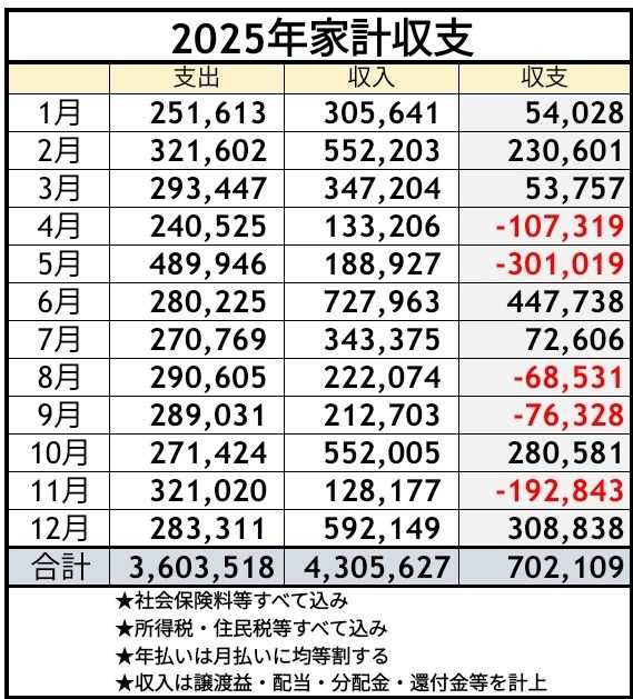 ⬇2025年12月の家計収支は、約30万円の黒字だ😊⬇ ⬇2025年の年間家計収支は、約70万円の黒字だ😊⬇ ⬇早期退職後6年間の家計収支は約605万円の赤字⬇ こんにちは😊 年始は、いかがお過ごしでしょうか? 僕は、仕事を終えてシャワーをすませ、 洗濯機を回しながら、窓辺に座って日向ぼっこ😜 さて、2025年が終わったので、 家計収支等を集計したので確認してみます。 12月の家計収支が、約30万円の黒字なのは、 旧NISAのVYMの利益確定額が大きかったからである。 2025年の支出は、 2024年対比で、約82万円の増加となっている😓 引越しと関連して購入したものが多かったこと、 実家に帰省する回数が増え高速代や燃料費が増加、 妻の手術後に生活様式を変更したことなどに加え、 インフレが生活費全てに影響を与えているのである。 商品やサービスの本体価格が上昇すれば、 支払う消費税額も税率がかけ算され上昇する訳で、 インフレ分の消費税額だけで、数万円の計算になる😱 支出が増えるわけだよね。 2019年の早期退職後の6年間の累計年間収支は、 支出が約1,737万円、収入が約1,132万円となり、 約605万円の大赤字になっているという現状である。 しかし、2024年からのパート労働収入約105万円と、 少し気合いを入れて投資活動をすることにした結果、 2024年、2025年と2年連続で黒字化に出来たのだ😌 今年も、この調子で黒字化いけるのか? それは、投資で利益確定がうまく出来るかどうか、 市場環境と自分の腕にかかっているということだね。 さて、この6年間を振り返ると、 早期退職してすぐに、コロナ禍となりきつかった。 老老介護のフォローに始まり、母親が亡くなり、 その後は、父親の認知症介護が本格的に始まった。 初めてのことで、対応するのが大変だったけど、 介護本読んで、市役所行ったり、介護施設巡ったり、 考えられるありとあらゆることをやってきたつもり。 介護は、お金も体力も使う、 そして何より、精神的にきつくなることも多かった。 コロナ禍の数年間、無職で過ごしたけど、 普通に生活するだけで、意外と出費が増えていき、 毎年大幅赤字になり不安がMAXとなったことで、 2023年の冬から少し働き始めたという経緯である。 今は、パート労働をして正解だと思っている。 必要な自由時間を確保する程度に働き、 言い訳をしない遠距離介護が出来ていると思うし、 妻との時間も有り余るほどあるわけで、 そこには、精神的な自由があると言えそうである😉 精神的な自由とは何か、答えるのは難しいが、 会社員を辞めたら、少し自由を感じたのは確かだ😌 2026年が、皆さまにとって、 実り多き1年になりますよう願っています🙇 本日もお読みいただきありがとうございます。 ✳✳投資は、自己責任でお願いします✳✳ ☆米国株の情報なら 米国株四半期速報2026年新年号 [ 亜州リサーチ株式会社 ] ☆中国株の情報なら 中国株二季報2026年春号 [ DZHフィナンシャルリサーチ ] ☆スマホ対応ドアホンなら 【レビュー特典付★日本メーカー製スマートドアホン★スマホでドアホン】インターホン ワイヤレス 工事不要 連動 録画 防犯カメラ付き 屋外 通話 暗視 玄関 wifi対応 呼び出しチャイム インターフォン バッテリー 充電式 配線不要 電源不要 賃貸 子機付き MI73(A) MI75 MJ75 ☆アセチルLカルニチンなら アセチル-Lカルニチン 500mg ベジカプセル 200粒 ナウフーズ ナウ ビタミン びたみん サプリ サプリメント アミノ酸 アセチルL-カルニチン【Now Foods Acetyl L-Carnitine 500mg, 200 Veg Capsules】 ☆有機桑茶なら 【総合1位★クーポンで2,640円】( 有機 桑茶 100包 ) 桑の葉茶 桑茶 有機JAS 送料無料 わくわく園 おいしい 桑 桑の葉オーガニック お茶 健康 対策 制限 ノンカフェイン 国産 ティーバッグ くわ 温活 桑葉 有機桑茶 ギフト
