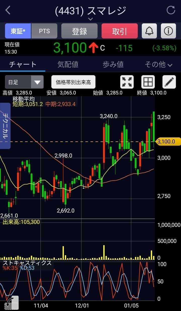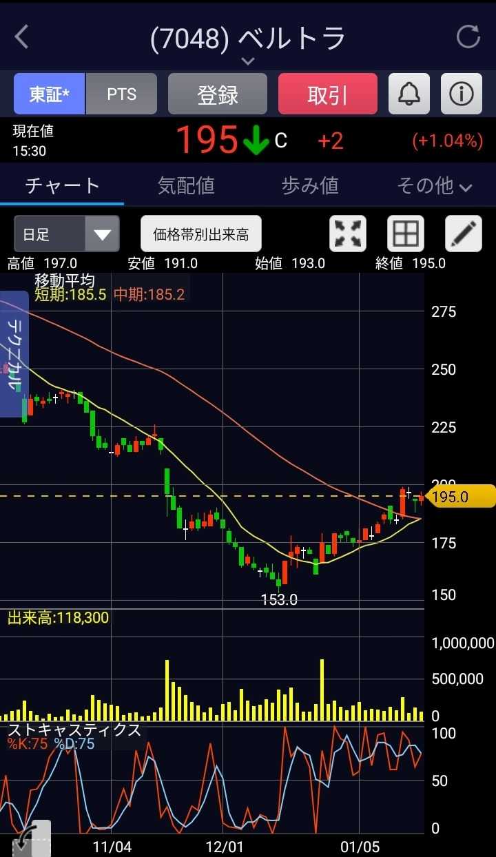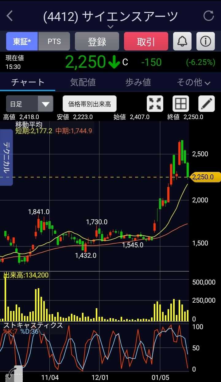 こんにちは😊 本日の投資結果どうだったですか? 僕の日本株資産は、2.84%の減少となった😵 本日は、サイエンスアーツが大幅下落、 評価額が最大の銘柄なので、資産への影響が大きい。 急上昇後には移動平均線に向かって下落するので、 まぁ慣れているとは言え、含み益が減るんだよね😂 また、本日はベルトラが上昇、 チャートのカタチが良い感じに上昇傾向になってる。 短期的には期待していないが、 中長期的には、ある程度株価は戻ると見込んでいる。 昨日から使っている光回線はやはり速く、 スマホ操作の小さなストレスが減っている気がする。 これなら、スマホでデイトレードも出来そうで、 60歳になったら、少しずつデイトレードを始め、 実益を兼ねた本格的な趣味にしようと考えている😊 それまで元気でいなくちゃね😜 さて、思い通りになるか、 人生、何があるかわからないからねー😉 本日もお読みいただきありがとうございます。 ✳✳投資は、自己責任でお願いします✳✳ ⬇サイエンスアーツが大幅下落したが仕方ないね⬇ ☆米国株の情報なら 米国株四半期速報2026年新年号 [ 亜州リサーチ株式会社 ] ☆中国株の情報なら 中国株二季報2026年春号 [ DZHフィナンシャルリサーチ ] ☆スマホ対応ドアホンなら 【レビュー特典付★スマホでドアホン】インターホン スマートドアホン ワイヤレス 工事不要 連動 録画 防犯カメラ付き 屋外 通話 暗視 玄関 wifi対応 スマホ 連動 呼び出しチャイム インターフォン バッテリー 充電式 配線不要 電源不要 賃貸 子機付き MI73(A) MI75 MJ75 ☆アセチルLカルニチンなら アセチル-Lカルニチン 500mg ベジカプセル 200粒 ナウフーズ ナウ ビタミン びたみん サプリ サプリメント アミノ酸 アセチルL-カルニチン【Now Foods Acetyl L-Carnitine 500mg, 200 Veg Capsules】 ☆有機桑茶なら 【総合1位★クーポンで2,640円】( 有機 桑茶 100包 ) 桑の葉茶 桑茶 有機JAS 送料無料 わくわく園 おいしい 桑 桑の葉オーガニック お茶 健康 対策 制限 ノンカフェイン 国産 ティーバッグ くわ 温活 桑葉 有機桑茶 ギフト