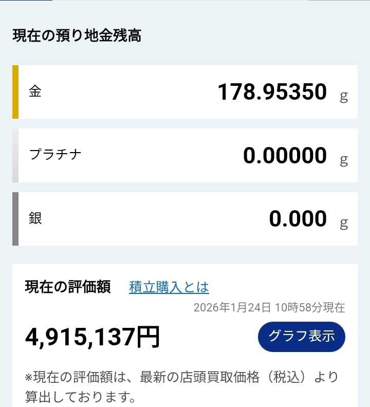 ⬇田中貴金属の毎月の積立は少額で継続している⬇ ⬇iDeCoの毎月の拠出金は5,000円に縮小している⬇ こんにちは😊 週末、いかがお過ごしでしょうか? 今日は、2人でのんびり過ごしている。 大好きな珈琲を飲みながら、くつろいでいる😜 さて、国内金価格の上昇傾向は継続、 田中貴金属の小売価格は、27,713円/gになっている。 田中貴金属の口座残高は、約491万円、 iDeCoの口座残高(ファインゴールドメイン)は、約1,000万円、 2つの口座残高を合わせると、約1,491万円で、 先週末は、約1,419万円だったので約72万円の増加だ。 もう何も言うことはないね😌 ただ、国内金価格は為替の影響を受けるので、 急激な円高になれば、評価額は減ることになるが、 需要>供給による金価格の上昇の方が、 円高になる評価額減より大きいと考えているのだ。 あと2~3年程度か、 世界情勢が激変するまでは大丈夫か😌 この流れが数年続き、僕が60歳になる頃、 現金化する時に、評価額が最大になれば嬉しいが😜 まぁ、そんなに上手くいくことは想定しないが、 世界情勢の変化を気にしながら、伴走していきたい😌 金の需要<供給となる大きな価値の転換、 供給量の急増加とか、需要の縮小傾向とか、 そんな変化があったときは、売却を急ぐだろうね😉 本日もお読みいただきありがとうございます。 ✳✳投資は、自己責任でお願いします✳✳ ☆米国株の情報なら 米国株四半期速報2026年新年号 [ 亜州リサーチ株式会社 ] ☆中国株の情報なら 中国株二季報2026年春号 [ DZHフィナンシャルリサーチ ] ☆スマホ対応ドアホンなら 【レビュー特典付★スマホでドアホン】インターホン スマートドアホン ワイヤレス 工事不要 連動 録画 防犯カメラ付き 屋外 通話 暗視 玄関 wifi対応 スマホ 連動 呼び出しチャイム インターフォン バッテリー 充電式 配線不要 電源不要 賃貸 子機付き MI73(A) MI75 MJ75 ☆アセチルLカルニチンなら アセチル-Lカルニチン 500mg ベジカプセル 200粒 ナウフーズ ナウ ビタミン びたみん サプリ サプリメント アミノ酸 アセチルL-カルニチン【Now Foods Acetyl L-Carnitine 500mg, 200 Veg Capsules】 ☆有機桑茶なら 【総合1位★ラスト5時間限定半額】( 有機 桑茶 100包 ) 桑の葉茶 桑茶 有機JAS 送料無料 わくわく園 おいしい 桑 桑の葉オーガニック お茶 健康 対策 制限 ノンカフェイン 国産 ティーバッグ くわ 温活 桑葉 有機桑茶 ギフト