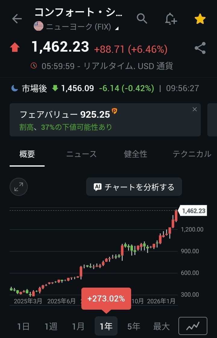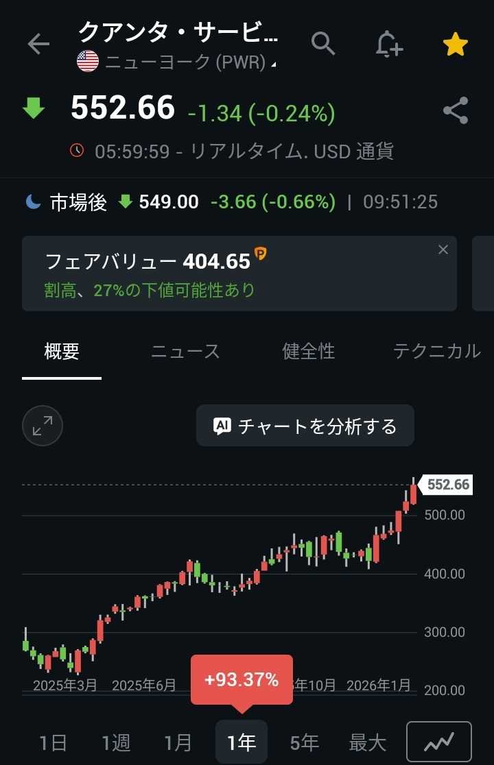 ⬇今週末のNISAの米国株の含み益は、約57万円に⬇ ⬇先週末のNISAの米国株の含み益は、約44万円だ⬇ ⬇金曜日の米国株はマチマチ。好決算でFIXが上昇⬇ こんにちは😊 週末、いかがお過ごしでしょうか? 僕は仕事を終えて、1時間程度のお昼寝💤 今ちょうど目覚めて、この記事を書き始めたところ😊 NISAの米国株の含み益は、 先週末が約44万円、今週末が約57万円となり、 円安効果もあり、含み益が約13万円増加している。 また、今週は、2銘柄の決算発表があり、 PWR(クアンタサービシーズ)とFIX(コンフォートシステムズUSA)で、 どちらも好決算だったので、株価は上昇している。 1年間の株価の推移を見てみると、 PWRは、+93.37%、FIXは、+273.02%の上昇で、 どちらも右肩上がりの美しいチャートになっている。 僕のNISAの活用法として、 米国個別株と日本個別株で攻めの投資をおこない、 リスクをとってリターンの最大化を目指している。 今まで中長期投資をしてきているので、 含み益銘柄が多く、だからリスクをとれる訳だが、 全体としては、攻めと守りの分散投資をやっている。 金(GOLD)投資で守る! →守るつもりが含み益が拡大している 債券ETF投資で守る! →守ったつもりが含み損が拡大している 暗号資産投資で攻める! →攻めた結果、やっと投資額を回収し保有継続 NISAの米国株投資で攻める! →約70万円利益確定、さらに含み益の利確を狙う 中国株、タイ株投資で攻める! →数百万円利益確定し、最後の収穫の時期へ 上手くいったもの、いかなかったものがあるが、 2005年から始めた投資を、存分に楽しめている😉 本日もお読みいただきありがとうございます。 ✳✳投資は、自己責任でお願いします✳✳ ⬇今週決算発表した2銘柄のチャートは右肩上がり⬇ ☆米国株の情報なら 米国株四半期速報2026年春号 [ 亜州リサーチ株式会社 ] ☆中国株の情報なら 中国株二季報2026年春号 [ DZHフィナンシャルリサーチ ] ☆スマホ対応ドアホンなら 【工事不要★スマホでドアホン】インターホン スマートドアホン ワイヤレス 配線不要 電源不要 連動 録画 防犯カメラ付き 屋外 通話 暗視 玄関 wifi対応 スマホ 連動 呼び出しチャイム インターフォン バッテリー 充電式 子機付き 防水 スピーカー 賃貸 MI73(A) MI75 MJ75 ☆アセチルLカルニチンなら アセチル-Lカルニチン 500mg ベジカプセル 200粒 ナウフーズ ナウ ビタミン びたみん サプリ サプリメント アミノ酸 アセチルL-カルニチン【Now Foods Acetyl L-Carnitine 500mg, 200 Veg Capsules】 ☆有機桑茶なら 【総合1位★クーポンで2,640円】( ごぼう 桑茶 100包 ) 国産 送料無料 わくわく園 ティーバッグ ゴボウ 茶 牛蒡 桑の葉 粉末 国産 鹿児島県産 食物繊維 ティーパック 粉末 イヌリン 無添加 無着色 お試し 健康茶 メガ盛り大容量
