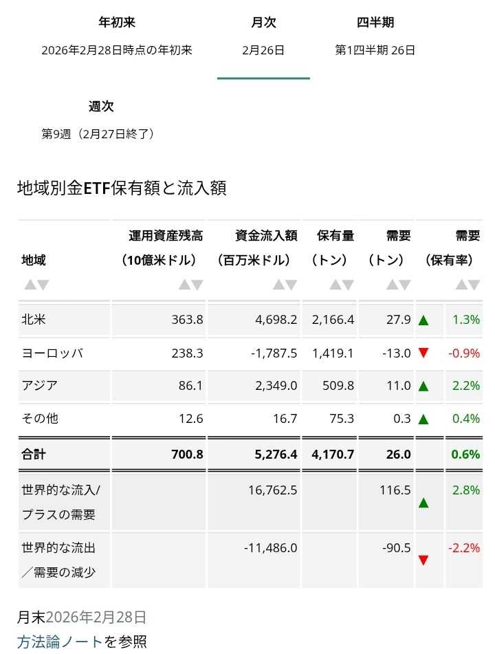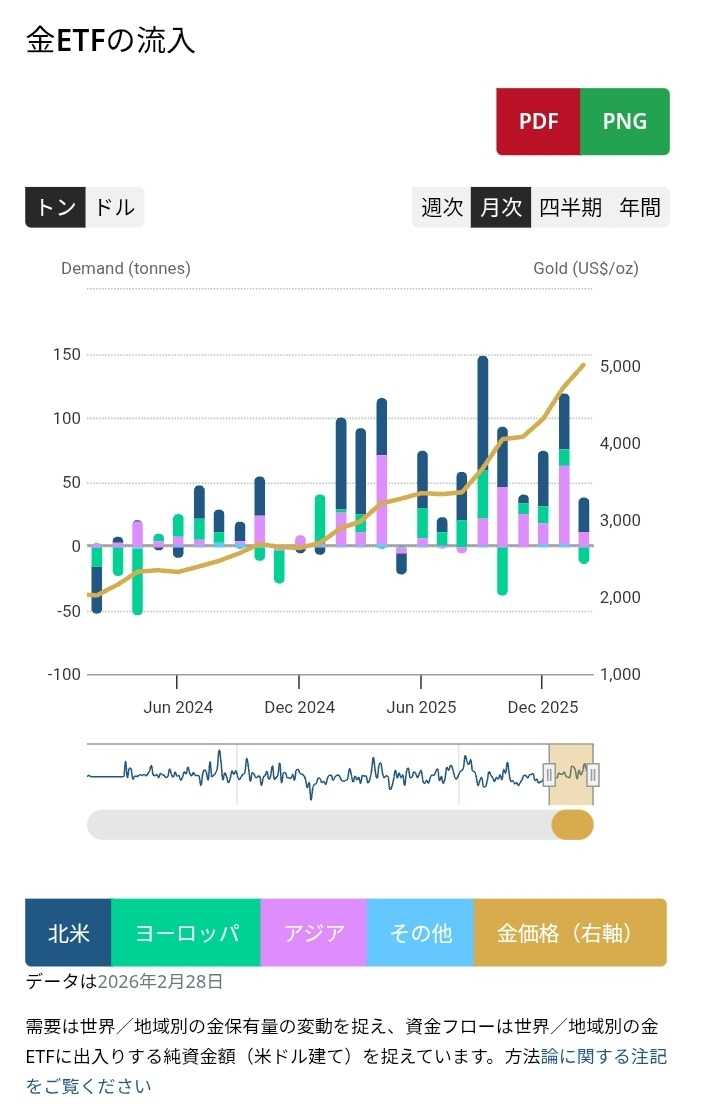 ⬇田中貴金属の金価格は、高値を維持している😊⬇ ⬇iDeCo(ファインゴールド)の口座残高は1000万円超えに⬇ こんにちは😊 週末、いかがお過ごしでしょうか? 中東情勢が気になるところだが、 今日も肉体労働をして、程良い疲労感を楽しんでる😜 さて、金関連商品の口座残高を確認すると、 田中貴金属の口座残高は、約513万円、 iDeCo(ファインゴールド)の口座残高は、約1,019万円で、 2つの口座残高を合わせると、約1,532万円になる。 先週末の口座残高は、約1,542万円だったので、 約10万円の減少だが、まぁ安定していると言える。 ワールドゴールドカウンシルの記事からすると、 金ETFの流入額は2月も増加で、9ヶ月連続だという。 地域別では、ヨーロッパのみ純流出だが、 北米、アジアの需要は引き続き堅調であるという。 中東情勢がどうなるのか、 それに伴い、世界情勢がどう変化するのか。 また、金価格の動きから世界を考察する、 数年前から金価格が数倍になったのはどうしてか。 色々と調べて考えるだけでも楽しい😌 自己責任の投資というのは、 自分で調べて考えて楽しくやれ、ということで、 おそらく投資詐欺とかに出会うことが無い、 地道にコツコツと積み重ねる自己完結活動になる。 明日は、投資のことは忘れて、 ドライブ旅のプランを考えようと思っている。 必ず行きたい場所、出来れば行きたい場所、 必ず食べたい地元飯、出来れば食べたい地元飯、 移動手段、タイムスケジュールなどを決めて、 あとは出発するだけにしておけば、楽しむだけだ😉 本日もお読みいただきありがとうございます。 ✳✳投資は、自己責任でお願いします✳✳ ⬇ワールドゴールドカウンシルの記事を一部引用⬇ ☆米国株の情報なら 米国株四半期速報2026年春号 [ 亜州リサーチ株式会社 ] ☆中国株の情報なら 中国株二季報2026年春号 [ DZHフィナンシャルリサーチ ] ☆スマホ対応ドアホンなら SS限定59%OFF【工事不要★スマホでドアホン】インターホン スマートドアホン ワイヤレス 配線不要 電源不要 連動 録画 防犯カメラ付き 屋外 通話 暗視 玄関 wifi対応 スマホ チャイム インターフォン バッテリー 充電式 子機付き 防水 スピーカー 賃貸 MI73A MI75 MJ75 ☆アセチルLカルニチンなら アセチル-Lカルニチン 500mg ベジカプセル 200粒 ナウフーズ ナウ ビタミン びたみん サプリ サプリメント アミノ酸 アセチルL-カルニチン【Now Foods Acetyl L-Carnitine 500mg, 200 Veg Capsules】 ☆有機桑茶なら 【総合1位★クーポンで半額 3月11日1:59まで】( 菊芋 桑茶 100包 ) 送料無料 菊芋 菊芋茶 桑 桑の葉 桑茶 桑の葉茶 わくわく園 国産 ティーバッグ イヌリン きくいも 茶 美味しい ティーパック 九州産 健康茶 食物繊維 ノンカフェイン 痩活 正月太り