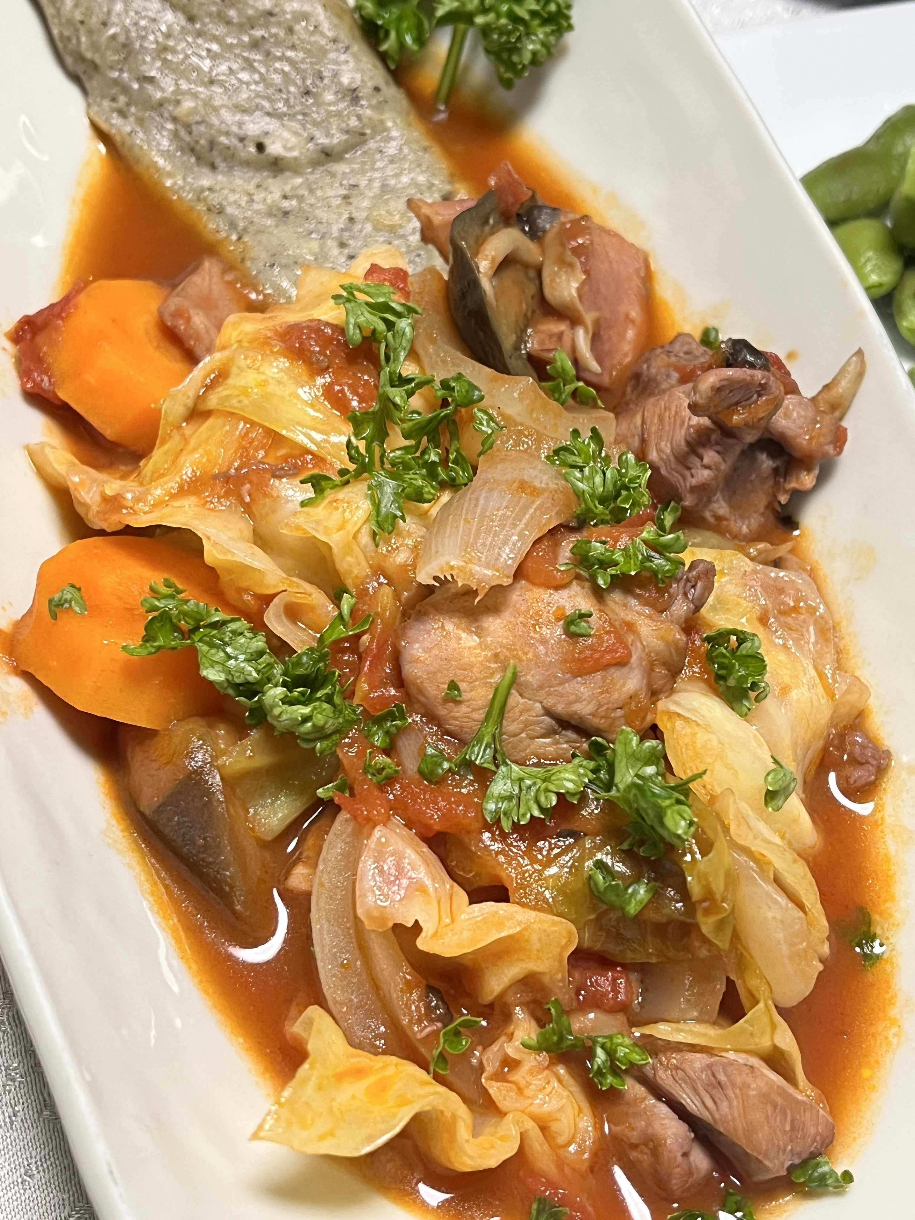 親父の晩御飯 トマトシチューパセリのせ そば粉のガレット レタスと生ハムとクリームチーズのサラダ 上杉豆 京赤地鶏のズリ 青森産黒にんにく 岡山産ピオーネ イタリア赤ワイン ピッチーニ トスカーナ ロッソ ![]() 定番のトマトシチューは 鶏肉、ベーコン、玉ねぎ、しめじ、人参、茄子、キャベツ 冷蔵庫にALMONDE 赤ワインとカットトマト缶で煮ていきました♪ スイートバジルを添えたかったのですが、お店になくて😢 仕方ないのでパセリです でもとっても美味しかったです😋😋😋 ![]() 北海道の蕎麦粉で作った ガレットもサイコー💕に美味しかったです❣️ サラダも ![]() マメも ![]() ズリも ![]() しっかりビールをいただき ![]() ワインにつなぐ😉 最後には赤ワインの中に ぶどう🍇と氷🧊を浮かべ ![]() 大人なスイーツって感じで 締めくくりました🥰 お寄りいただけたら幸いですm(__)m お気に入りの記事を「いいね!」で応援しよう