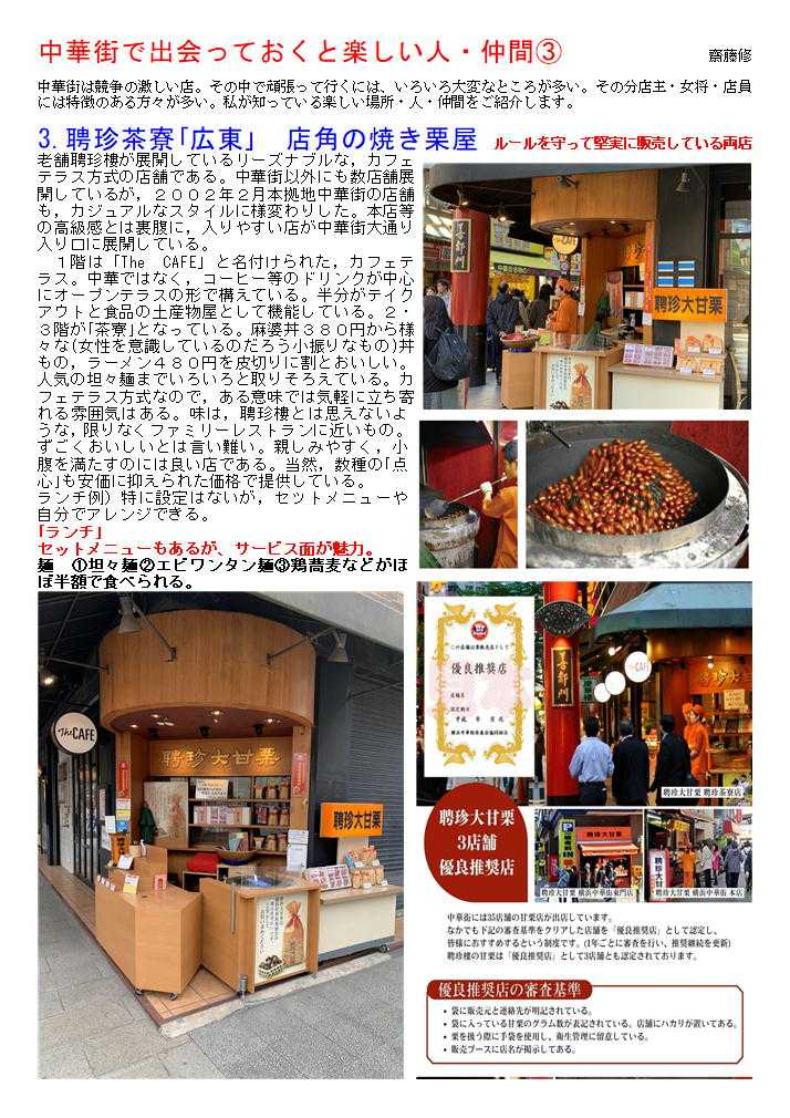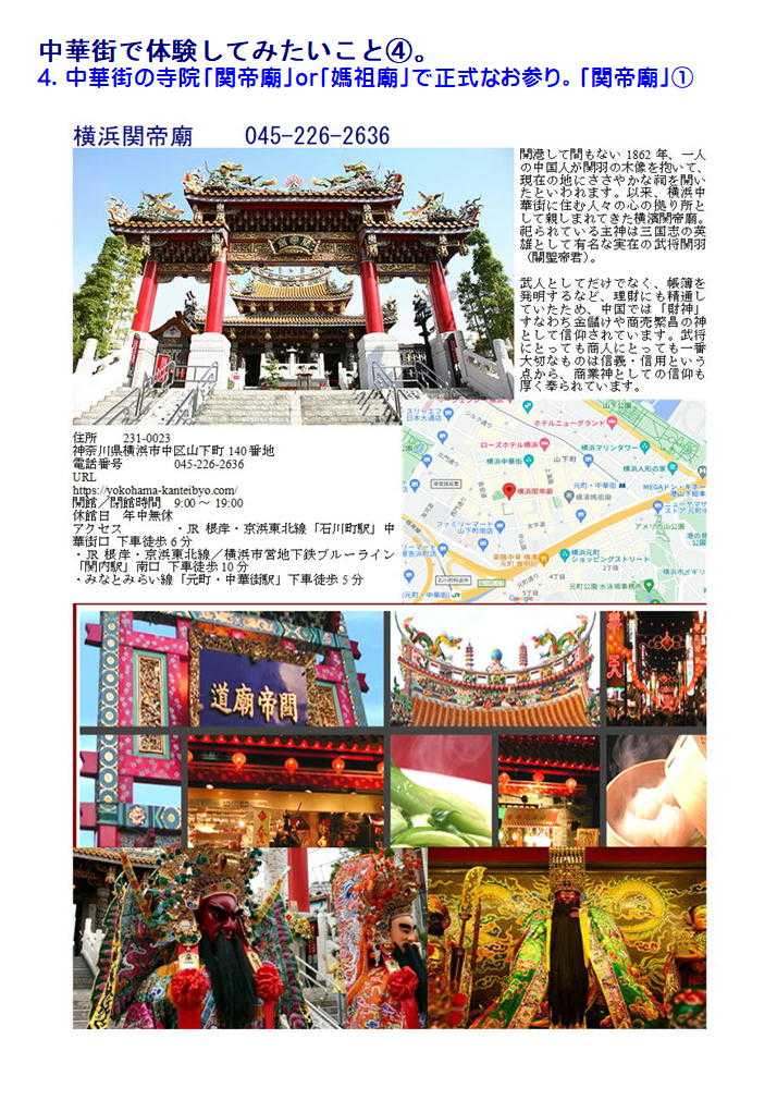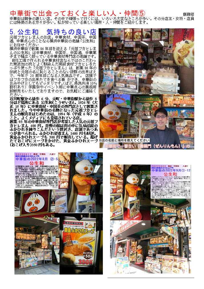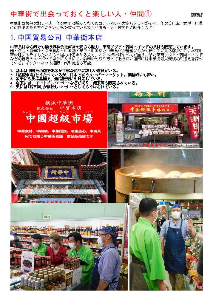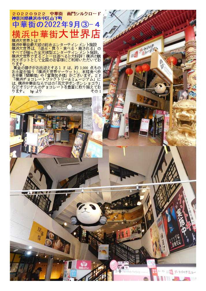 私の情報は、facebook twitter. を確認ください。「中華街を大切にする人」「ご利用する人」にはご協力をします。質問があれば、コメント欄 or sosamu@ya2.so-net.ne.jp にご連絡ください。中華街は、中華街の魅力を、最近の中華街は中年おじさんの散策part2-ご覧ください。私のもう一つの趣味山登り(過去の記録をまとめています)。山好きおじさんの部屋 もご覧ください中華街で出会っておくと楽しい人・仲間④ 齋藤修 中華街は競争の激しい店。その中で頑張って行くには、いろいろ大変なところが多い。その分店主・女将・店員には特徴のある方々が多い。私が知っている楽しい場所・人・仲間をご紹介します。 1.横浜博覧館・横浜大世界 取り仕切るコンシェルジ天江 節子 さん 非常に丁寧な方です。(そして魅力的な方) 転職されました中華街を守り、学問と商売の神様として関羽様が祀られる「横浜関帝廟」。夜はライトアップされて絢爛豪華な美しさが際立ち、ため息がでるほど。私たち中華街コンシェルジュは、「中華街にまた来たい」と思っていただけるよう、お手伝いをさせていただきたいと思っています。みなさまの中華街へのお越しを心よりお待ちしております。会える場所:3Fガーデンテラスカフェ横浜中華街コンシェルジュとは?横浜中華街の歴史や中国の食文化、イベントなど、中華街の魅力を訪れた方々に正しく伝える“街のコンシェルジュ”のこと。大きな特徴は中華街で働き、お店にいながら街をガイドしています。中華街を楽しむ人のすぐそばにいて、サポートしてくれる心強い存在です。このバッジが目印なのでお気軽にご相談ください。20130408 中華街横浜市中区山下町 横浜博覧館 この春新しい施設として登城した「横浜博覧館」。以前の安楽亭の敷地を利用した形で、大通り・中山路に入り口が設けられた。 中華街にしては珍しく、大きな吹き抜け・3階部分には、公共広場を持つ構成。その一角には「足湯(無料)」も作られました。 1階は売店(土産物店)、2階は「ベピースター」のアンテナショップ。3街は「インフォメーションセンター」「軽食喫茶」も入った施設。休憩説のない休暇街には福音の建物かもしれない。3街のテラス席は、オープンテラス部分は自由に使って良いとのこと。利用しておきたい。 20190607 中華街 商店街神奈川県横浜市中区山下町 横浜博覧館「買」、「楽」、「愉」をテーマにした ショッピングセンター1階には横浜みやげのセレクトショップ「横浜博覧館マーケット」と本格中華の味を食べ歩きや持ち帰りもできる「開華楼」、2階には日本で唯一の「ベビースターランド」があり、ベビースターラーメンができあがる様子を見ることができます。3階では足湯が併設された緑あふれる「ガーデンテラスカフェ」で一息つきながらタピオカミルクティーやスイーツを手軽に楽しめます。住所 横浜市中区山下町145【大通り】電話番号 45-640-0081営業時間 9:00 ~ 21:30土日祝日は9:30 ~ 22:00 フロアにより異なる 定休日年中無休 2017年11月30日(水)メインMC 南原清隆、水卜麻美(日テレアナウンサー) その1 「ヒルナンデス!」①「マニアと街歩き~中華街~」中華街マニアがタレントを引き連れ、中華街の有名スポットからあまり知られていない。マニアックなお店を巡るという企画。中華街を巡る。マニアを中華街を案内する企画。極上グルメ。だけじゃない今までにない中磯野貴理子華街の楽しみ方メンバー 佐藤栞里、ノブ(千鳥)、磯野貴理子さん20220922 中華街 南門シルクロード神奈川県横浜市中区山下町中華街の2022年9月③-4横浜中華街大世界店横浜大世界とは?横浜中華街最大級の総合エンターテインメント施設横浜大世界は、「遊ぶ・買う・食べる・癒される」のすべてが揃った全天候型エンターテインメント施設。横浜大世界でまるごと一日遊べると大好評!横浜の観光スポットとして全国のお客様にご利用いただいております。 黄金の獅子がお出迎えする1Fは、約3,000点ものお土産が揃う「横浜大世界マーケット」、本格食べ歩き中華「開華楼」や「富貴包子楼」がございます。2F「横浜チョコレートファクトリー&ミュージアム」には、横浜中華街ならではの「花文字ボンボンショコラ」などオリジナルのチョコレートを豊富に取り揃えております。20220922 横浜横浜市中区山下町 土曜はナニする横浜大世界変身写真館 横濱中華街を案内することが多くなった昨今。今日は関西テレビを主とする番組から出演依頼があり、ロケ同伴しました。演者は、なんとデビ夫人。すえひろがりさんというお笑いの方。お二人が執事として同伴。進行役もして頂いたので、私の仕事は非常に軽減されました。夫人も非常に気を遣う方で、番組の主旨に合わせ辛口の発言をするのですが、ご自身でも柔らかく補正、ロケではすえひろがりさんの見事なリカバリーが連発、同行した私も十分楽しませて頂きました。 ロケの成功は、演者も大切ですが、中華街の皆様、とりわけロケを協力してくださる店舗関者の力が大