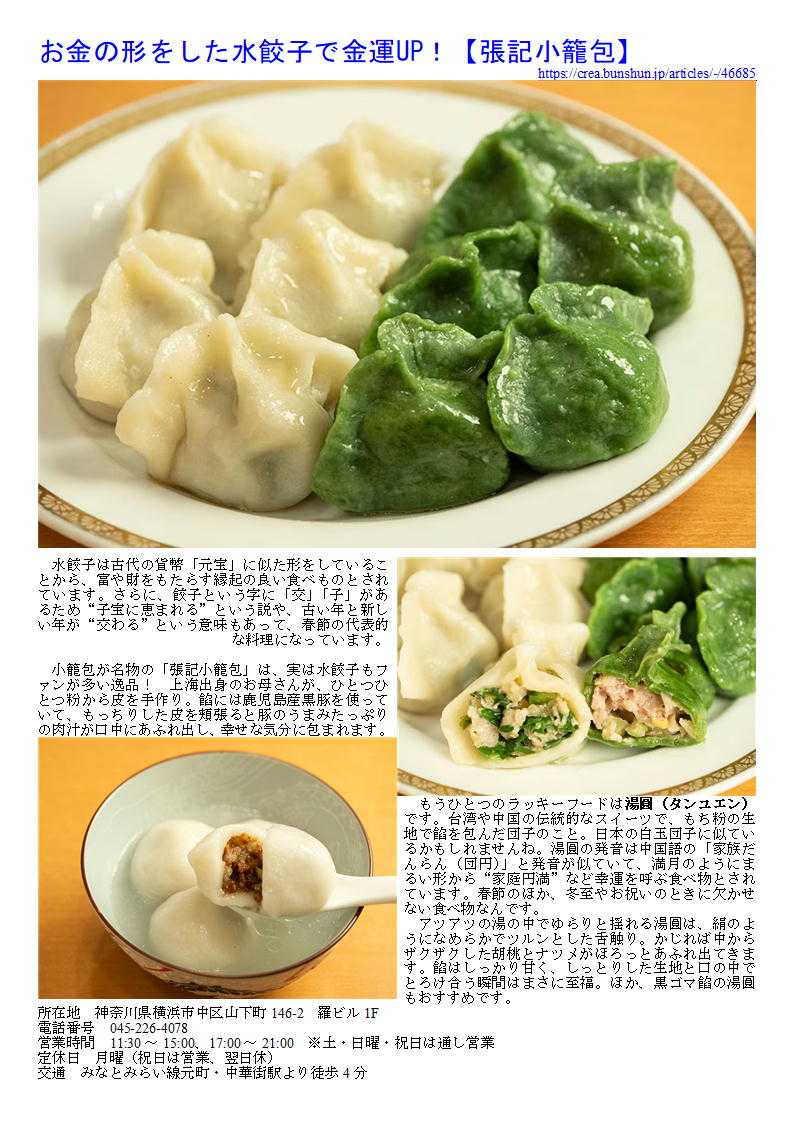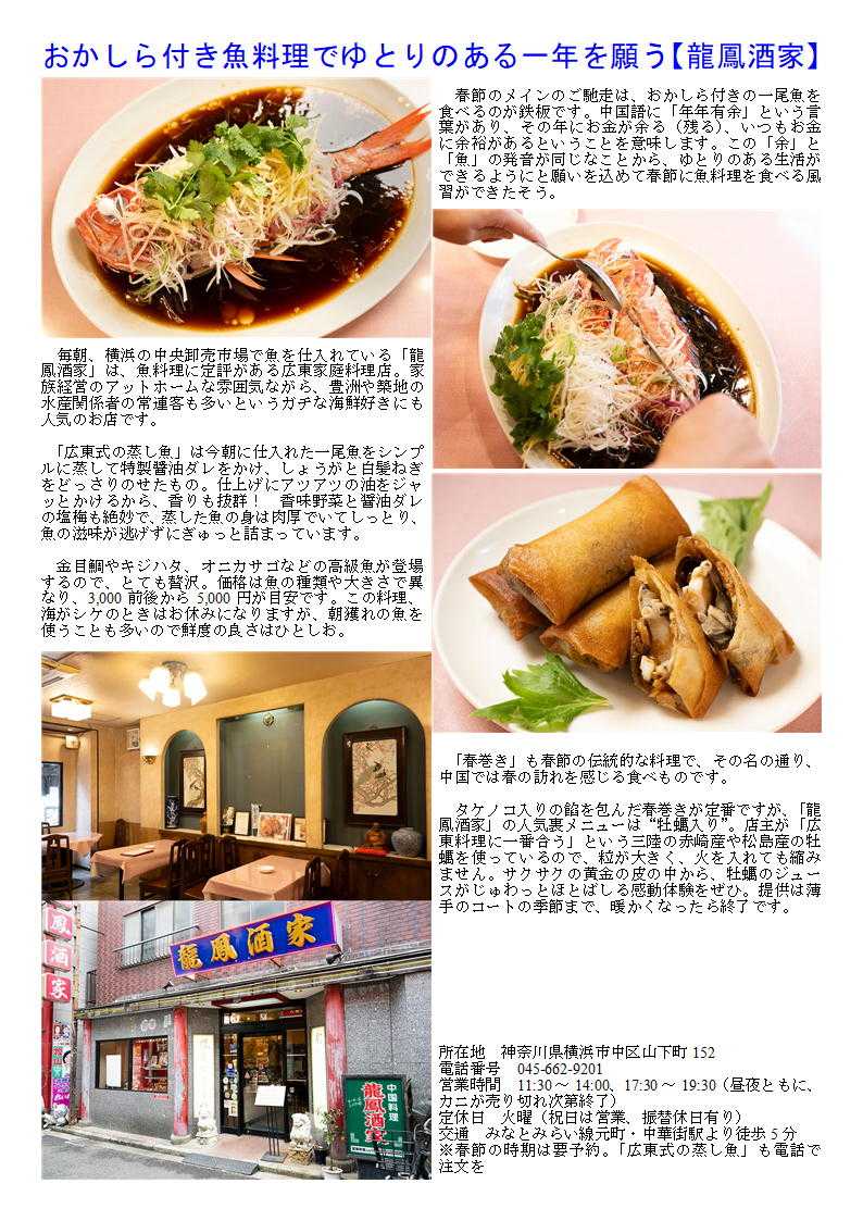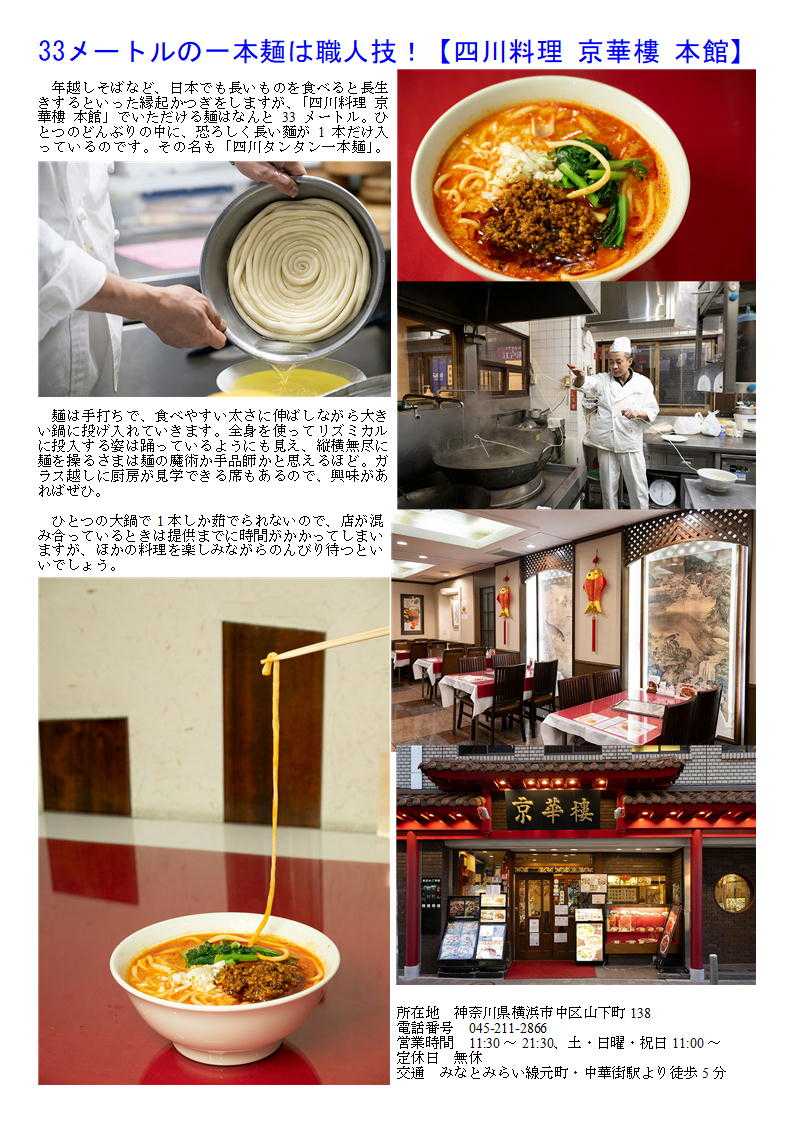 私の情報は、facebook twitter. を確認ください。「中華街を大切にする人」「ご利用する人」にはご協力をします。中華街の魅力は楽天ブログに今後移行していく予定です。https://plaza.rakuten.co.jp/sosamu02d/データーはライブドアーブログに掲載します。「中華街の魅力」https://sosamu02dhide.livedoor.blog/質問があれば、コメント欄 or sosamu@ya2.so-net.ne.jp にご連絡ください。中華街は、中華街の魅力を、最近の中華街は中年おじさんの散策part2-ご覧ください。私のもう一つの趣味、山登り(過去の記録をまとめています)。山好きおじさんの部屋 もご覧くだい旧正月の食文化 http://www.yakuzenro.jp/room/jijyo/kyu_shougatu.htm金運UPに家内安全、昇進運も! 横浜中華街で楽しむ 春節のラッキーフード【7選】33メートルの一本麺は職人技!【四川料理 京華樓 本館】 年越しそばなど、日本でも長いものを食べると長生きするといった縁起かつぎをしますが、「四川料理 京華樓 本館」でいただける麺はなんと33メートル。ひとつのどんぶりの中に、恐ろしく長い麵が1本だけ入っているのです。その名も「四川タンタン一本麺」。 麺は手打ちで、食べやすい太さに伸ばしながら大きい鍋に投げ入れていきます。全身を使ってリズミカルに投入する姿は踊っているようにも見え、縦横無尽に麺を操るさまは麺の魔術か手品師かと思えるほど。ガラス越しに厨房が見学できる席もあるので、興味があればぜひ。 ひとつの大鍋で1本しか茹でられないので、店が混み合っているときは提供までに時間がかかってしまいますが、ほかの料理を楽しみながらのんびり待つといいでしょう。 所在地 神奈川県横浜市中区山下町138電話番号 045-211-2866営業時間 11:30~21:30、土・日曜・祝日11:00~定休日 無休交通 みなとみらい線元町・中華街駅より徒歩5分気の置けない仲間と集まる中華街 日曜日午後 四川料理を 5人程度 予算4,500円程度で考えたい㉜。 最近中華街の店舗も○○料理として明快に打ち出す店舗が少なくなってきている。したがって店の紹介(hp)等でも中国料理、数社の料理を提供するような表示が多い。でも食べてみればそこに所属する調理人の手腕は修行した場所、育った場所が軽快にでで来るので楽しみである。 こういう希望の場合、やはりどのような人たちが集まる物かと想定するが、料理のみの想定が5000円程度なので落ち着いた大奮行きも望んでおり、5人であるから可能であれば円卓が望ましく、個室(日曜日なので多少難しい場合がある「無料?」)に近い状態を望んでいると思って答えてみます。 各種ホームページからも引用。 32.四川料理といえば、四川特産の花山椒の痺れ「京華楼大通り店」 横浜中華街の本場の四川料理専門店 本場四川省出身のシェフが本場四川の香辛料をふんだんに使用し、作り上げる料理は麻と辣のバランスが絶妙でどれも絶品!平日ランチ、セット、コースメニュー豊富。ハーフメニュー、お一人様コース。個室有り。各種ご宴会承ります!気の置けない仲間と集まる中華街 日曜日午後 四川料理を 5人程度 予算4,500円程度で考えたい⑨。 最近中華街の店舗も○○料理として明快に打ち出す店舗が少なくなってきている。したがって店の紹介(hp)等でも中国料理、数社の料理を提供するような表示が多い。でも食べてみればそこに所属する調理人の手腕は修行した場所、育った場所が軽快にでで来るので楽しみである。 こういう希望の場合、やはりどのような人たちが集まる物かと想定するが、料理のみの想定が5000円程度なので落ち着いた大奮行きも望んでおり、5人であるから可能であれば円卓が望ましく、個室(日曜日なので多少難しい場合がある「無料?」)に近い状態を望んでいると思って答えてみます。 各種ホームページからも引用。 9.四川料理といえば、四川特産の花山椒の痺れ「京華楼」(本館・お通り店) 本場の四川麻婆豆腐は京華樓こだわりの看板メニューですが、麻婆豆腐以外にも様々な麻辣料理をご提供しております。また、四川料理=激辛 のイメージがありますが、本館では特に、爽やかな痺れ(麻風味)が楽しめる青花山椒をふんだんに使用した特選料理にも力を入れ ています。 豊富なコースメニューもご用意しておりますが、お客様のご予算に合わせてコースを組むことも可能です。1部屋最小5名様から、ワンフロア最大60名様までご案内可能でございます。また、カウンター席もございますのでお一人様からご家族連れやお仲間・会社のご宴会までお気軽にご利用ください! (TEL: 045-211-2866 代表)