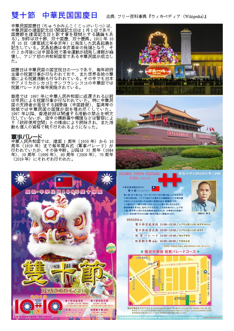 私の情報は、facebook twitter. を確認ください。「中華街を大切にする人」「ご利用する人」にはご協力をします。 質問があれば、コメント欄 or sosamu@ya2.so-net.ne.jp にご連絡ください。 中華街は、中華街の魅力を、最近の中華街は中年おじさんの散策part2-ご覧ください。 私のもう一つの趣味、山登り(過去の記録をまとめています)。山好きおじさんの部屋 もご覧ください 十の文字が二つ重なる日に行われる、中華民国建国をお祝いするお祭り。中華街の各所でイベントを実施。 10月10日、横浜中華街で「雙十節(そうじゅうせつ)」の祝賀イベントが開催されます。 民族芸能演技、祝賀パレード、祝賀獅子舞(採青)など、華やかでエキサイティングなイベントが盛りだくさんです。秋本番を迎えた中華街で、異国情緒あふれるお祭りを満喫してください。 ![]() 雙十節 中華民国国慶日 出典: フリー百科事典『ウィキペディア(Wikipedia)』 中華民国国慶日(ちゅうかみんこくこっけいじつ)は、中華民国の建国記念日(開国記念日は1月1日であり、国慶節を建国記念日と訳す事を疑問とする議論もある)。別称は双十節、双十国慶、双十慶典。1911年10月10日(清宣統三年辛亥年)に発生した武昌起義を記念している。武昌起義は辛亥革命の発端となり、その2か月後には中国各地で革命運動が続発し清朝が崩壊し、アジア初の共和制国家である中華民国が成立した。 国慶日は中華民国の国定祝日の一つであり、毎年政府主催の祝賀行事が行なわれており、また世界各地の華僑による祝賀活動も行なわれている。その中でも日本やアメリカのシカゴとサンフランシスコの中華街では祝賀パレードが毎年実施されている。 香港では1997年に中華人民共和国に返還される以前は市民による祝賀行事が行なわれていた。特に中華民国の支持者が居住する調景嶺(中国語版)、荃湾等の地域では中華民国の国旗が街を埋め尽くしていた。1997年以降、香港政府は関連する活動の禁止を明文化していないが、街中の横断幕や幟旗などは警察により「政府使用空間」との理由により排除され、また活動も個人の資格で執り行われるようになった。 軍事パレード 中華人民共和国では、建国1周年(1950年)から10周年(1959年)まで毎年閲兵式(軍事パレード)が行われていたが、その後中断。以降は35周年(1984年)、50周年(1999年)、60周年(2009年)、70周年(2019年)にそれぞれ行われた。