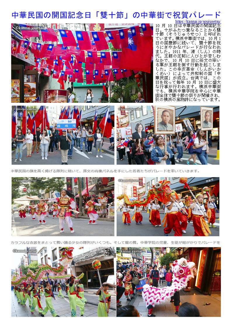 雙十節 中華民国国慶日 出典: フリー百科事典『ウィキペディア(Wikipedia)』 https://ameblo.jp/majo-cats/entry-12768894285.html ![]() ![]() 中華民国の開国記念日「雙十節」の中華街で祝賀パレード https://kannai.jp/soujusetsu/ 10月10日は中華民国の開国記念日。十がふたつ重なることから雙十節(そうじゅうせつ)と呼ばれています。横浜中華街では、10月1日の国慶節に続いて、雙十節を祝うにぎやかなパレードが行なわれました。1911年、清(しん)の時代。王朝の圧制に人びとが苦しむなかで、10月10日に孫文の率いる軍が王朝を倒す行動を起こしました。この辛亥革命(しんがいかくめい)によって共和制の国「中華民国」が成立。台湾では、この日を祝って毎年10月10日に盛大な行事が行われます。横浜中華街でも、横浜中華学院を中心に中華街全体で雙十節の祭りが開催され、秋の横浜の風物詩になっています。