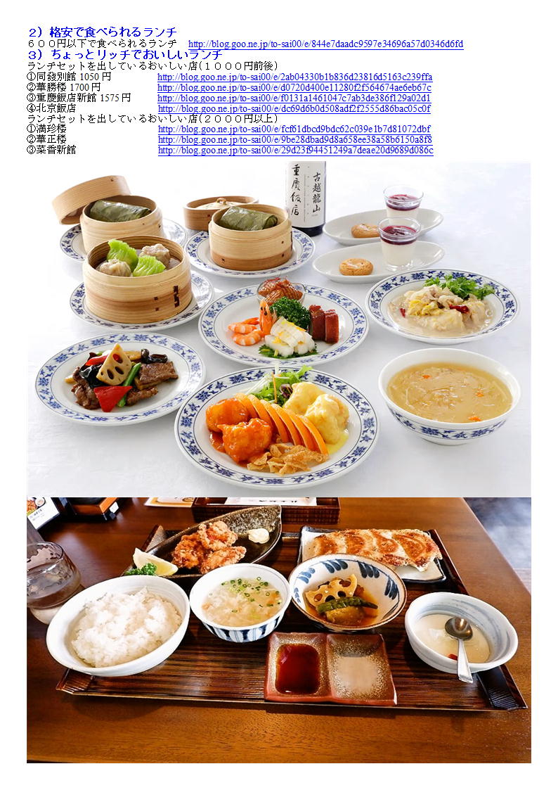 3)ちょっとリッチでおいしいランチ ランチセットを出しているおいしい店(1000円前後) ①同發別館1050円 http://blog.goo.ne.jp/to-sai00/e/2ab04330b1b836d23816d5163c239ffa ②華勝楼1700円 http://blog.goo.ne.jp/to-sai00/e/d0720d400e11280f2f564674ae6eb67c ③重慶飯店新館1575円 http://blog.goo.ne.jp/to-sai00/e/f0131a1461047c7ab3de386f129a02d1 ④北京飯店 http://blog.goo.ne.jp/to-sai00/e/dc69d6b0d508adf2f2555d86bac05c0f ランチセットを出しているおいしい店(2000円以上) ①満珍楼 http://blog.goo.ne.jp/to-sai00/e/fcf61dbcd9bdc62c039e1b7d81072dbf ②華正楼 http://blog.goo.ne.jp/to-sai00/e/9be28dbad9d8a658ee38a58b6150a8f8 ③菜香新館 http://blog.goo.ne.jp/to-sai00/e/29d23f94451249a7deae20d9689d086c