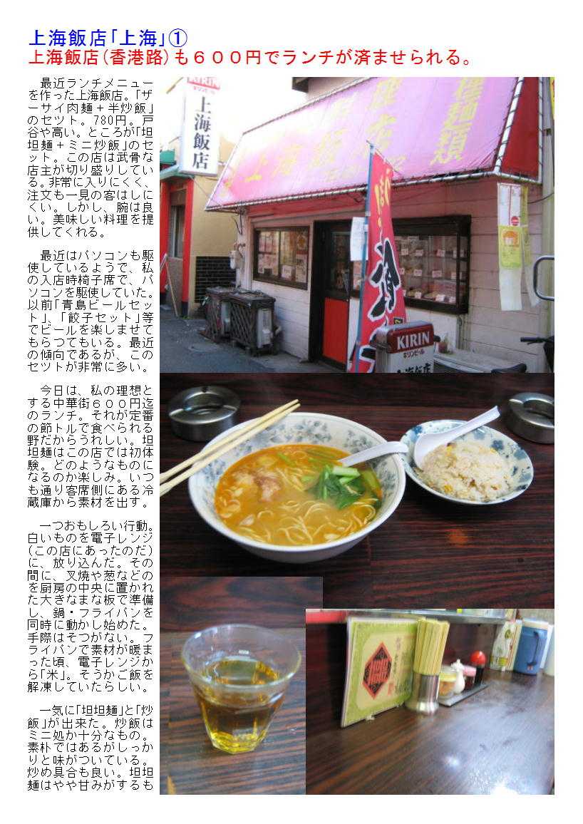 1階が,カウンター5席,椅子4席程度の非常に小さな店である。切り盛りしているしているのも,偏屈そうな親父である。入りにくい感はあるが,規模が小さいだけに座るとすぐに調理した料理が出てくる。加えて女性の従業員が1人,忙しそうに動いている。2階席が10人程度入れるようであるが,ランチタイムもこんでいると使用している。ダムウェーターなどはなく,女性が料理を忙しく運んでいる。 どれを頼んでもそれぞれおいしい。「パイコウ飯」が揚げたて,作りたての上げ蓋肉をからりとした状態で提供してくれる。オープン型のキッチンが間近に迫っているので,怖そうな親父がどのように作るかをすべて確認できる。作る課程が見られる店も少ないので,料理好きには向いている。 コースも3000円程度からあるが、メニューには何が出てくるのか価格しか示されていない。まさしくお任せである。責任をもっておいしいものを作ってくれるので、10人程度集まったら是非一度楽しんでみてほしい。 ランチ例)特にランチメニューないが,「パイコー飯」がお勧め。 最近(2003春)から,980円でセットメニューが出始めた。チャーハンとラーメン,青島ビールなどがセットされたものであるが,数種用意されている。この頑固そうな店がと思うが,うれしいことである。 上海飯店「上海」① 上海飯店(香港路)も600円でランチが済ませられる。