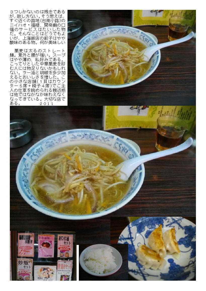 もう少し具が多いほうがいいのかなと言うのが印象。ご飯は添え物の小ライス。続いて丁寧に焼かれた餃子。3つしかないのは残念であるが、致し方ない。そう思えば、すぐ近くの路地(台南小路)のニイハオ・福楼、関帝廟の口福のサービスはたいした物だ。そんなことはどうでもよいが、上海飯店の餃子はやや酸味のある物。何か美味しい