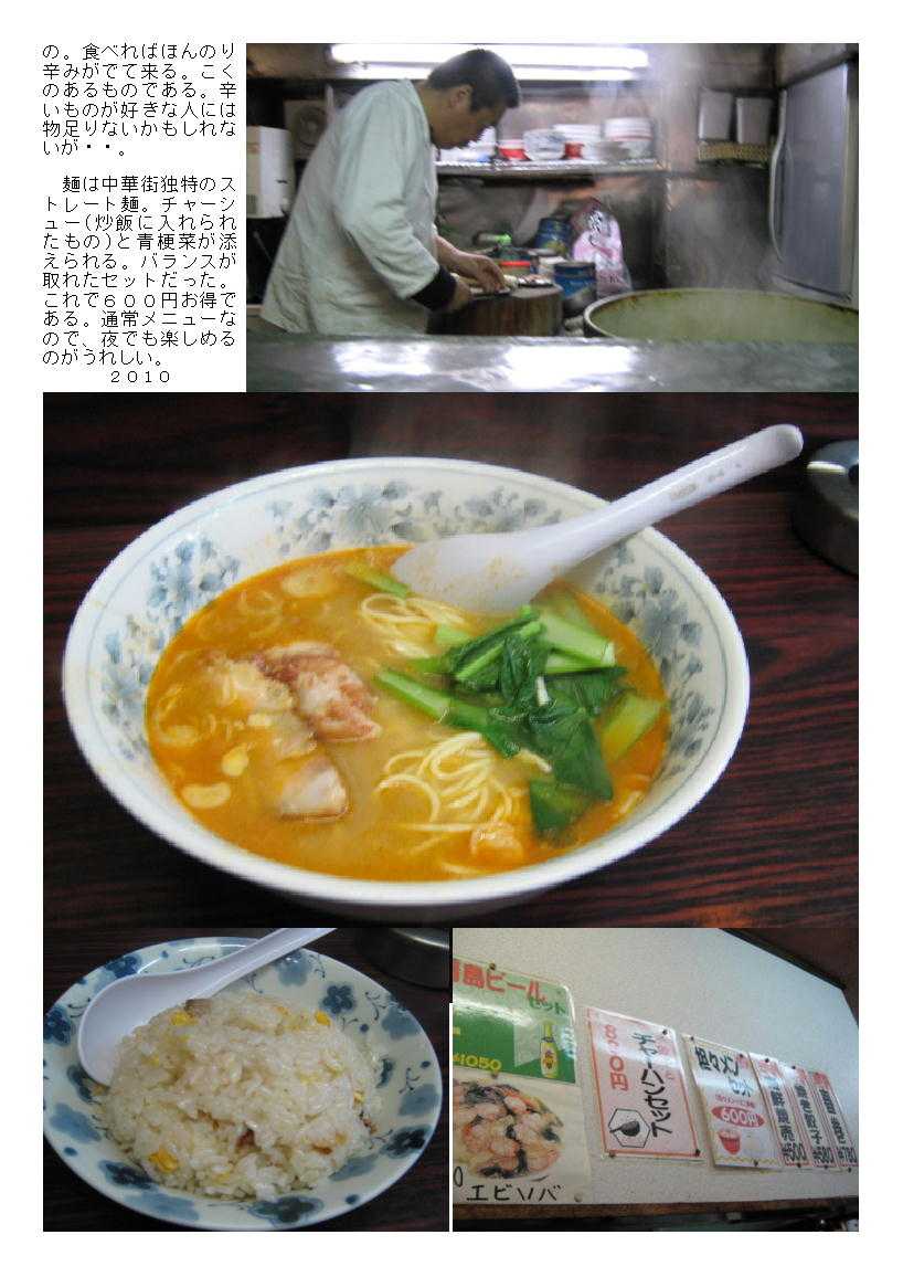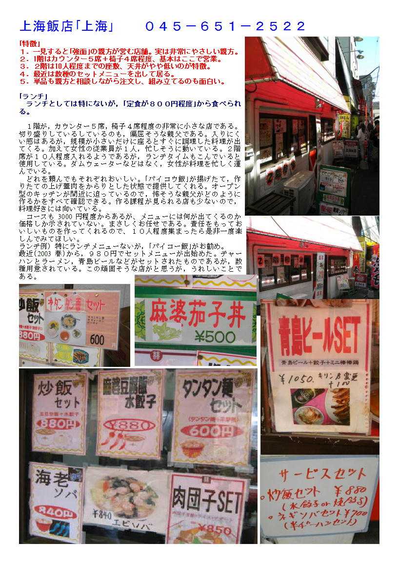 15.上海飯店 家僕なご主人ほとんど何もしゃべらない 「ランチ」 最近はセツトメニューが提供される ランチとしては特にないが,「定食が800円程度」から食べられる。 1階が,カウンター5席,椅子4席程度の非常に小さな店である。切り盛りしているしているのも,偏屈そうな親父である。入りにくい感はあるが,規模が小さいだけに座るとすぐに調理した料理が出てくる。加えて女性の従業員が1人,忙しそうに動いている。2階席が10人程度入れるようであるが,ランチタイムもこんでいると使用している。ダムウェーターなどはなく,女性が料理を忙しく運んでいる。 どれを頼んでもそれぞれおいしい。「パイコウ飯」が揚げたて,作りたての上げ蓋肉をからりとした状態で提供してくれる。オープン型のキッチンが間近に迫っているので,怖そうな親父がどのように作るかをすべて確認できる。作る課程が見られる店も少ないので,料理好きには向いている。 コースも3000円程度からあるが、メニューには何が出てくるのか価格しか示されていない。まさしくお任せである。責任をもっておいしいものを作ってくれるので、10人程度集まったら是非一度楽しんでみてほしい。 ランチ例)特にランチメニューないが,「パイコー飯」がお勧め。 最近(2003春)から,980円でセットメニューが出始めた。チャーハンとラーメン,青島ビールなどがセットされたものであるが,数種用意されている。この頑固そうな店がと思うが,うれしいことである。 「特徴」 1.一見すると「強面」の親方が営む店舗。実は非常にやさしい親方。 2.1階はカウンター5席+椅子4席程度、基本はここで営業。 3.2階は10人程度までの座敷、天井がやや低いのが特徴。 4.最近は数種のセットメニューを出して居る。 5.単品も親方と相談しながら注文し、組み立てるのも面白い