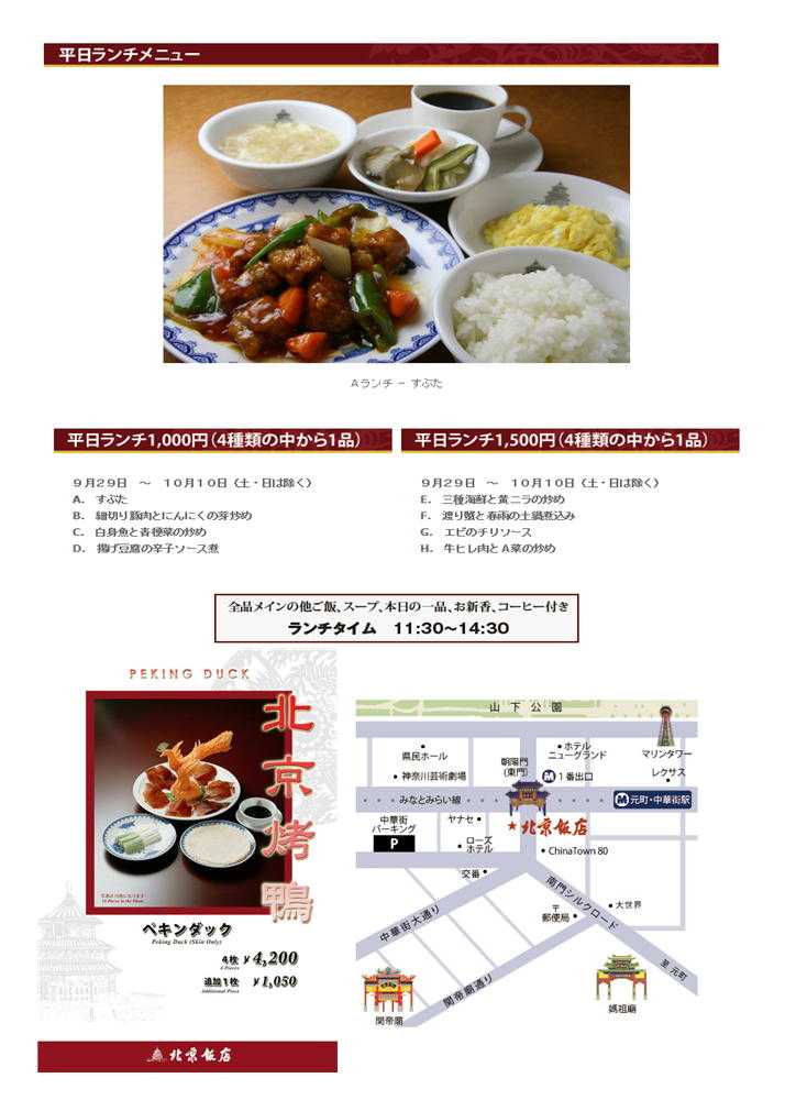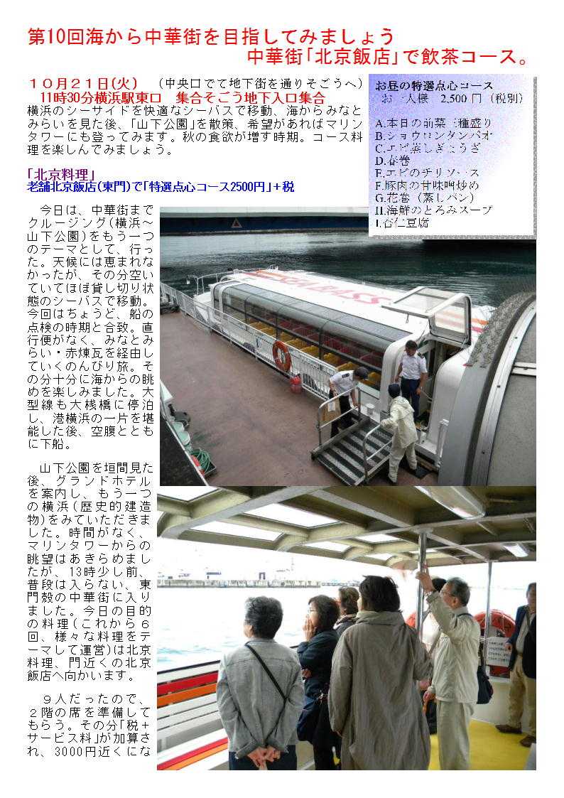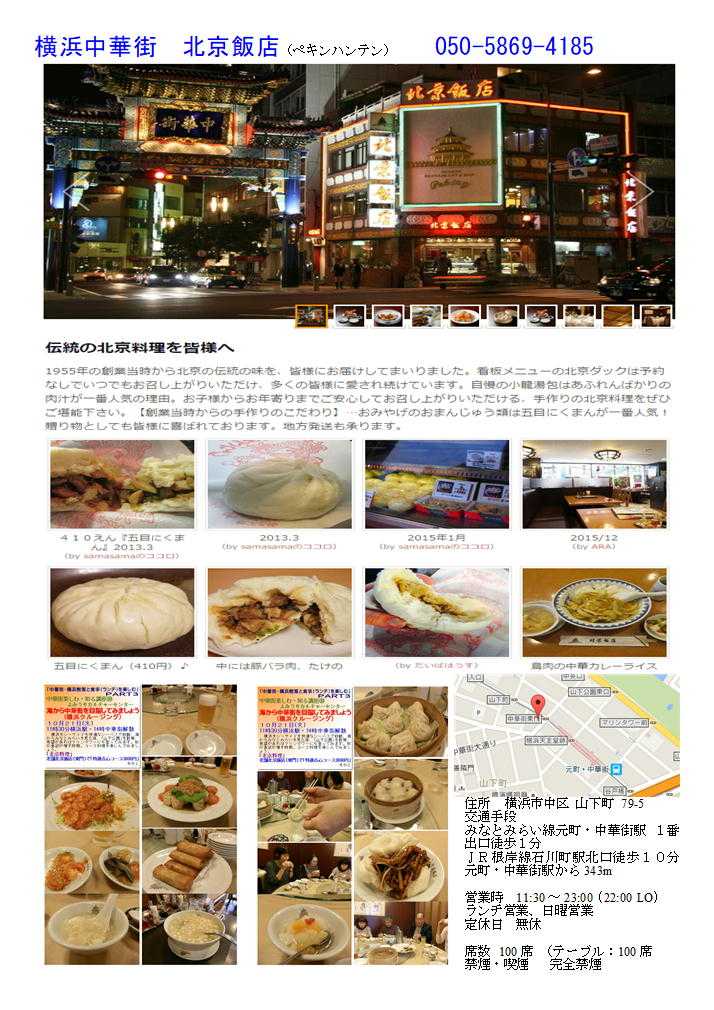 10月21日(火) (中央口でて地下街を通りそごうへ) 11時30分横浜駅東口 集合そごう地下入口集合 横浜のシーサイドを快適なシーバスで移動、海からみなとみらいを見た後、「山下公園」を散策、希望があればマリンタワーにも登ってみます。秋の食欲が増す時期。コース料理を楽しんでみましょう。 「北京料理」 老舗北京飯店(東門)で「特選点心コース2500円」+税 クルージング(横浜~山下公園)をもう一つのテーマとして、行った。天候には恵まれなかったが、その分空いていてほぼ貸し切り状態のシーバスで移動。今回はちょうど、船の点検の時期と合致。直行便がなく、みなとみらい・赤煉瓦を経由していくのんびり旅。その分十分に海からの眺めを楽しみました。大型線も大桟橋に停泊し、港横浜の一片を堪能した後、空腹とともに下船。 山下公園を垣間見た後、グランドホテルを案内し、もう一つの横浜(歴史的建造物)をみていただきました。時間がなく、マリンタワーからの眺望はあきらめましたが、13時少し前、普段は入らない、東門殻の中華街に入りました。今日の目的の料理(これから6回、様々な料理をテーマして運営)は北京料理、門近くの北京飯店へ向かいます。 9人だったので、2階の席を準備してもらう。その分「税+サービス料」が加算され、3000円近くになる。まあこれくらいはしょうがないのかもしれないが、ランチタイムぐらいは、たいしたサービスもしないのだから「サービス料」は不要であろう。中華街でも大型店舗は、サービス料(席料といってとる場合もある)を加算されるので、予約の時十分に確認しておく必要がある。 さて一同、席に着きつく。今日は多少旅行気分。そのせいかビールが美味しい。今日はあまり飲む人が少ないのか、頼む人が少ない。それぞれの飲み物で、乾杯。まずは①本日の前菜三種盛り。「クラゲ」「野菜の巻物」「煮物のなす」。トマトが添えられ中ソースで味付けされていた。なかなか美味しい。 続いて②エビのチリソース。なかなかの大海老。食べ応えがある。仲間で完全に火が通っていないくらい新鮮な物。甘い味海老とチリソースが合う。順番が、どうか多少疑問であるが、③春巻きが登場。だいぶ参加者も食べ方に慣れてきたので、それぞれが順番に取り分ける。 当然、揚げたて。熱々である。中身も充実していて美味しい。取り皿もそれぞれの料理で提供されるので、ありがたい。当たり前であるが最近、取り皿だけでもなかなか準備してくれない店も多々ある。遠慮なく、申し出るべきである。 ④海鮮のとろみスープ。今日は、豆腐が小さく刻まれた、白炭スープ。北京料理らしく、こくのあるもの。料も多い、とりわけても半分ほど残る量。ちょうど中休みともなる。小さなさらに、葱とたれ、レンゲが出された。やつと北京飯店の得意料理、⑤ショウロンタンパオが出された。たっぷりと汁が入った小籠包。さすがに美味しい。葱がよく合う。 蒸し物が続く、⑥エビ蒸しぎょうざと続いた。薄い皮で蒸された餃子は、中が透けて見えている。食欲を増進する餃子。蒸し餃子専用の皮であろう。それぞれ、サービスの女性に食べ方を伝授してもらいながら、堪能させていただいた。 最後は、⑦豚肉の甘味噌炒め。さすが点心コース。蒸しパンに破産で食べる方式である。こちらも私の物で、食べ方の見本を示してもらう。なかなか饅頭の中に収まらない方もいたが、それも一興。楽しみ・思い出の一つとなったと思う。こってりとした味付けは、なかなか濃厚。 点心関係でのランチコースは初めて、やはり北京飯店で良かったと思う。最後は定番の、彩りのある杏仁豆腐。やや甘めだったが、そこいらも女性の参加者が多いので良かったのかもしれない。 ![]() ![]() ![]() ![]() ![]() 「特徴」 1.日本に北京ダックを持ち込んだ老舗。その名も「北京飯店」。 2.本町通り側に点心を作る場所があり、非常に気の良い職人たちが点心を作っている。 3.点心、特に小籠包が人気。来店した客は必ず食べると言う。 4.ランチはやや高めであるが、2品を楽しめるので非常にお奨め。 5.老舗の大型店舗。非常に安心できる店舗ある。 「ランチ」 1000円(料理一品+副菜「料理」2品+スープ+香の物「ザーサイ・酢漬け大根」+コーヒー)+おしぼり 大型店のランチの魅力のなさに多少食傷気味になっていたので,あまり期待せず入店してみた。1000円を超えるランチはどうも一人では入りにくい。つきあってくれる人がいる場合に入店することが多い。最初はなかなか良い店が多かったが,「これがこの値段」と思われる店が続き,つきあってもらう方にも悪いような事が続いていた。いつもは空いている店内もどういう訳は今日は満席。危なく待たされそうになるが,てきぱきと動く店員に誘導され,奥の落ち着いた背派に座ることができた。 最初ランチメニューを見てびっくり。1500円の品が4品。「店頭の表示と違うではないか」と問いただすと,片言の日本語と身振りで裏返せという。確かに100