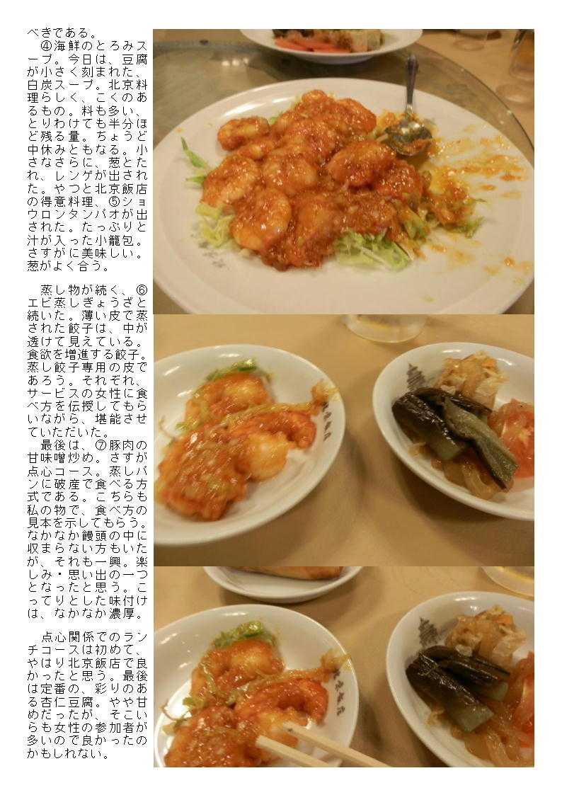 16.北京飯店 店主ではないが愛想の良い職人 大型店のランチの魅力のなさに多少食傷気味になっていたので,あまり期待せず入店してみた。1000円を超えるランチはどうも一人では入りにくい。つきあってくれる人がいる場合に入店することが多い。最初はなかなか良い店が多かったが,「これがこの値段」と思われる店が続き,つきあってもらう方にも悪いような事が続いていた。いつもは空いている店内もどういう訳は今日は満席。危なく待たされそうになるが,てきぱきと動く店員に誘導され,奥の落ち着いた背派に座ることができた。 最初ランチメニューを見てびっくり。1500円の品が4品。「店頭の表示と違うではないか」と問いただすと,片言の日本語と身振りで裏返せという。確かに1000円のメニューが4品あった。一安心。北京料理・季節感ということを考え「蠣の中国風オムレツ(中国名で難しい名前が付いていた)」を頼んでみた。香の物・おしぼり・箸がだされ,お茶を飲みながら待つ。混んでいるせいもあるが,3人しか以内ウェイトレスが非常に忙しそうに動く。1階は11テーブルのようなので,40人程度の収容。メニューを見ていれば,単品はなかなかの価格。ご飯ものでも1400円以上はする。麺類でも同様である。そうなれば1000円のランチ・・・,多少不安である。 「ランチ」 1000円(料理一品+副菜「料理」2品+スープ+香の物「ザーサイ・酢漬け大根」+コーヒー)+おしぼり 「特徴」 1.日本に北京ダックを持ち込んだ老舗。その名も「北京飯店」。 2.本町通り側に点心を作る場所があり、非常に気の良い職人たちが点心を作っている。 3.点心、特に小籠包が人気。来店した客は必ず食べると言う。 4.ランチはやや高めであるが、2品を楽しめるので非常にお奨め。 5.老舗の大型店舗。非常に安心できる店舗ある。 第10回海から中華街を目指してみましょう 中華街「北京飯店」で飲茶コース。
