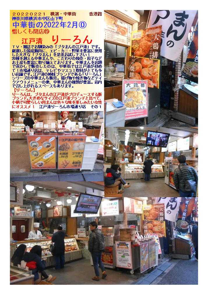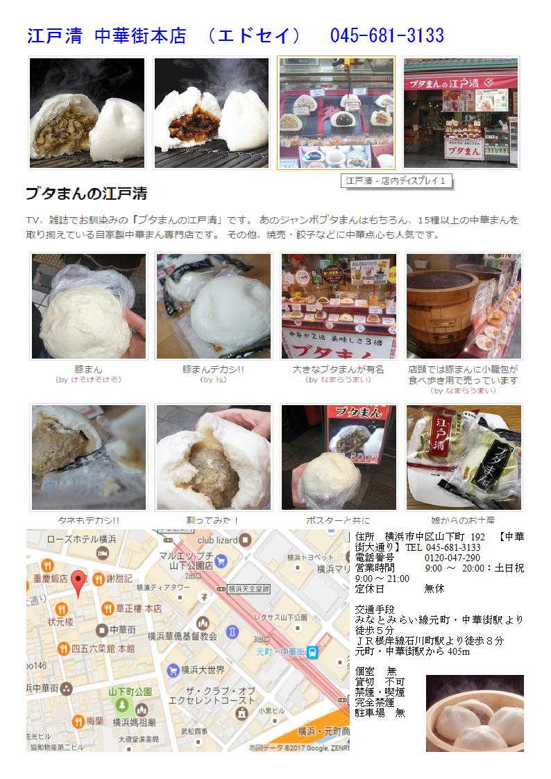 皆さまからのご応募を、心よりお待ちしています。 江戸清は明治27年創業より、食肉を取り扱う業者として「安全・安心」「品質・鮮度」をモットーに優れた食材、加工品を提供し ております。 当社の業務は大きく分けると製造業とサービス業(物販・飲食)の二つに分類されます。製造業としての江戸清は、横浜・千葉 工場において全国のファーストフード店、ファミリーレストラン等で使用されている食肉加工品(ハンバーガーパティ、メンチカツ、とんかつ等)と、直営店舗やインターネット、ギフト等を通じて販売している中華点心・総菜品の製造を行っています。 一方、サービス業(物販・飲食)としての江戸清は、直営店舗にて中華点心・総菜等の販売を行っています。 今後の取り組みとしては、当社製品の「ブランド化」に重点をおいております。 すでに「ブタまんの江戸清」「りーろん」ブランドは多くのお客様にご愛顧頂いていますが、「produced by横浜中華街 江戸清」 の店舗と商品を展開していく事により、様々なシチュエーションでお客様との接地面積を広げていきたいと思っています。 また、商品開発においては、より一層「健康」「本物」「産地直送」「地産地消」にこだわり当社製品の差別化に力を入れていきます。 20220221 横濱・中華街 香港路 神奈川県横浜市中区山下町 中華街の2022年2月⓪ 惜しくも閉店⑮ 江戸清 りーろん TV・雑誌でお馴染みの「ブタまんの江戸清」です。 厳選した国産豚肉に、エビ・カニ・野菜を豊富に使用した大きな「ブタまん」を是非お試し下さい! 20種を越える中華まんや、こだわりの焼売・餃子などお土産も豊富に取り揃えております。中華まんを店頭で蒸かしで販売したのは、中華街では江戸清が初めて!市場通り店は、テレビやマスコミ取材がとても多い店舗です。江戸清の姉妹ブランドである「りーろん」シリーズの中華まんも販売。揚げ物や焼き物などテイクアウトメニューの他、中華まんの種類が豊富。店内で召し上がれるスペースもあります。 【りーろん】 りーろんは、ブタまんの江戸清がプロデュースする新ブランド。大きめなサイズの江戸清ブランドと比べて、小柄で可愛らしい肉まんは色々な味を楽しみたい女性にオススメ! 江戸清りーろん市場通り店 お気に入りの記事を「いいね!」で応援しよう