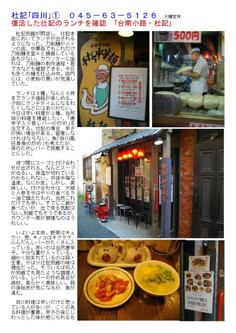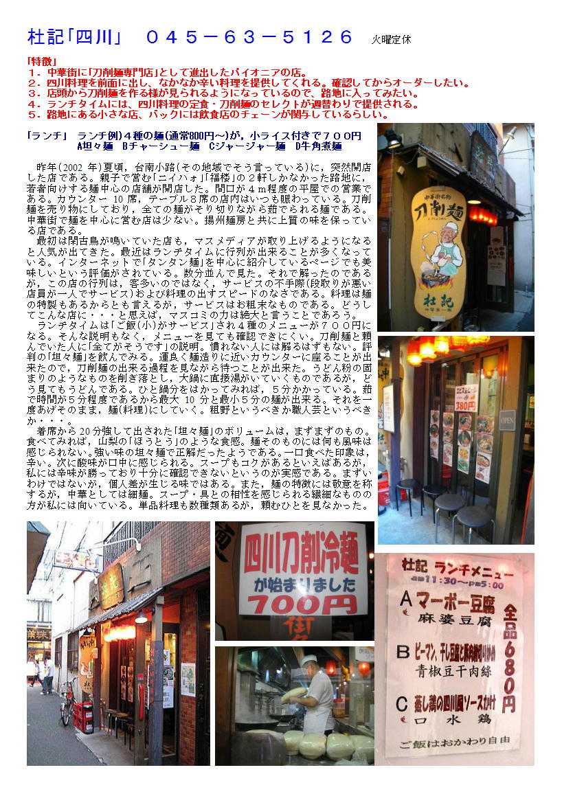 1)最近人気を得ているのが,刀傷麺。それは「杜記」で食べられる。 意外と刀傷麺をメインでうたっている店は,中華街でも2軒しかない。京華楼とこの店である。いずれにしても独特な麺が舌も楽しませてくれる。香港路と市場通りの間の路地を地元の人は「台南通り」と名付けている。その香港路よりにカウンターを中心としたこの店がある。外から見ても麺を作る作業が確認できる。たいがい行列を作っているので,待つ間見ているのもおもしろい。 店のお薦めも「坦々麺」である。多少酸味が付いた味付けは,やや極太の麺の風味を引き立ててくれる。なかなか辛いので,辛いのが苦手な人は「角煮麺」等を頼んでみると良い。意外と焼き餃子も美味しいので,腹に余裕がある場合は頼んでおきたい。 https://blog.goo.ne.jp/to-sai00/e/13fc94d1ae799600a0b0432dc35974d1 杜記「四川」 045-63-5126 火曜定休 「特徴」 1.中華街に「刀削麺専門店」として進出したパイオニアの店。 2.四川料理を前面に出し、なかなか辛い料理を提供してくれる。確認してからオーダーしたい。 3.店頭から刀削麺を作る様が見られるようになっているので、路地に入ってみたい。 4.ランチタイムには、四川料理の定食・刀削麺のセレクトが週替わりで提供される。 5.路地にある小さな店、バックには飲食店のチェーンが関与しているらしい。 「ランチ」 ランチ例)4種の麺(通常800円~)が,小ライス付きで700円 A坦々麺 Bチャーシュー麺 Cジャージャー麺 D牛角煮麺 昨年(2002年)夏頃,台南小路(その地域でそう言っている)に,突然開店した店である。親子で営む「ニイハォ」「福楼」の2軒しかなかった路地に,若者向けする麺中心の店舗が開店した。間口が4m程度の平屋での営業である。カウンター10席,テーブル8席の店内はいつも賑わっている。刀削麺を売り物にしており,全ての麺がそり切りながら茹でられる麺である。中華街で麺を中心に営む店は少ない。揚州麺房と共に上質の味を保っている店である。 最初は閑古鳥が鳴いていた店も,マスメディアが取り上げるようになると人気が出てきた。最近はランチタイムに行列が出来ることが多くなっている。インターネットで「タンタン麺」を中心に紹介しているページでも美味しいという評価がされている。数分並んで見た。それで解ったのであるが,この店の行列は,客多いのではなく,サービスの不手際(段取りが悪い店員が一人でサービス)および料理の出すスピードのなさである。料理は麺の特製もあるからとも言えるが,サービスはお粗末なものである。どうしてこんな店に・・・と思えば,マスコミの力は絶大と言うことであろう。 ランチタイムは「ご飯(小)がサービス」され4種のメニューが700円になる。そんな説明もなく,メニューを見ても確認できにくい。刀削麺と頼んでいた人に「全てがそうです」の説明。慣れない人には解るはずもない。評判の「坦々麺」を飲んでみる。運良く麺造りに近いカウンターに座ることが出来たので,刀削麺の出来る過程を見ながら待つことが出来た。うどん粉の固まりのようなものを削ぎ落とし,大鍋に直接湯がいていくものであるが,どう見てもうどんである。ひと鍋分をはかってみれば,5分かかっている。茹で時間が5分程度であるから最大10分と最小5分の麺が出来る。それを一度あげそのまま,麺(料理)にしていく。粗野というべきか職人芸というべきか・・・。 着席から20分強して出された「坦々麺」のボリュームは,まずまずのもの。食べてみれば,山梨の「ほうとう」のような食感。麺そのものには何も風味は感じられない。強い味の坦々麺で正解だったようである。一口食べた印象は,辛い。次に酸味が口中に感じられる。スープもコクがあるといえばあるが,私には辛味が勝っており十分に確認できないというのが実感である。まずいわけではないが,個人差が生じる味ではある。また,麺の特徴には敬意を称するが,中華としては細麺。スープ・具との相性を感じられる繊細なものの方が私には向いている。単品料理も数種類あるが,頼むひとを見なかった。 ![]() ![]() 杜記「四川」① 045-63-5126 火曜定休 復活した壮記のランチを確認 「台南小路・杜記」 杜記別館が閉店し、壮記本店においてランチが出されるようになった。刀削麺がメインの店。中華街でもこれだけ刀削麺を堂々と勝負している店も少ない。カウンターに座れば、刀削麺の制作過程・茹で方なども確認できる。今日も多くの麺を仕込み中。店内には、小麦粉の臭いが充満していた。 ランチは5種。なんと5持までランチ価格が楽しめる。夕刻にランチタイムになるわたくしなどにはありがたい。今日は辛い料理が2種。当然四川料理を堪能したい。「唐辛子入り豚レバーの炒め」を注文する。壮記の場合、辛さが怖い場合がある。留意しなければならない。魚「四川風白身魚の炒め」も考えたが、体のためレバーで挑戦することにした。 待つ間にスープと付け合わせが出される。なんとスープがぬるい。保温が切れているのかもしれない。中