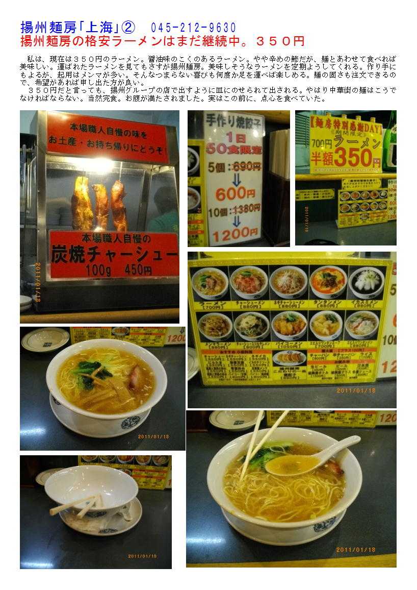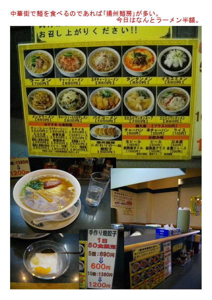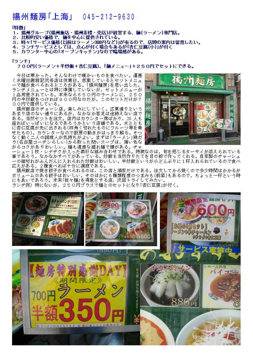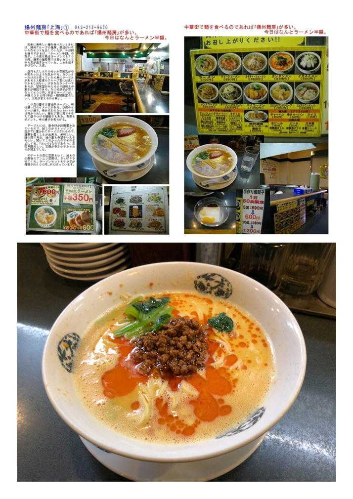 私の情報は、facebook twitter. を確認ください。「中華街を大切にする人」「ご利用する人」にはご協力をします。 中華街で麺類を楽しむ(庶民派の店)③ 中華料理と言えばラーメンなどという人は,最近あまりいないはずである。しかし,どうしても食べたくなる事はあるはずである。ラーメンは,最近の「・・系ラーメン」などと言って,ブームをあおっている店に任せ,ここは「中華街」でしか食べることが出来ない料理を吟味してみよう。 基本的に,中華街では①1品料理②コースが主となり,③炒飯④焼きそば⑤お粥で締めると言うことが多い。そういう訳で,(汁)麺はあまり体験したことが無いというのが実感ではあるが,印象に残っている麺はあることはあるので,思い出してみる。 ※「揚州麺房」がオーナーチェンジ 3)中華そば屋(専門店)らしい中華街の店と言えば「富泰楼麺房」であろう。 中華街で4店舗展開する揚州グループの麺専門店である。広東路(あまり店舗無い)という条件ではあるが,なかなかのものを提供してくれている。基本は,ラーメンだがしょうゆ味のものをうまく扱っていて美味しい。珍しい物として,イカスミラーメンがある。想像通り,真っ黒なスープに縮れ麺が入っているものである。味は特に奇抜性もなく風味のある海鮮味に仕上がっている。 中華街ではカウンター越しに厨房のある店は珍しい。揚州麺房はオープンキッチンになっていて,職人の行動が見て取れる。自分の食べる物の全工程が確認できる事はうれしい。それを意識してかどうかは解らないが,従業員の動きがスピーディーである。 セットメニューもあるのでお腹と相談したいが,ボリュームたっぷりの「焼き餃子」はジューシーで美味しい。堪能しておきたい一品である。https://blog.goo.ne.jp/to-sai00/e/6c34c819d1ad6d5bcc9b6f963fa0314a 揚州麺房「上海」 045-212-9630