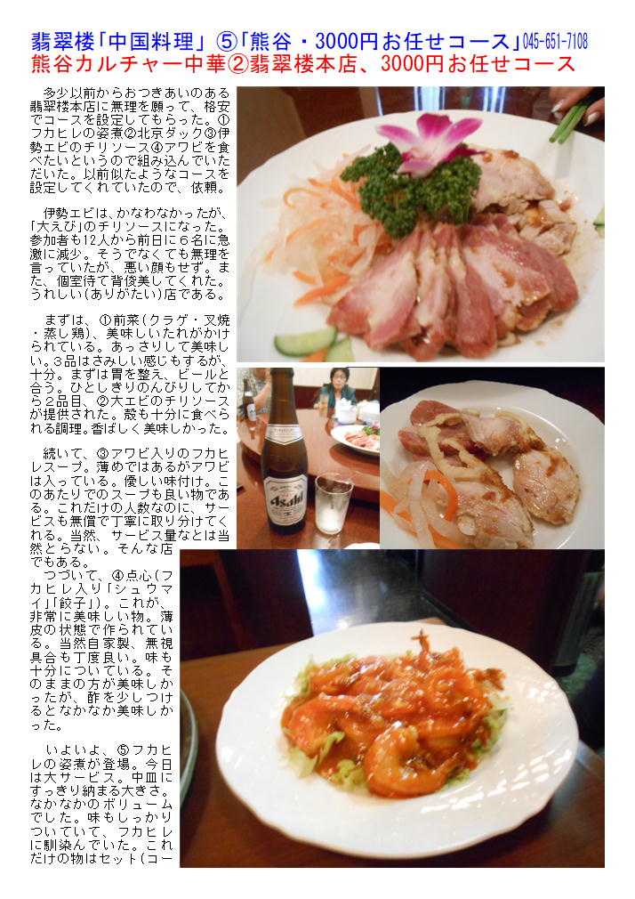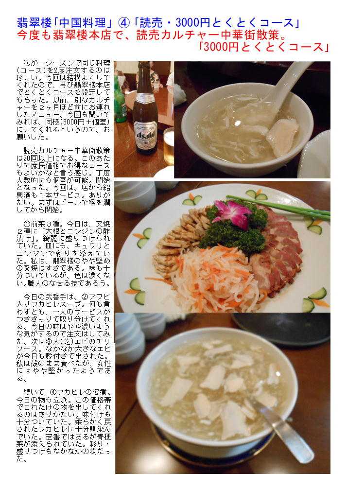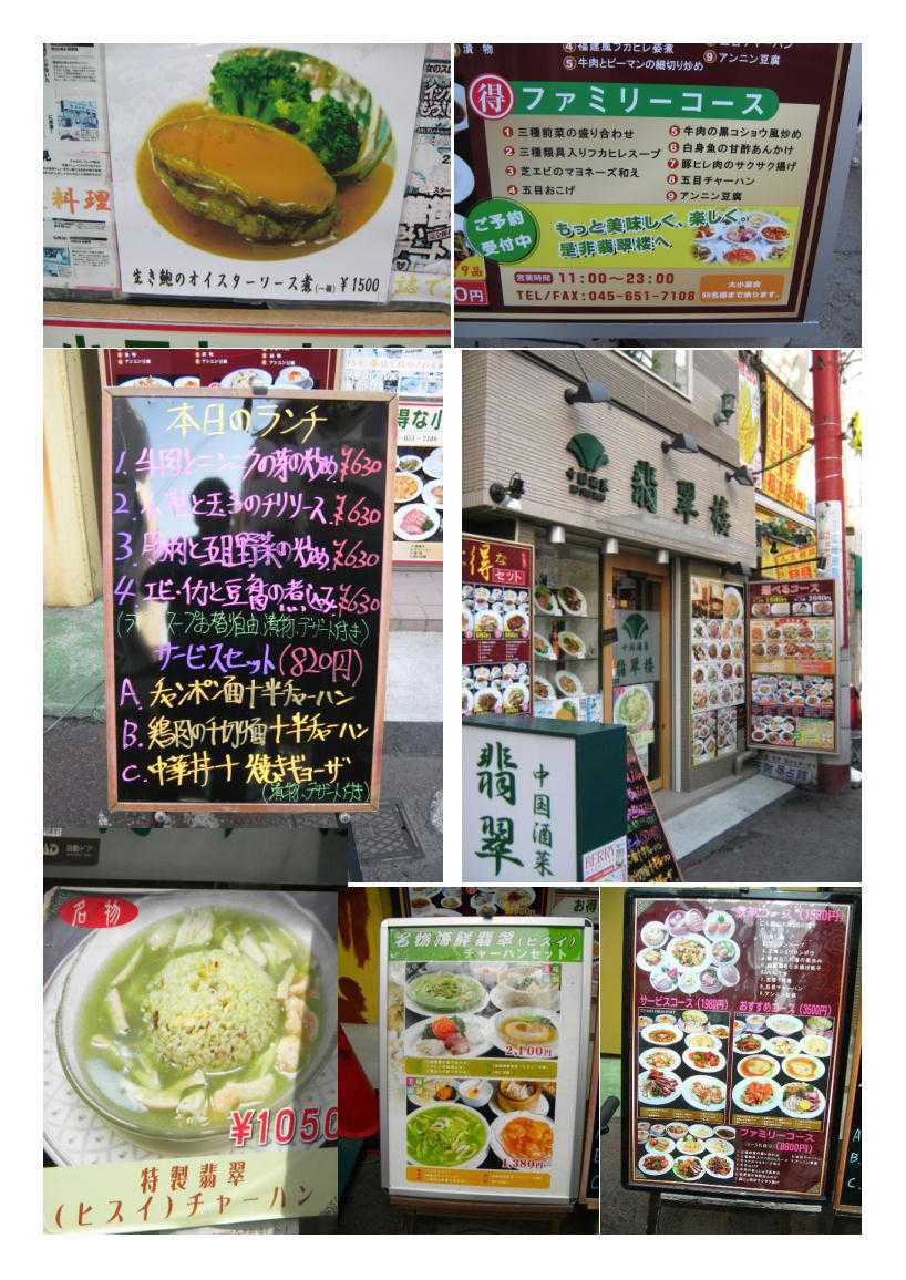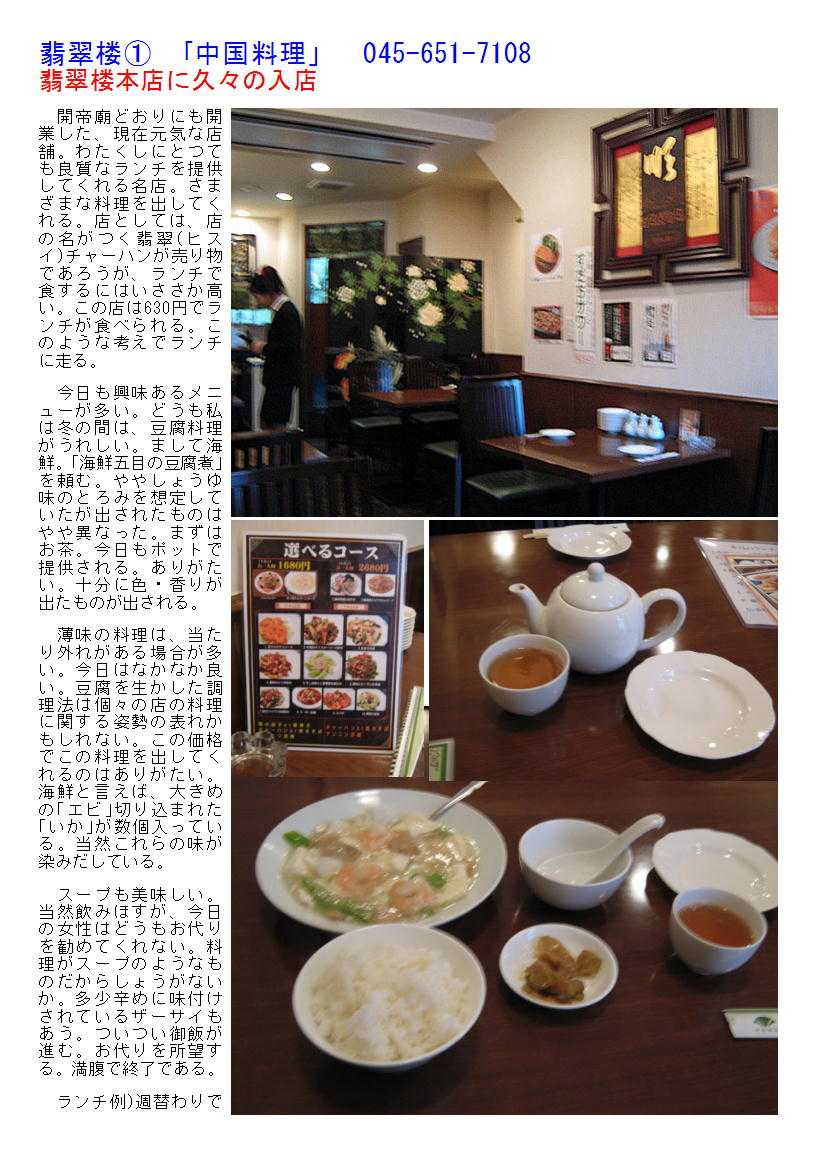 私の情報は、facebook twitter. を確認ください。「中華街を大切にする人」「ご利用する人」にはご協力をします。 中華街で食べておいた方が良い(思出となる)料理② 「庶民編」 翡翠楼(中山路)「翡翠チャーハン」 ![]() 翡翠楼① 「中国料理」 045-651-7108 翡翠楼本店に久々の入店 開帝廟どおりにも開業した、現在元気な店舗。わたくしにとつても良質なランチを提供してくれる名店。さまざまな料理を出してくれる。店としては、店の名がつく翡翠(ヒスイ)チャーハンが売り物であろうが、ランチで食するにはいささか高い。この店は630円でランチが食べられる。このような考えでランチに走る。 今日も興味あるメニューが多い。どうも私は冬の間は、豆腐料理がうれしい。まして海鮮。「海鮮五目の豆腐煮」を頼む。ややしょうゆ味のとろみを想定していたが出されたものはやや異なった。まずはお茶。今日もポットで提供される。ありがたい。十分に色・香りが出たものが出される。 薄味の料理は、当たり外れがある場合が多い。今日はなかなか良い。豆腐を生かした調理法は個々の店の料理に関する姿勢の表れかもしれない。この価格でこの料理を出してくれるのはありがたい。海鮮と言えば、大きめの「エビ」切り込まれた「いか」が数個入っている。当然これらの味が染みだしている。 スープも美味しい。当然飲みほすが、今日の女性はどうもお代りを勧めてくれない。料理がスープのようなものだからしょうがないか。多少辛めに味付けされているザーサイもあう。ついつい御飯が進む。お代りを所望する。満腹で終了である。 ランチ例)週替わりで4種630円+820円セツト3種程度が提供される。 ランチ)①牛肉とにんにくのめ炒め②小柱と玉子のチリソース③豚肉と五目野菜の炒め④えび・イカと豆腐の煮こみ ![]() ![]() ![]() ![]() 翡翠楼「中国料理」④ 「読売・3000円とくとくコース」 今度も翡翠楼本店で、読売カルチャー中華街散策。 「3000円とくとくコース」 私が一シーズンで同じ料理(コース)を2度注文するのは珍しい。今回は結構よくしてくれたので、再び翡翠楼本店でとくとくコースを設定してもらった。以前、別なカルチャーを2ヶ月ほど前にお連れしたメニュー。今回も聞いてみれば、同様(3000円+個室)にしてくれるというので、お願いした。 読売カルチャー中華街散策は20回以上になる。このあたりで庶民価格でお得なコースもよいかなと言う感じ。丁度人数的にも個室が可能。開始となった。今回は、店から紹興酒も1本サービス。ありがたい。まずはビールで喉を潤してから開始。 ①前菜3種。今日は、叉焼2種に「大根とニンジンの酢漬け」。綺麗に盛りつけられていた。皿にも、キュウリとニンジンで彩りを添えていた。私は、翡翠楼のやや堅めの叉焼はすきである。味も十分ついているが、色は濃くない。職人のなせる技であろう。 今日の弐番手は、②アワビ入りフカヒレスープ。何も言わずとも、一人のサービスがつききっりで取り分けてくれる。今日の味はやや濃いような気がするので注文はしてみた。次は③大(芝)エビのチリソース。なかなか大きなエビが今日も殻付きで出された。私は殻のまま食べたが、女性にはやや堅かったようである。 続いて、④フカヒレの姿煮。今日の物も立派。この価格帯でこれだけの物を出してくれるのはありがたい。味付けも十分ついていた。柔らかく戻されたフカヒレに十分馴染んでいた。定番ではあるが青梗菜が添えられていた。彩り・盛りつけもなかなかの物だった。 このあたりで、⑤点心2種が登場。「フカヒレ蒸しシュウマイ」「フカヒレ餃子」の登場。当然ではあるがむしきで熱々の物が提供された。丁度良い、口の変化が点心で行われた。やはり多少酢をつけて食べると素材の味が一層感じられる。今日は円卓に丁度良い人数。話も弾む。 このコースの特徴は、⑥7煮豚(角煮)+蒸しパン。以前は中華街でよく出された料理。最近は少ないのかもしれない。八角の香りがついた豚バラ肉は非常に柔らかく仕上げられている。パンに挟んで食べると、角煮の味がやや変化すると感じるのは私だけであろうか。 次は、この店の得意料理⑦「麻婆豆腐」。優しい辛さが好評。美味しく仕立てられていました。このグループは、北京烤鴨の包み方も習っているので、北京烤鴨はそのまだしてもらうように頼む。自信がある方がまずは見本を示し、見よう見まねで続く。やはりこのような作法も中華料理では楽しい物である。 最終仕上げは、やはり翡翠楼の定番炒飯、⑧翡翠炒飯(緑色のスープ炒飯)。濃いめの味であったが、ここでなければ食べられない一品。ほうれん草を基本とした緑仕立て、スープの中にはイカなどの海鮮も多くは行っている。なかなか他店舗では見られない物。 最終仕上げは、⑨杏仁豆腐。やはり最後に杏仁豆腐は中華街に合う一品。口も胃袋も調整される物です。 ![]() ![]() ![]() ![]() ![]() ![]() ![]() 翡翠楼「中国料理」⑤ 「熊谷・3000円お任せコース」045-