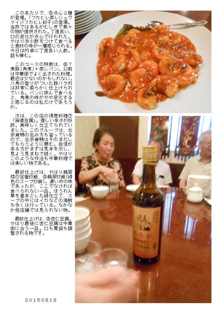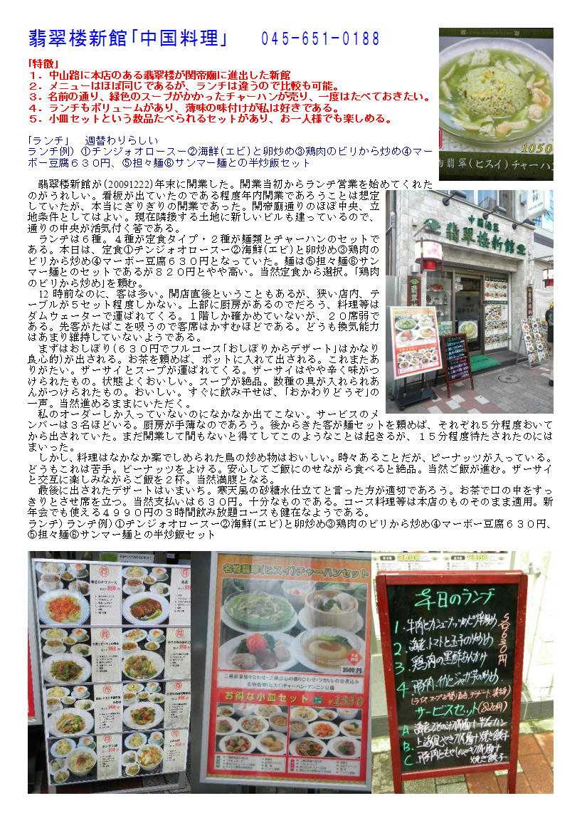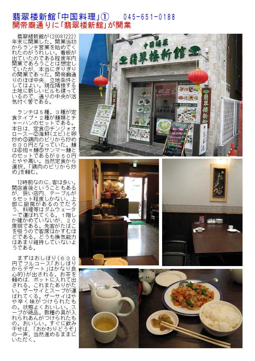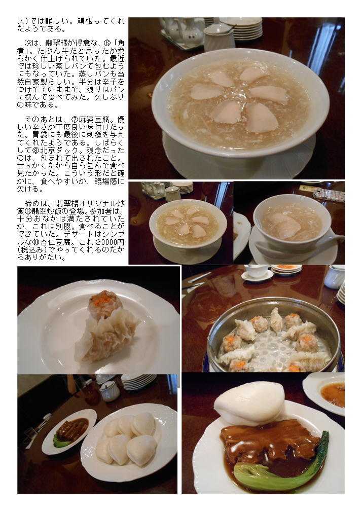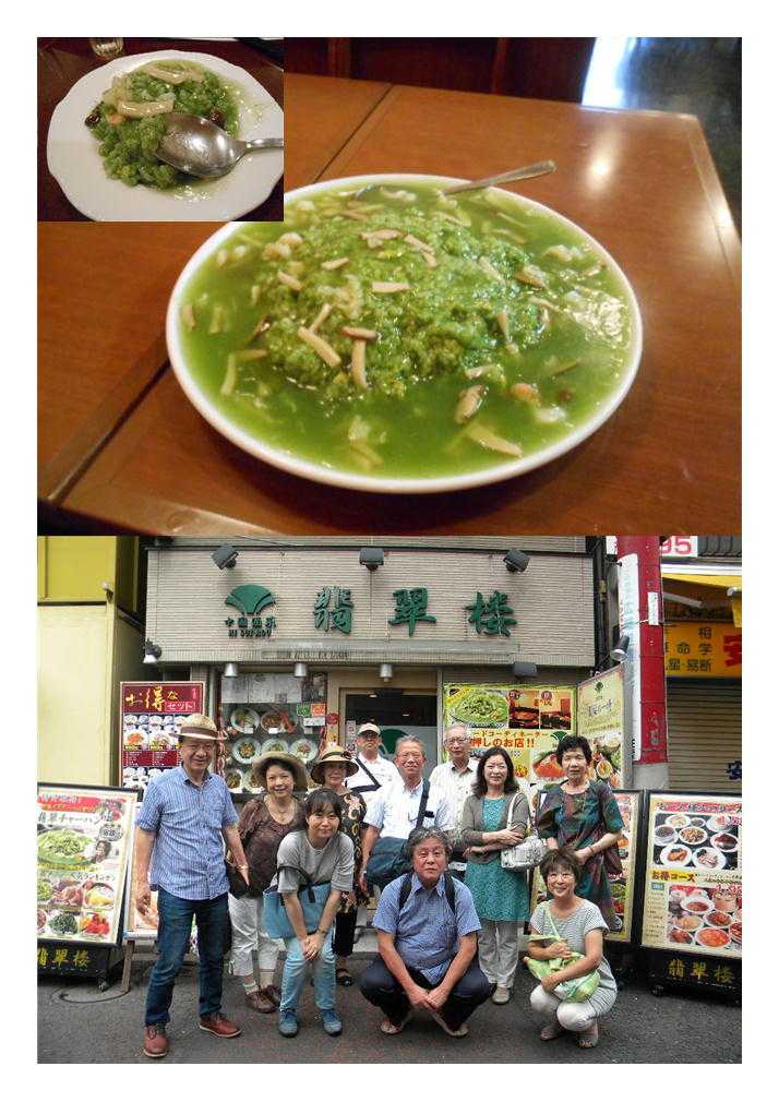 私の情報は、facebook twitter. を確認ください。「中華街を大切にする人」「ご利用する人」にはご協力をします。 中華街で食べておいた方が良い(思出となる)料理② 「庶民編」 翡翠楼(中山路)「翡翠チャーハン」 ![]() 翡翠楼① 「中国料理」 045-651-7108 翡翠楼本店に久々の入店 開帝廟どおりにも開業した、現在元気な店舗。わたくしにとつても良質なランチを提供してくれる名店。さまざまな料理を出してくれる。店としては、店の名がつく翡翠(ヒスイ)チャーハンが売り物であろうが、ランチで食するにはいささか高い。この店は630円でランチが食べられる。このような考えでランチに走る。 今日も興味あるメニューが多い。どうも私は冬の間は、豆腐料理がうれしい。まして海鮮。「海鮮五目の豆腐煮」を頼む。ややしょうゆ味のとろみを想定していたが出されたものはやや異なった。まずはお茶。今日もポットで提供される。ありがたい。十分に色・香りが出たものが出される。 薄味の料理は、当たり外れがある場合が多い。今日はなかなか良い。豆腐を生かした調理法は個々の店の料理に関する姿勢の表れかもしれない。この価格でこの料理を出してくれるのはありがたい。海鮮と言えば、大きめの「エビ」切り込まれた「いか」が数個入っている。当然これらの味が染みだしている。 スープも美味しい。当然飲みほすが、今日の女性はどうもお代りを勧めてくれない。料理がスープのようなものだからしょうがないか。多少辛めに味付けされているザーサイもあう。ついつい御飯が進む。お代りを所望する。満腹で終了である。 ランチ例)週替わりで4種630円+820円セツト3種程度が提供される。 ランチ)①牛肉とにんにくのめ炒め②小柱と玉子のチリソース③豚肉と五目野菜の炒め④えび・イカと豆腐の煮こみ ![]() ![]() ![]() ![]() 翡翠楼「中国料理」④ 「読売・3000円とくとくコース」 今度も翡翠楼本店で、読売カルチャー中華街散策。 「3000円とくとくコース」 私が一シーズンで同じ料理(コース)を2度注文するのは珍しい。今回は結構よくしてくれたので、再び翡翠楼本店でとくとくコースを設定してもらった。以前、別なカルチャーを2ヶ月ほど前にお連れしたメニュー。今回も聞いてみれば、同様(3000円+個室)にしてくれるというので、お願いした。 読売カルチャー中華街散策は20回以上になる。このあたりで庶民価格でお得なコースもよいかなと言う感じ。丁度人数的にも個室が可能。開始となった。今回は、店から紹興酒も1本サービス。ありがたい。まずはビールで喉を潤してから開始。 ①前菜3種。今日は、叉焼2種に「大根とニンジンの酢漬け」。綺麗に盛りつけられていた。皿にも、キュウリとニンジンで彩りを添えていた。私は、翡翠楼のやや堅めの叉焼はすきである。味も十分ついているが、色は濃くない。職人のなせる技であろう。 今日の弐番手は、②アワビ入りフカヒレスープ。何も言わずとも、一人のサービスがつききっりで取り分けてくれる。今日の味はやや濃いような気がするので注文はしてみた。次は③大(芝)エビのチリソース。なかなか大きなエビが今日も殻付きで出された。私は殻のまま食べたが、女性にはやや堅かったようである。 続いて、④フカヒレの姿煮。今日の物も立派。この価格帯でこれだけの物を出してくれるのはありがたい。味付けも十分ついていた。柔らかく戻されたフカヒレに十分馴染んでいた。定番ではあるが青梗菜が添えられていた。彩り・盛りつけもなかなかの物だった。 このあたりで、⑤点心2種が登場。「フカヒレ蒸しシュウマイ」「フカヒレ餃子」の登場。当然ではあるがむしきで熱々の物が提供された。丁度良い、口の変化が点心で行われた。やはり多少酢をつけて食べると素材の味が一層感じられる。今日は円卓に丁度良い人数。話も弾む。 このコースの特徴は、⑥7煮豚(角煮)+蒸しパン。以前は中華街でよく出された料理。最近は少ないのかもしれない。八角の香りがついた豚バラ肉は非常に柔らかく仕上げられている。パンに挟んで食べると、角煮の味がやや変化すると感じるのは私だけであろうか。 次は、この店の得意料理⑦「麻婆豆腐」。優しい辛さが好評。美味しく仕立てられていました。このグループは、北京烤鴨の包み方も習っているので、北京烤鴨はそのまだしてもらうように頼む。自信がある方がまずは見本を示し、見よう見まねで続く。やはりこのような作法も中華料理では楽しい物である。 最終仕上げは、やはり翡翠楼の定番炒飯、⑧翡翠炒飯(緑色のスープ炒飯)。濃いめの味であったが、ここでなければ食べられない一品。ほうれん草を基本とした緑仕立て、スープの中にはイカなどの海鮮も多くは行っている。なかなか他店舗では見られない物。 最終仕上げは、⑨杏仁豆腐。やはり最後に杏仁豆腐は中華街に合う一品。口も胃袋も調整される物です。 ![]() ![]() ![]() ![]() ![]() ![]() ![]() 翡翠楼「中国料理」⑤ 「熊谷・3000円お任せコース」045-