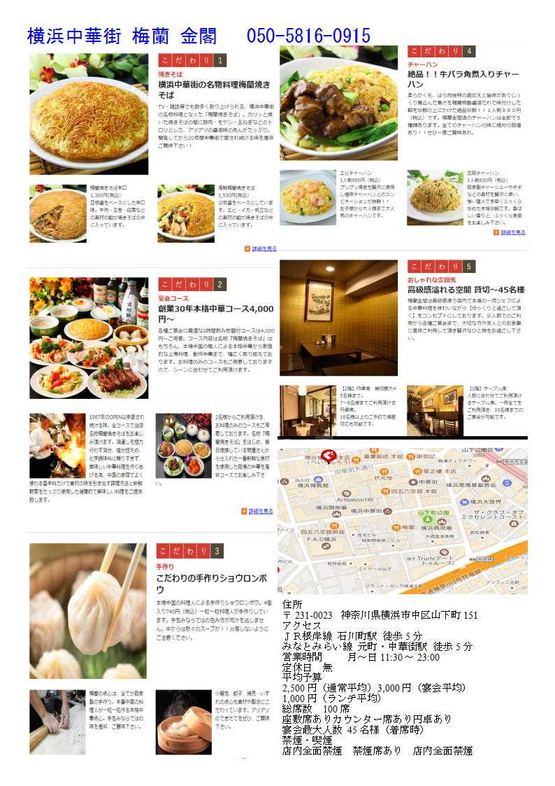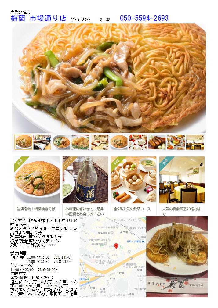 「特徴」 1.どなたも知る「梅蘭やきそば」、あんかけの具材を中にこめた焼きそば珍しい。 2.実はは庶民的な店舗。リーズナブルなコースも準備されている。 3.ランチもボリュームある物が常に準備されている店。 4.中華街には4店舗があるが、本店と関帝廟が同系列。 5.コクがありながらあっさり感(油濃さ)が無いような味付け。