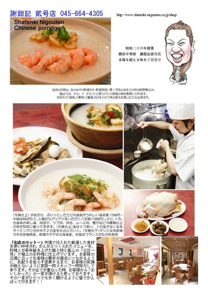 私の情報は、facebook twitter. を確認ください。「中華街を大切にする人」「ご利用する人」にはご協力をします。 中華街で食べておいた方が良い(思出となる)料理⑥ 「庶民編」 謝甜記弐号店(上海路)「お粥」 神奈川県横浜市中区山下町189-9 上海路辰ビル 1F 交通手段 みなとみらい線元町・中華街駅→徒歩5分 首都高速横浜公園出入口から5分 元町・中華街駅から351m 営業時間 [月~木・日] 8:30~20:30 [金・土] 8:30~21:30 朝食営業、ランチ営業、日曜営業 定休日 無休 席数 50席 個室 有 8人可、10~20人可 貸切 可 (20人以下可、20人~50人可) 禁煙・喫煙 完全禁煙 「お店のモットー」市場で仕入れた厳選した食材を使い吟味され、かんがえつくられたメニューを、料理人が長年築き上げた腕と技と真心の「三位一体」で極上のお料理に仕上げています。お客様の立場に立ってお客様の要求が満足につながるように、気配りを怠らず退席するまで、お客様の笑顔が絶えないように家族一同スタッフ一同努力して参ります。その全てが重なった時、お客様から「おいしかった」の一言が頂けると思っております。その一言がひとつでも多く聞けるように皆でがんばって行きます!!