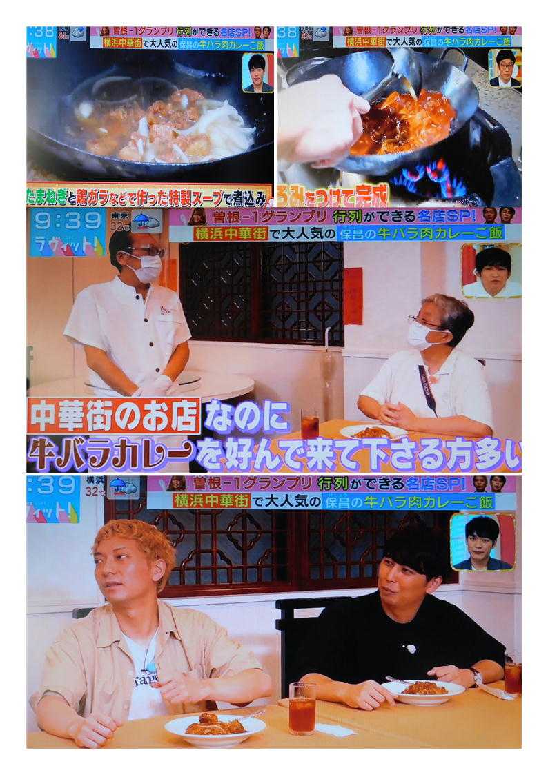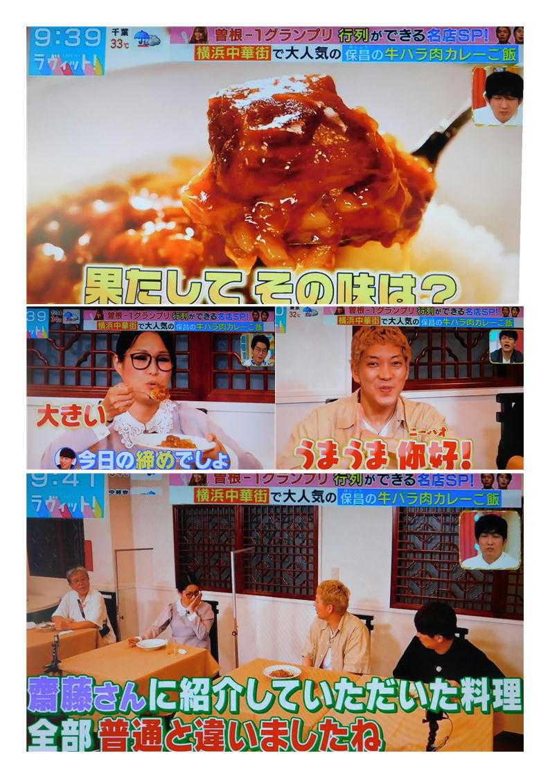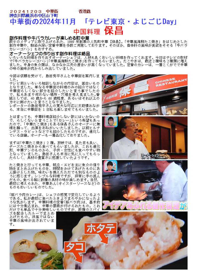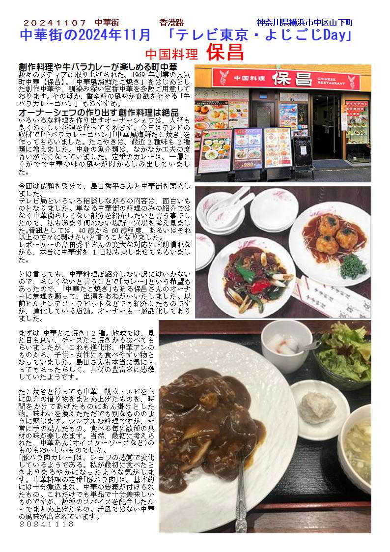 曽根-1グランプリ「横浜中華街」 保昌 牛バラ肉カレーご飯 hpより 今日は曽根-1グランプリ番外編!いわずと知れた大人気グルメタウン「横浜中華街」で、大行列ができる名店の絶品グルメをギャル曽根が食べ、横浜中華街No.1グルメを決定! お店を教えてくれるのは、280店以上ある横浜中華街の飲食店すべてに通い、20年近くブログで美味しいお店の情報を発信し続けている、横浜中華街マニアの斎藤修。斎藤さんにチャーハン・餃子・海老チリ・(秘)メニューの行列ができる名店を紹介しています。 中国料理 保昌 昭和44年創業の「保昌」。 中華料理店にも関わらず、ある意外な料理が大人気で、週末には1時間待ちの大行列ができるんだそう。 牛バラ肉カレーご飯 990円 自家製しょうゆや八角・生姜などと約6時間煮込んだ牛バラ肉の角煮を玉ねぎや鶏がらなどで作った特製スープで煮込み、ケチャップやしょうゆカレー粉などで味を調え、仕上げに水溶き片栗粉でとろみをつけたら完成。中華料理店にもかかわらず、お店の1番人気メニュー! 20241107 中華街 香港路 神奈川県横浜市中区山下町 中華街の2024年11月 「テレビ東京・よじごじDay」 中国料理 保昌 創作料理や牛バラカレーが楽しめる町中華 数々のメディアに取り上げられた、1969年創業の人気町中華【保昌】。「中華風海鮮たこ焼き」をはじめとした創作中華や、馴染み深い定番中華を多数ご用意しております。そのほか、香辛料の風味が食欲をそそる「牛バラカレーゴハン」もおすすめ。 オーナーシェフの作り出す創作料理は絶品 いろいろな料理を作り出すオーナーシェフは、人柄も良くおいしい料理を作ってくれます。今日はテレビの取材で「牛バラカレーゴハン」「中華風海鮮たこ焼き」を作ってもらいました。たこやきは、最近2種味も2種類に増えました。中身の魚介類は、なかなか工夫の度合いが高くなっていました。定番のカレーは、一層こくがでで中華の味の風味が肉からしみ出していました。