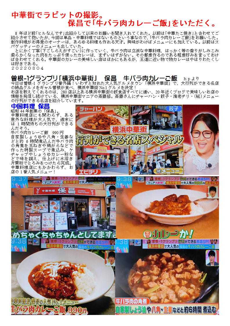 たこ焼きと行っても中華、帆立・エビを主に魚介の借り物をまとめ上げたものを、時間をかけてあげたものにあん掛けとした物。味わいを換えたただでも別なもののように感じます。シンプルな料理ですが、非常に手の混んだもの。食べる毎に数種の具材の味が楽しめます。当然、最初に考えられた、中華あん(オイスターソースなど)のものもおいしいものでした。 「豚バラ肉カレー」は、シェフの感覚で変化しているようである。私が最初に食べたときよりまろやかになったような気がします。中華料理の定番「豚バラ肉」は、基本的には十分煮込まれ、中華の要素が付けられたもの。これだけでも単品で十分美味しいものですが、数種のスパイスを配合したルーでまとめ上げたもの。洋風ではない中華の風味が出されています。 中華街でラビットの撮影。 保昌で「牛バラ肉カレーご飯」をいただく。