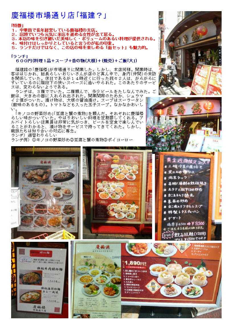 福建路の「慶福楼」が市場通りに開業した。しかし、本店同様。開業時は、客ははじかれ、総長らしいおじいさんが店のど真ん中で、身内(仲間)の来訪を関係していた。休日であるが14時近くに行った我々2人は、がらがらにすいているのに階段下の狭いスペースに追いやられた。このあたりのサービスは、変わらないようである。