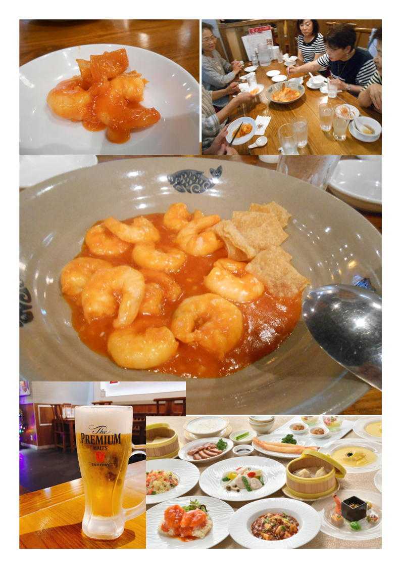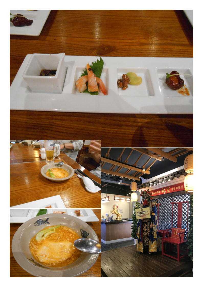 ドリンクを1杯つけていたので、多くの方はビールを楽しんでいた。ショーも終わり落ち着いた頃。前菜が運ばれてきた。前菜4種は、4つに区切られた皿に盛られたもの。少量づつであるがなかなか面白い。①煮物②ボイル海老③魚の揚げ物・空豆④叉焼となっていた。いずれも一口で食べられるもの。楽しさも有りおいしいものだった。