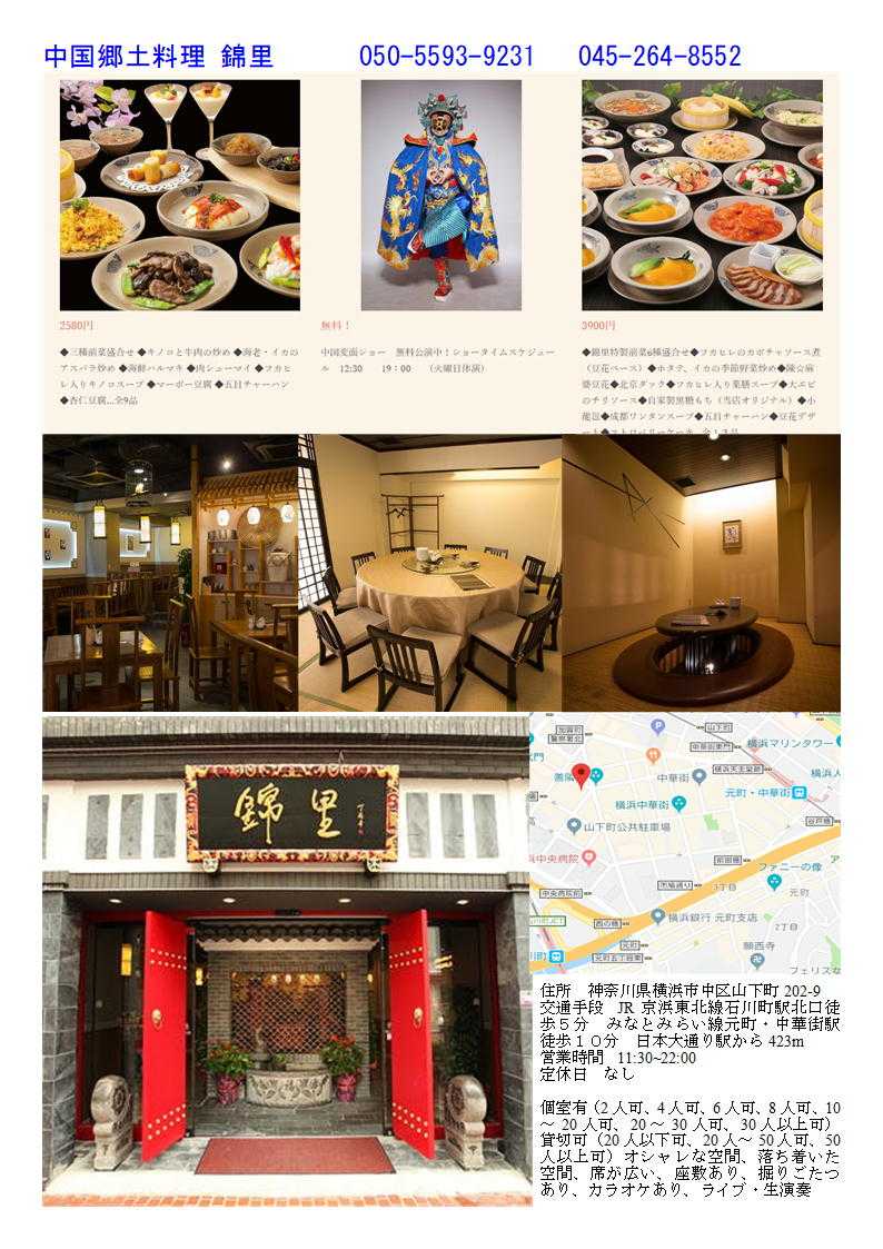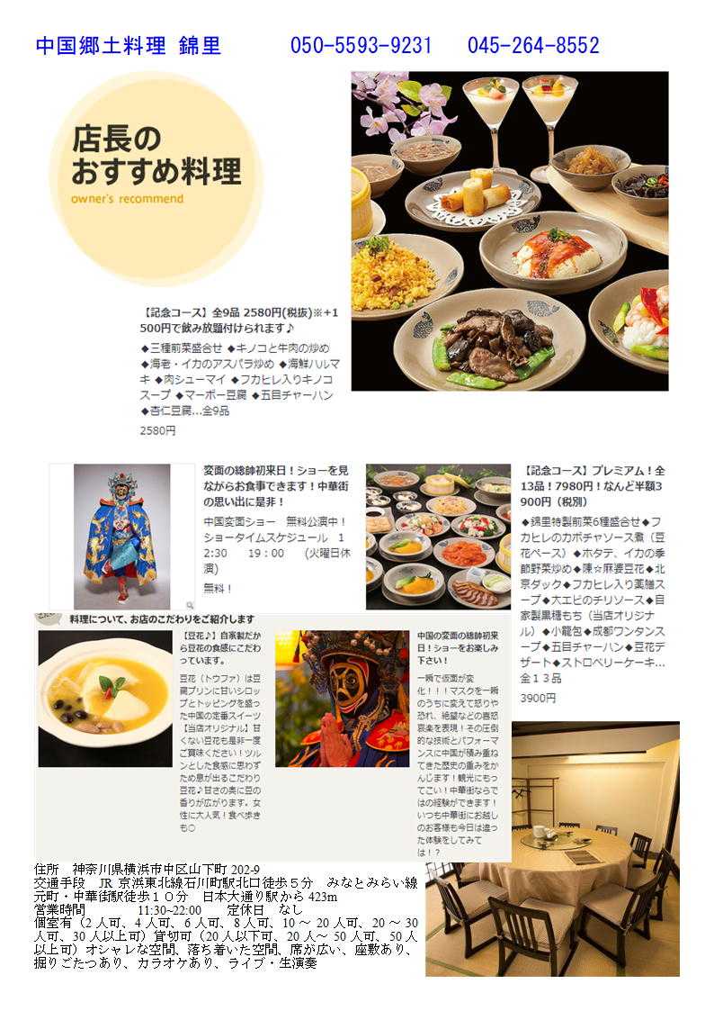 今日は少し贅沢な散策を計画した。みなとみらいからスカイダック横浜を堪能し、その後みなとみらいを散策。地下鉄で元町・中華街まで行き、中華街へ。中華街では、錦里という店で「変面ショー」を楽しんだ後、個室でのんびり中華コースを楽しんだ。まして、フカヒレ+ドリンク付き。 変面ショーは、15分程度の楽しみ。食事をのんびり食べたかったので、ショーは立ち見で見ることにした。その代わり個室を交渉、12名程度座れる場所を確保してもらった。店のサービスのシューなので長いことはないが、中国の国家的ショーの雰囲気を味わうのには十分である。 「特徴」 1 変面ショーを見ながらお食事を楽しめる(無料)。 変 面ショー 平日 12:30 19:00 (火曜日休演) ・土日祝:12:30 14:00 19:00 2.大型店舗をリニューアル、個室も充実している 3.特徴ある中華料理他店とは違う料理も味わえる。 4.デザートは充実、コースの場合2種以上提供される。 5.自家製豆腐を得意とする店、味わっておきたい。 横濱を散策、昼は中華街でランチ。 錦里「1ドリンク付!カニみそ、フカヒレやメインに牛肉料理!名物豆花料理尽くし全12品」+変面ショー。