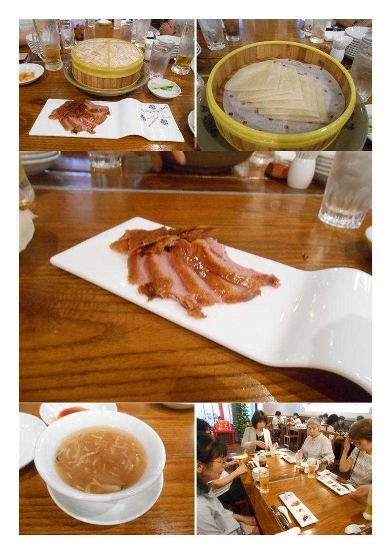 「窯焼き北京ダック」は、蒸された皮と肉もつけられた北京烤鴨が人数分提供された。丁度よい脂の出方。薬味とのセットにすればなかなかおいしい。「フカヒレスープ・キノコ風味」で口を整える。なかなか濃厚な味付け、フカヒレの食感も感じられる。
