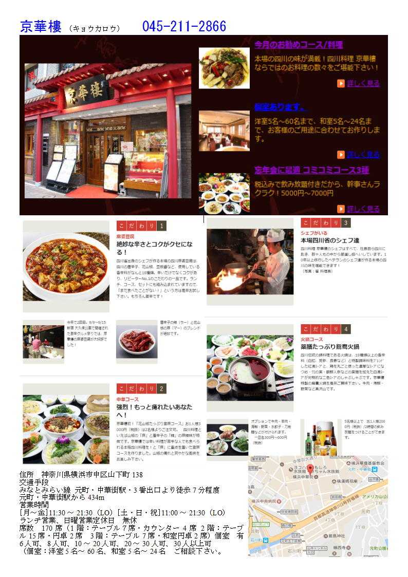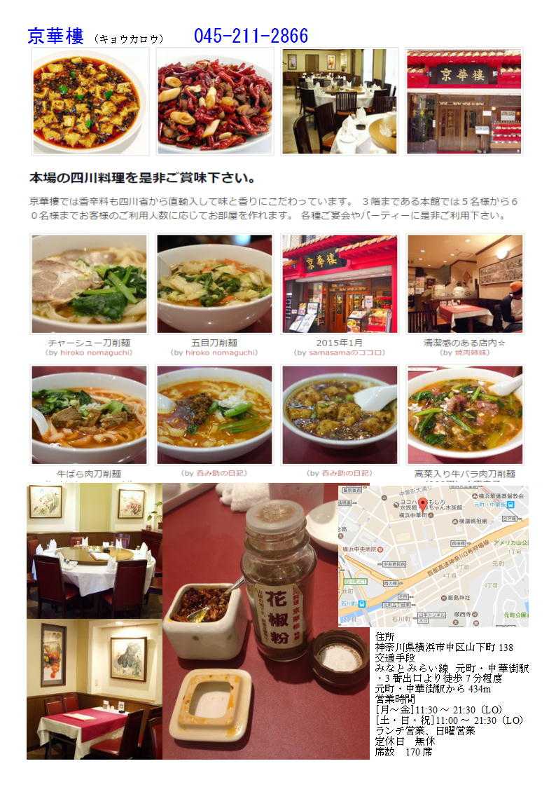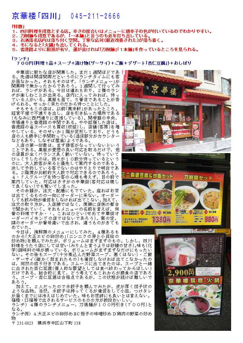 私の情報は、facebook twitter. を確認ください。「中華街を大切にする人」「ご利用する人」にはご協力をします。質問があれば、コメント欄 or sosamu@ya2.so-net.ne.jp にご連絡ください。 横浜中華街で楽しむ 春節のラッキーフード④ 麺(一本麺)① 京華楼本店 ![]() 京華樓 (キョウカロウ) 045-211-2866 住所 神奈川県横浜市中区山下町138 交通手段 みなとみらい線 元町・中華街駅・3番出口より徒歩7分程度 元町・中華街駅から434m 営業時間 [月~金]11:30~21:30(LO) [土・日・祝]11:00~21:30(LO) ランチ営業、日曜営業 定休日 無休 席数 170席 ![]() ![]() 京華楼「四川」 045-211-2666 「特徴」 1.四川料理を得意とする店。辛さの度合いはメニューに唐辛子の色が付いているのでわかりやすい。 2.刀削麺も得意であるが、「一本麺」と言うのも近年打ち出している。 3.お洒落名店内は落ち付く空間。丁寧な応対(最近改善された)が落ち着く。 4.冬になると「火鍋」も出してくれる。 5.香港路よりに厨房が有り、運が良ければ「刀削麺」「1本麺」を作っているところを見られる。 「ランチ」 700円(料理1品+スープ+漬け物(ザーサイ)+ご飯+デザート「杏仁豆腐」)+おしぼり 中華街に新たな店が開業した。まだ1週間ほどである。先週は開店間際だというのにランチタイムにも客が居なかった。それもそのはず,「ランチメニュー」が開業時で無かったからであろう。1週間して行ってみれば,ランチがある。今日は連れもおり,2種のランチが楽しむことが出来る。店内に入ってみれば,待っている人がいる。黒服も居て,5番目であることが告げられる。せっかく来たのだから待つことにした。 そもそもこの店は,以前「萬来軒」があったところ。経営不振で不渡りを出し,店を引き払った場所である(ちなみに西門通りに復活している)。開帝廟の中央,市場通りと香港路の中間である。やや拡張した店は,香港路の省スペースも買収(改修)し,店舗(客席)を増やしている。そのせいか1階が変形しており,どうも店の人も勝手に手間取っている(造床部分がカウンターなどもあり,しなそば屋風)ようである。 入店の第一印象は,まず接客がなっていないということである。黒服が愛想の良い対応を取るだけで,他の店員が全くバランス良く動いていない。待っていてびっくりしたのは,我々が10数分待っているというのに,大人数客が来ると優先して案内するのである。決して予約している客でないのはやりとりで明白である。2階席が比較的大人数で対応できるのであろう。4・7人グループを待つ客の心理も考えず,目の前で案内していた,対応はさすがの中華街(客対応は概して良くない)でも驚いてしまった。 その余韻が,注文・配膳にもでていた。座ればお茶は出てくるものの一向にオーダーに来ない。オーダーしても飲み物が催促をしなければ出てこない。加えて,注文の取り方が,入店順ではなく,席順に店側の都合で聞かれていく。それもメニューの名前を言えば,何番の料理ですか・・。これはひどい(せめて中華街オーダーバイキングの店ではないであろう)。案の定,隣のオーダーが番号違いで出され,違うものがきてもめていた。 今日は,海鮮類のメニューにしてみた。4種あるものから「大正エビの卵炒め」「ニンニクの芽と小貝柱の炒め物」を頼んでみたが,ボリュームはまずまずのもの。しかし,四川料理をうたう店にしては甘い(みりんと言うよりは砂糖の甘さ)。味も(化学)調味料の味が勝っている。ボリュームがまずまずなだけにもったいない。その後もスープ(十分煮込んだ野菜スープ,悪くはない)・ご飯・ザーサイ(細かく刻まれたもの)も催促しなければ出てこなかったのは,同然の成り行きである。スムーズに出てきたのは,スープと一緒に出された杏仁豆腐(個人的な要望としては食べ終わってからほしい)だけである。総合的に見て,どう考えてもこれからが勝負の店であろう。スープ・杏仁豆腐は合格点であるが,この状態が続けば難しいであろう。 加えて,2人だったので水餃子を頼んでみたが,皮が厚く団子状のような品物。当然,水餃子は持ってくるが催促をして小皿,つけタレが届くまでには冷えはじめていた。味もお世辞にも良いとは言えない。福楼・口福等で出されるサービスのものの方が数段おいしい。 ランチ)4種のランチメニュー,刀傷麺が100円引き(700円)となる。 ランチ例)A大正エビの卵炒めBC茄子の味噌炒めD鶏肉の野菜の炒め物 〒231-0023 横浜市中区山下町138