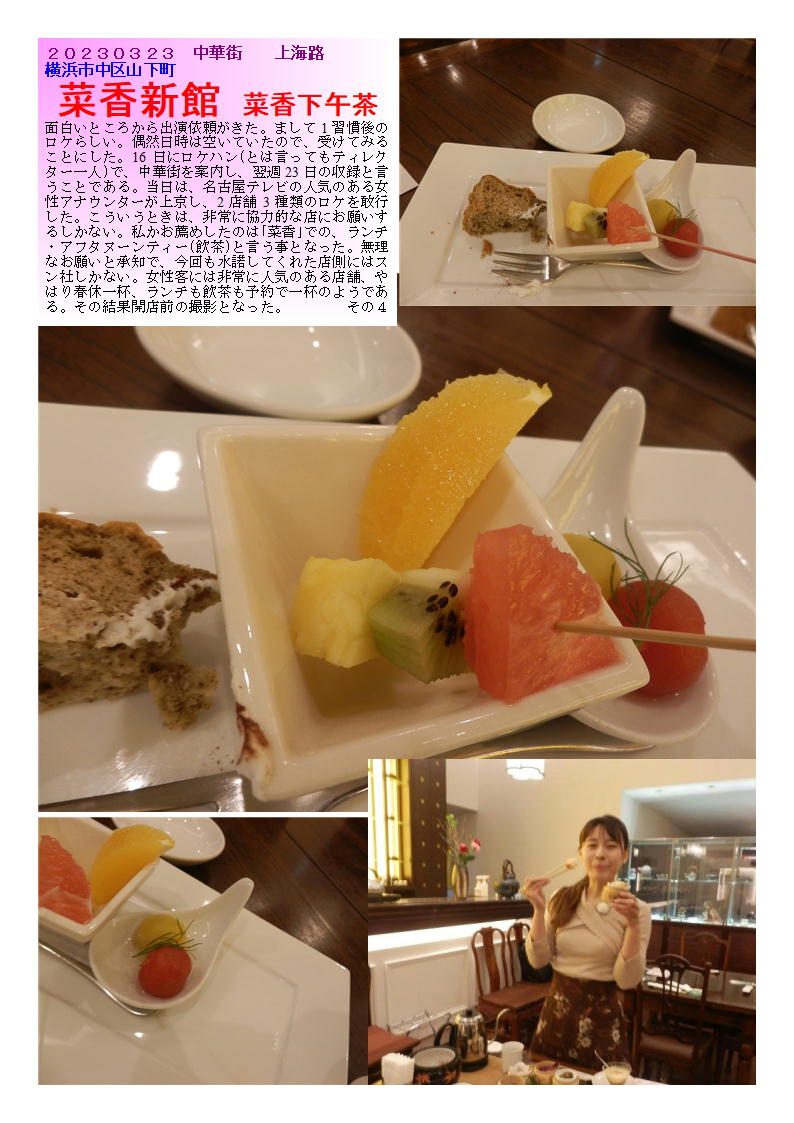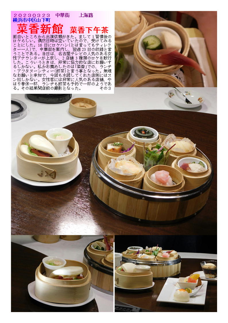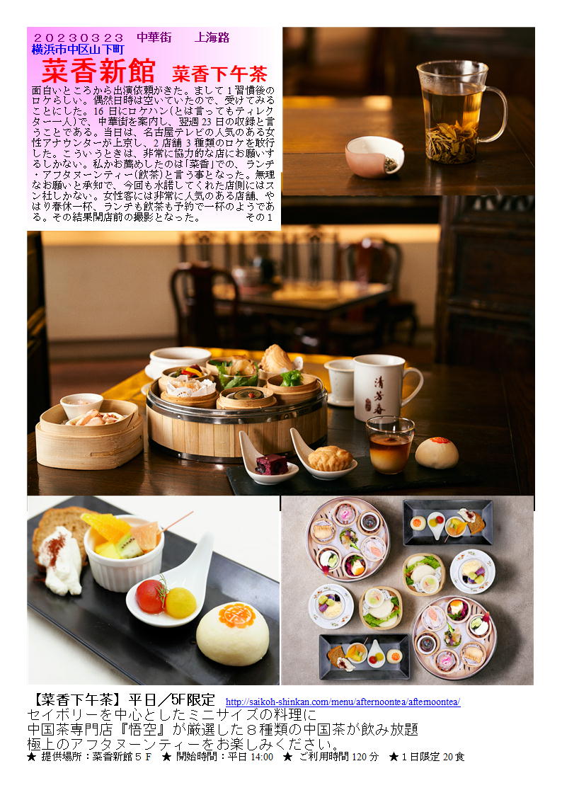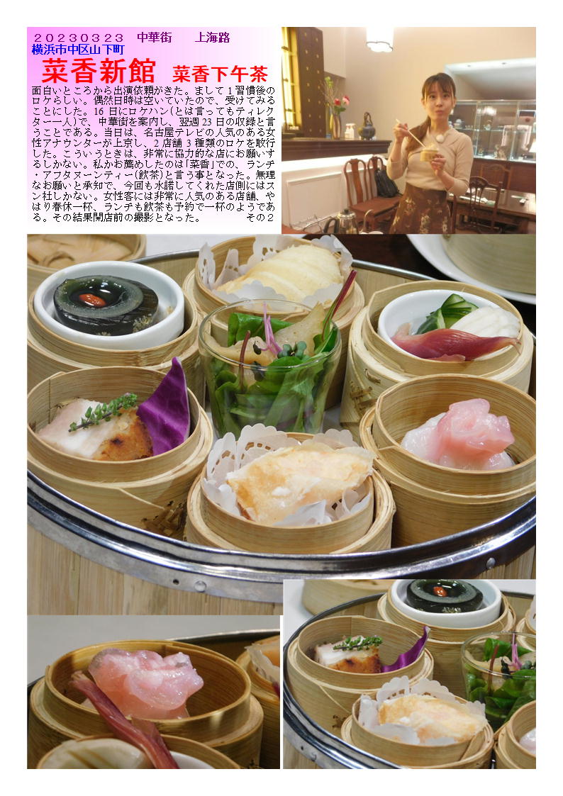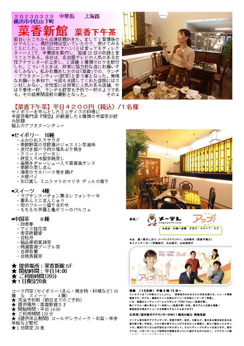 「特徴」 1.以前は大通りに大きな本店を持っていた采香グループ。現在は上海路で威信を保っている。 2.良質の料理を丁寧な応対で提供してくれる。 3.上海路では異質とも思える立派な建物。各フロアーも特徴があり、のんびりできる。 4.女性を意識した料理を準備しているので、女性にはお勧め(人気) 5.良質の物をそれなりの雰囲気で食べたい時には行くべき店である。 「ランチ」 ランチ1800(8種類の点心中心のランチ)5階・1980円(3種り料理を選ぶランチ)+おしぼり 一人では頼めないランチはあるが,どうしてもランチタイムは単品のセレクトとなる。上海路にそびえ立つビルは大きい。インテリアもなかなか凝っており,気持ちの良い店舗である。1階が土産物とロビーとなっており,黒服も常駐している。その雰囲気の中,食事内容に合わせたフロアーに案内される。最近,価格は高いがランチメニューも出始めたので,のんびり食事をしたい場合には利用できる。 一人なので,1階に案内される。おしぼりと箸が丁寧に出され,メニューから選ぶ。ご飯ものを単品でも基本としているので,「・・・飯」なるものを探す。香港風「叉焼飯」・「家鴨のあぶり肉飯」というものがあったので,違いはどのようなものかと聞くと,肉の違いだけのようである。写真写りの良い叉焼飯を注文する。しばらく時間があるので,メニューを見ながら待つ。店の構えにしては価格は抑えられている。1000から2000円で4人程度で食べられそうな料理が並ぶ。小さな丼が皿に載せられてでてきた。吉野家の牛丼「並」程度の器。チャーシューも写真とは別人。寂しいものが6切れ,多少歯ごたえもあり,ジューシーさに欠ける。ご飯も当然こもり,半分が青菜炒めで埋め尽くされている。加えて,ご飯がひどい。炊いたご飯を湯通ししたような,べちゃべちゃなもの。他の客にもこのようなものを出しているのであろうか・・・。そのほかに,スープ・ザーサイも付かない。お茶も一人だとガラスのコップに入れられたウーロン茶がで出くる(2人以上だとポットのようである)。明らかに単独のランチ族はターゲットにしていないようである。 コース料理は4000円程度から1000円刻みで用意されている。意外だったのは,北京ダック1羽が10000円で炒め物付きのようである。写真で見る限り,美味しそうなものであるが,この店の場合出てきてみないと解らないかもしれない。上階でゆっくり食事する時に利用すべき店であろう。 ランチ例)特に軽い感じのランチはない ランチ1800(8種類の点心中心のランチ)5階+スープ+デザート 1980円(3種り料理を選ぶランチ)1・2階+スープ+ご飯+香の物+デザート テレビの取材で、「菜香新館」。なんとアフターヌーンティーセット。美人(名古屋テレビ)アナウンサーと楽しむ幸せ。 【菜香下午茶】平日4200円(税込)/1名様 ◉セイボリー 10種 ・ふかひれ入りサラダ ・季節野菜の甘酢漬けジャスミン茶風味 ・皮付き豚バラ肉の塩あぶり焼き ・クリーミーピータン ・枝豆入り冷製茶碗蒸し ・釜焼きチャーシュー入り菜香風サンド ・季節の蒸し点心 ・海老のウエハース巻き揚げ ・大根パイ ・お口直し ミニトマトのマリネ ディルの香り ◉スイーツ 4種 ・ラプサンスーチョン薫るシフォ ンケーキ ・棗あんミニまんじゅう ・旬のフルーツ盛り合わせ ・もちもち芋圓と亀ゼリーのパルフェ ◉中国茶 8種 ・四季春 ・アイス桂花茶 ・老茶鉄観音 ・白牡丹 ・極品茉莉真珠茶 ・特選雲南プーアル茶 ・白芽奇蘭 ・白桃烏龍茶 突然名古屋テレビのディレクターからメールが来たのが、2週間前、なんと3日後にロケハンが来るという。大概テレビ局だと最低だも2ヶ月の余裕があるもの、その上ロケは1週間後だという。何か不思議な企画。丁度時間あったのでお手伝いしてみることとなった。 通常、ADあたりからの連絡であるが、今回はティレクター自らの折衝。ロケハンと言ってもデッレクター単独だった。詳しいことは解らぬまま、案内しどうにかロケができるように手配を調え、当日となった。特に台本もないロケ、その場で展開して行く紀行文的な企画らしい。 名古屋でレビ(メーテレと言うらしい)のアナウンサーが、気楽に旅にでてその場で新しいものを紹介していくと言う企画らしい、15~20分の企画で、私の分野(中華街)は、3分から5分らしい。それでもその10倍以上はカメラを回すのだからたいした物である。 私が係わる部分でも、半日程度使うらしい。食べ歩きを主体と主体としたかったらしいが、私の希望をくみ取ってもらい、飲食店も入れてもらった。女性に親しまれる店と言うことで、「菜香」を押したら尊重し、実現した。 現在、菜香は上海路と言われるひととおりがあまりない通りに面しているが、接客・質・量とも女性客には非常に人気がある店舗である。やはり美味しいものを紹介してもらいたくお薦めした界があったと思っている。 取材もロケハンの際ある程度内諾を得ていたので非常に好意的に、していただきありがたく思っている。担当の熊沢さ