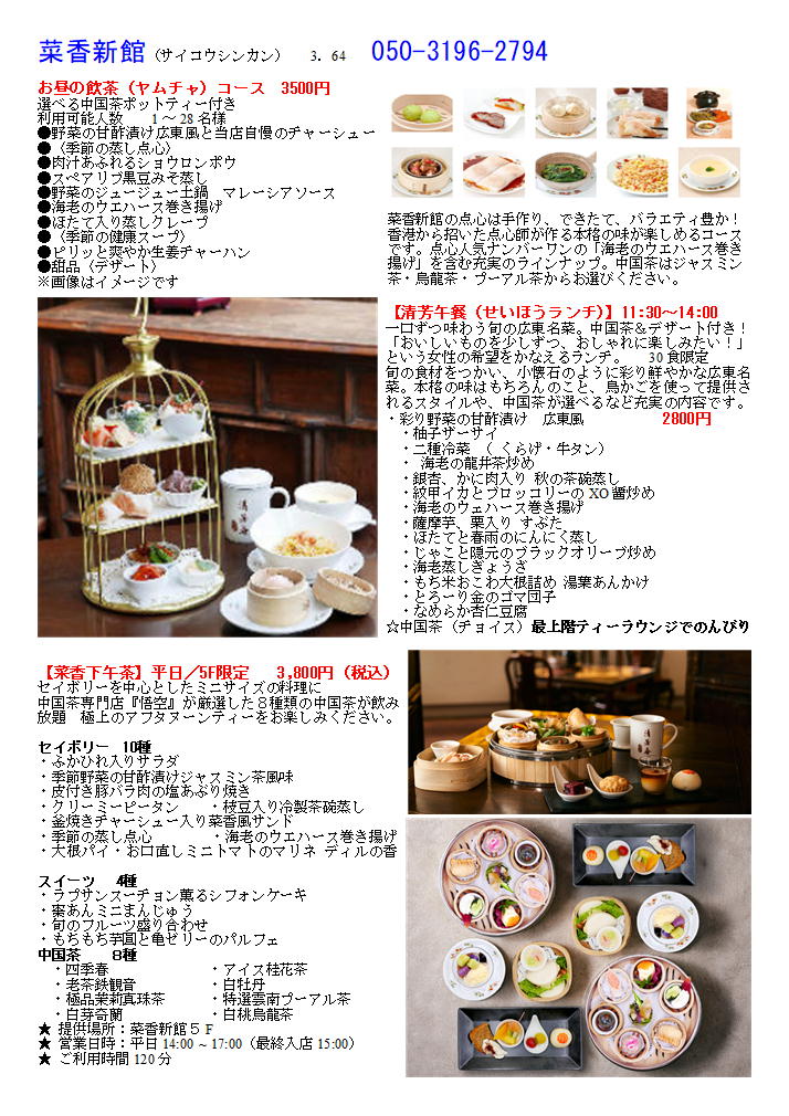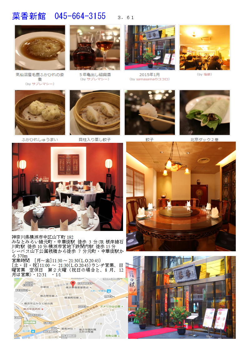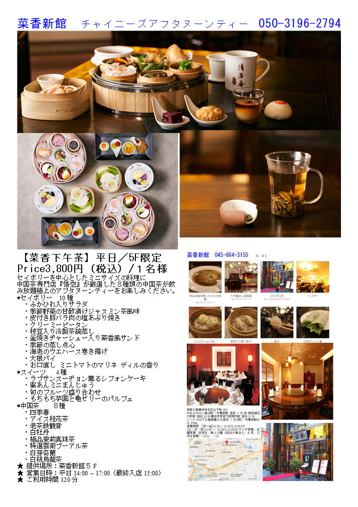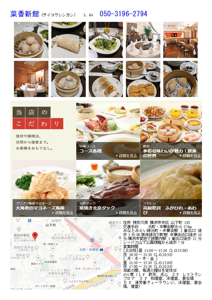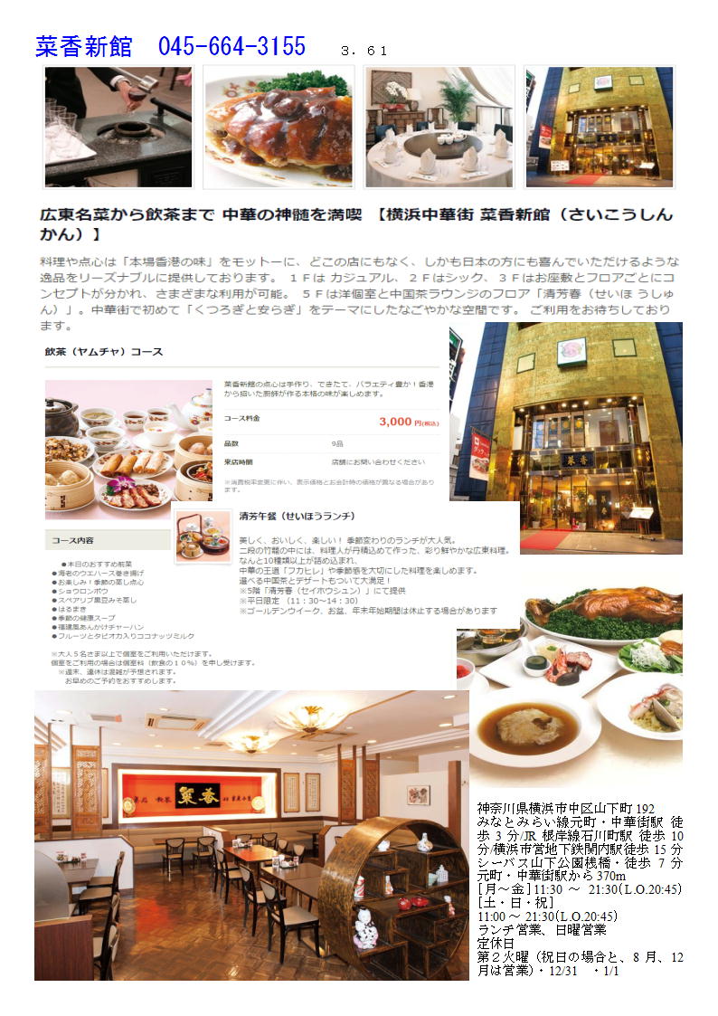 私の情報は、facebook twitter. を確認ください。「中華街を大切にする人」「ご利用する人」にはご協力をします。質問があれば、コメント欄 or sosamu@ya2.so-net.ne.jp にご連絡ください。 横浜中華街で楽しむ 春節のラッキーフード⑧ 年糕等③ 菜香新館 https://www.chinatown.or.jp/event/celebration/shunsetsu2020/shunsetu2020_gourmet/ おひとり様から団体様まで大きなフロアが受け入れる食と和み 本格広東料理、飲茶、薬膳料理など多彩なお料理をゆったりとした空間で味わえるのが魅力の大型店舗。カジュアル、シック、和空間、モダンチャイニーズと各階ごとにテーマのある店内は、軽い食事から宴会まで幅広く利用できる。1階の飲茶フロアは香港さながらの雰囲気の中、専門厨師の技を見ながら50種類以上の飲茶メニューが味わえる。 [月・水・木・金] 11:30~15:30 (L.O.14:30) 17:00~21:30 (L.O.20:30) [土・日・祝] 11:00~16:00(最終入店14:30 L.O.15:00) 17:00~21:30(L.O.20:30)