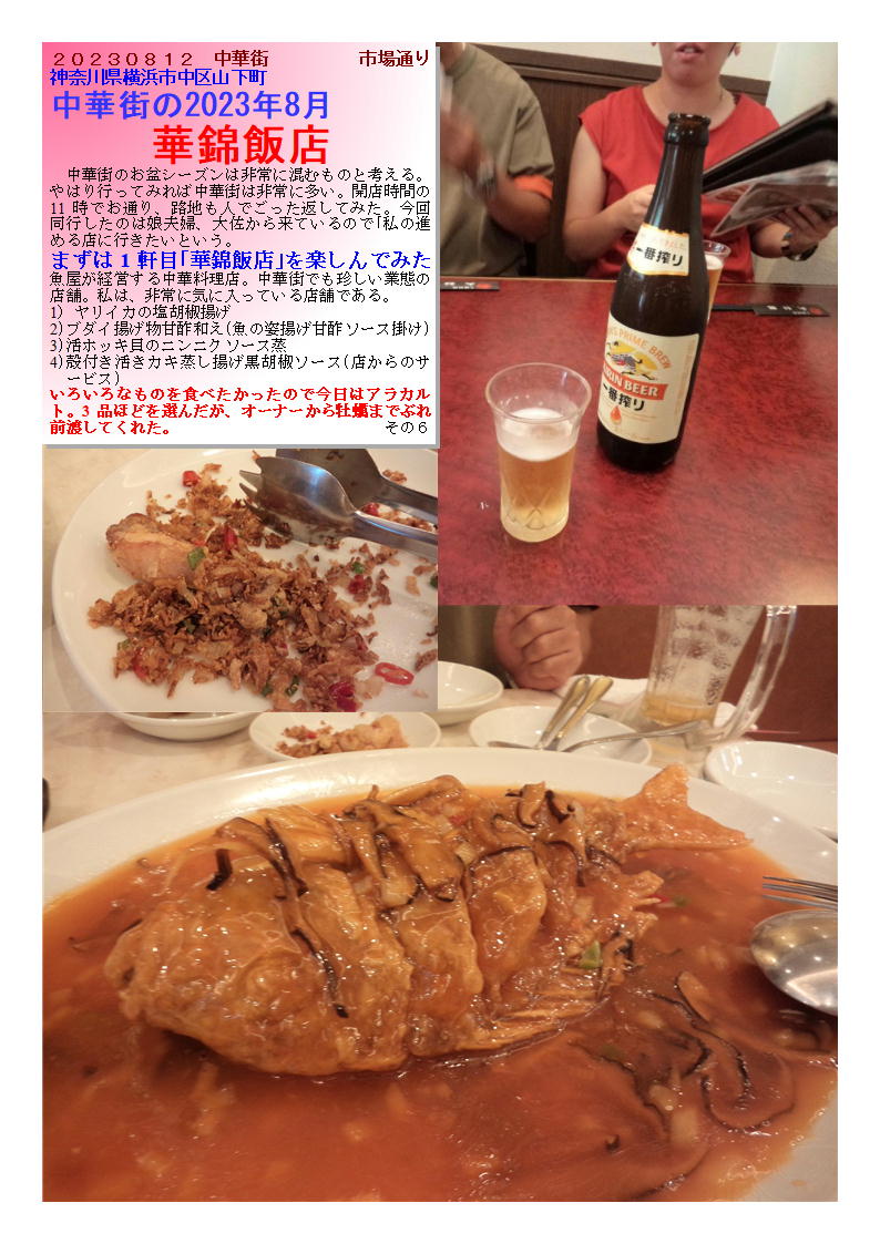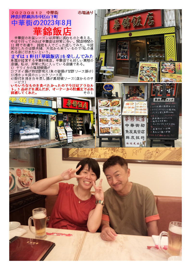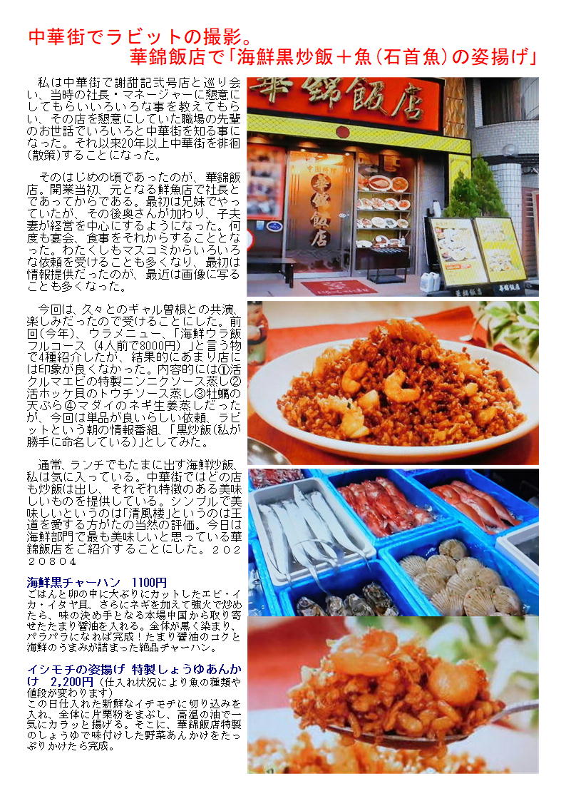 私の情報は、facebook twitter. を確認ください。「中華街を大切にする人」「ご利用する人」にはご協力をします。質問があれば、コメント欄 or sosamu@ya2.so-net.ne.jp にご連絡ください。 中華街で「定番料理」 並んでも食べたい店(料理) 9.その他(興味がわく料理) ③華錦飯店 「海鮮料理」 ![]() 20230812 中華街 市場通り 神奈川県横浜市中区山下町 中華街の2023年8月 華錦飯店 中華街のお盆シーズンは非常に混むものと考える。やはり行ってみれば中華街は非常に多い。開店時間の11時でお通り、路地も人でごった返してみた。今回同行したのは娘夫婦、大佐から来ているので「私の進める店に行きたいという。 まずは1軒目「華錦飯店」を楽しんでみた 魚屋が経営する中華料理店。中華街でも珍しい業態の店舗。私は、非常に気に入っている店舗である。 1)ヤリイカの塩胡椒揚げ 2)ブダイ揚げ物甘酢和え(魚の姿揚げ甘酢ソース掛け) 3)活ホッキ貝のニンニクソース蒸 4)殻付き活きカキ蒸し揚げ黒胡椒ソース(店からのサ ービス) いろいろなものを食べたかったので今日はアラカルト。3品ほどを選んだが、オーナーから牡蠣までぶれ前渡してくれた。 中華街でミニコースを楽しむ。テレビの取材で紹介した店へ 華錦飯店「海鮮4品」(テレビ朝日「うらめしや」) 一軒はある程度豪華で、見栄えのあるコース仕立てにしたいというので、海鮮の華錦飯店をお薦めした。何せ魅力は、鮮魚店が営む中華料理店。先代までがつくった鮮魚店の一部を改訂し、ビルを建て、息子さんが中華料理もできるようにした店舗。 私とは、10年ほど前の開業からの付き合いとなっている。宴会も10回程度お願いしているが、いつも期待以上のものを提供指してくれる。お薦めの店である。特に、ご主人の純朴な人柄が好きで有り、いろいろと相談しながらおいしいものを特別に作ってもらっている。そういった意味からでも「うらめし」は非常に得意な料理店。決まったのは次の4種(魚の入荷で当日決定)となった。 ①蒸し生き車海老のニンニクソース和 ②ホッキ貝の黒豆ソース蒸し ③牡蠣の揚げ物、甘味醤油ソースかけ ④蒸し魚(鯛)の香りソース ※名称は聞いたが忘れたので私が命名 まずは、「蒸し生き車海老のニンニクソース和え」。隣接する鮮魚店の生け簀で泳いでいたものをご主人がさばき、瀬開きとして下ごしらえをしたものを、調理人が素早く調理する。色が赤く変わった頃に取り出し、ニンニクタップリの油ソースをかけた物。出されたときから香ばしさが漂う。見ても美味しさが伝わってきた。 当然、食べて見ても美味しい。海老は頭からがぶりと言うのが私の通例、食べようとすれば、髭に注意をするように言われたがすでに口に入っていた。かめば噛むほど、海老の風味とニンニクが相まって美味しくなる。私も初めてたべたものとなった。 続いて、「ホッキ貝の黒豆(豆豉)ソース蒸し」。この時期の旬の物。魚屋では大きな物があったので、今日はホッキ貝は外せないと思い、お願いした。肉厚の美味しいものを提供してくれた。下ごしらえにも工夫がされているのと蒸し具合が良いのであろう、コリコリ感のある物となっていた。豆豉と思われる塩分が味を増幅していた。ビールがほしいが、当然提供されなかった。 三番手は「牡蠣」。天麩羅のようでフリッターでもあるような仕上がり、もしかすると衣は強力粉かもしれない(いろいろ聞いたが今回はマスコミ対応なかなか明かさなかった)。強い熱で短時間に揚げているのであろう。表面はかりかり。中は半生状態。牡蠣の風味を心地よく出していた。醤油に甘めのものを入れているのであろう、それをかけるとまた違う味として楽しめた。 最後は、私もコースを頼むと必ず出してくれる魚一尾の料理。今日は鯛が良い物が入荷したらしいので、「蒸し魚(鯛)の香りソース」となったようである。とにかく今回はご主人に素材と相談して決めていく方式。鯛の姿・味も十分楽しめる演出となっていた。ソース、添えてある野菜も美味しい。取り分けていただき味わった。 最後の最後は、私の流儀。ほぐしタレが十分にしみこんだ魚をご飯にかけて食べて行く方式を楽しんだ。2度3度楽しめるのが華錦飯店の海鮮料理。今回は取材なのでわがままをお願いしたが、一般の方は、入荷と店の混雑状況等を考え決して無理な面掛はしないでいただきたい。同様のものを食べたければ、予約をすれば、ご飯とスープを付けて10000円(3~4人分)程度で対応してくれるという太っ腹。一人3000円程度で大丈夫である。 華錦飯店⑧ 中華街でラビットの撮影。 華錦飯店で「海鮮黒炒飯+魚(石首魚)の姿揚げ」 私は中華街で謝甜記弐号店と巡り会い、当時の社長・マネージャーに懇意にしてもらいいろいろな事を教えてもらい、その店を懇意にしていた職場の先輩のお世話でいろいろと中華街を知る事になった。それ以来20年以上中華街を徘徊(散策)することになった。 そのはじめの頃であったのが、華錦飯店。開業当初、
