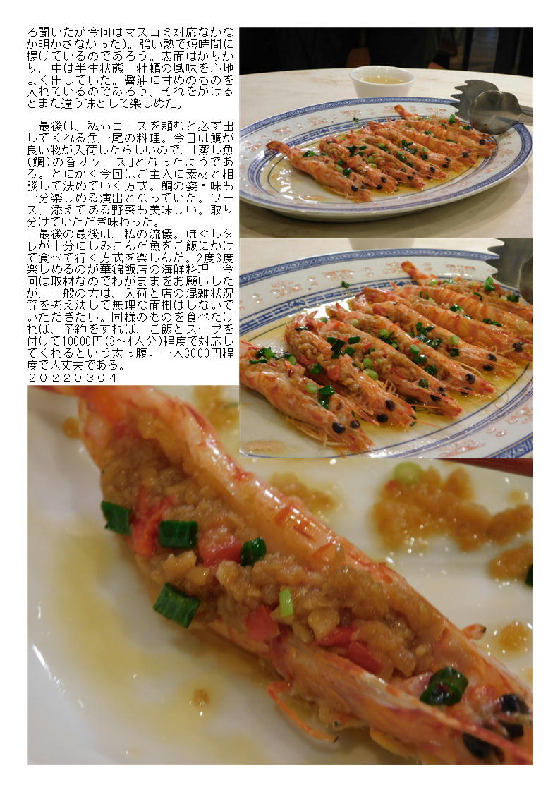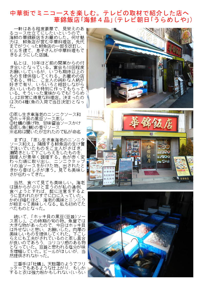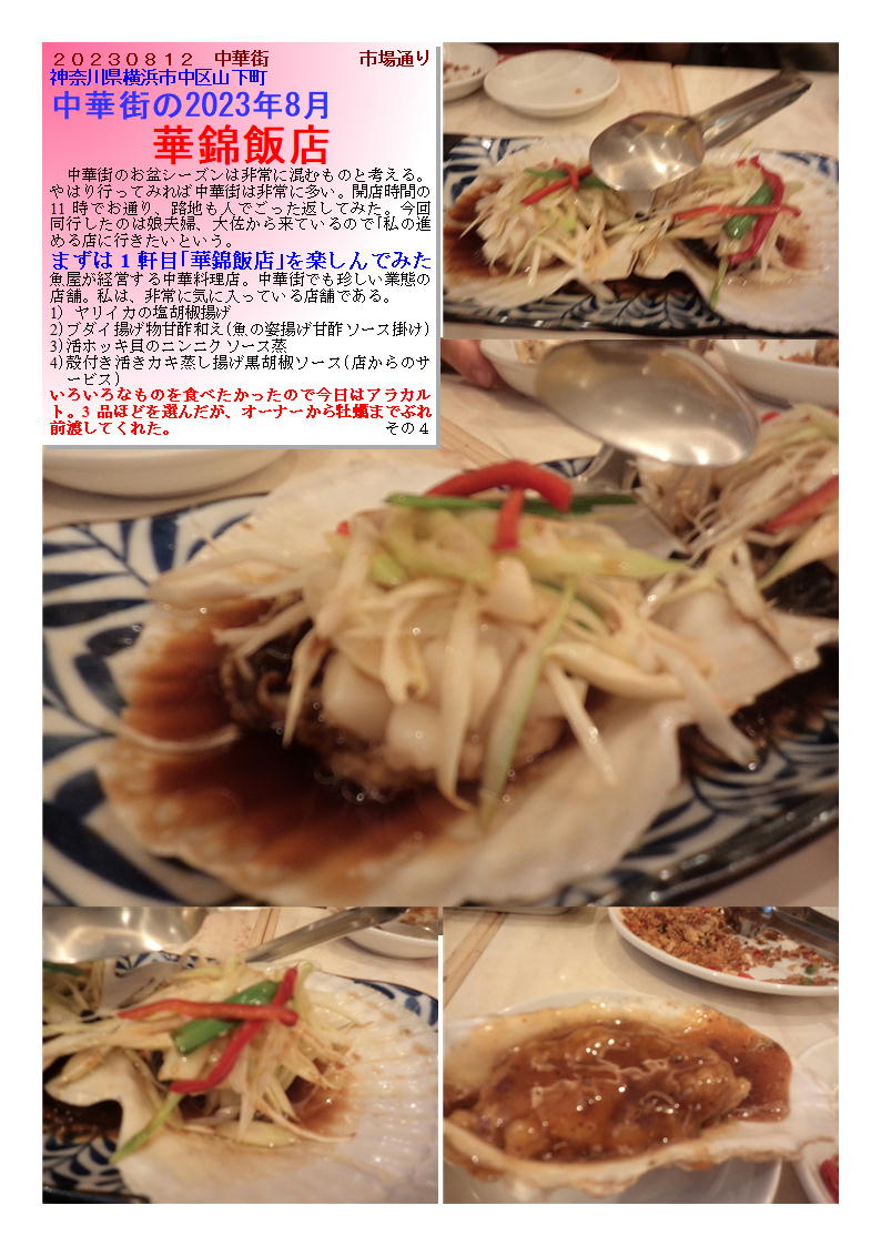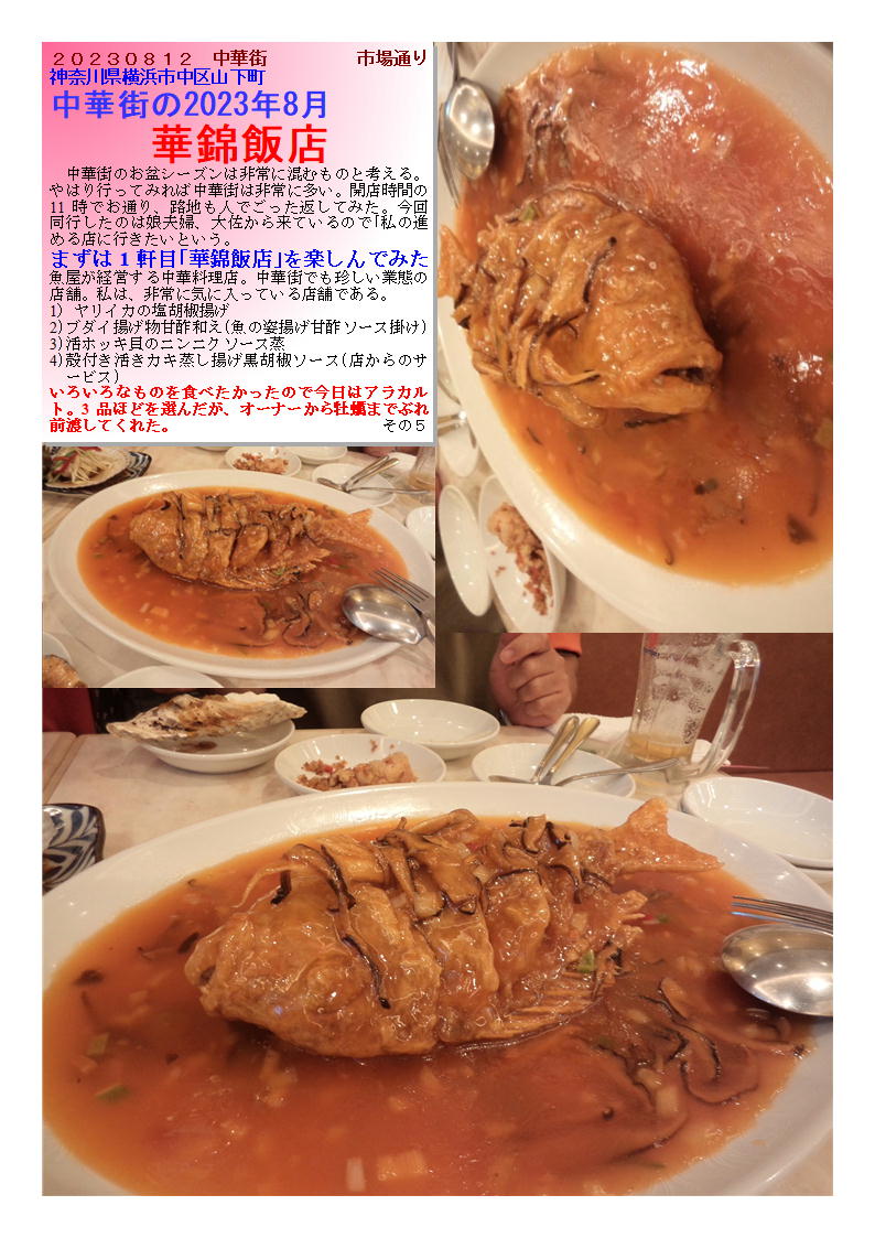 私の情報は、facebook twitter. を確認ください。「中華街を大切にする人」「ご利用する人」にはご協力をします。質問があれば、コメント欄 or sosamu@ya2.so-net.ne.jp にご連絡ください。 中華街で「定番料理」 並んでも食べたい店(料理) 9.その他(興味がわく料理) ③華錦飯店 「海鮮料理」 ![]() 20230812 中華街 市場通り 神奈川県横浜市中区山下町 中華街の2023年8月 華錦飯店 中華街のお盆シーズンは非常に混むものと考える。やはり行ってみれば中華街は非常に多い。開店時間の11時でお通り、路地も人でごった返してみた。今回同行したのは娘夫婦、大佐から来ているので「私の進める店に行きたいという。 まずは1軒目「華錦飯店」を楽しんでみた 魚屋が経営する中華料理店。中華街でも珍しい業態の店舗。私は、非常に気に入っている店舗である。 1)ヤリイカの塩胡椒揚げ 2)ブダイ揚げ物甘酢和え(魚の姿揚げ甘酢ソース掛け) 3)活ホッキ貝のニンニクソース蒸 4)殻付き活きカキ蒸し揚げ黒胡椒ソース(店からのサ ービス) いろいろなものを食べたかったので今日はアラカルト。3品ほどを選んだが、オーナーから牡蠣までぶれ前渡してくれた。 中華街でミニコースを楽しむ。テレビの取材で紹介した店へ 華錦飯店「海鮮4品」(テレビ朝日「うらめしや」) 一軒はある程度豪華で、見栄えのあるコース仕立てにしたいというので、海鮮の華錦飯店をお薦めした。何せ魅力は、鮮魚店が営む中華料理店。先代までがつくった鮮魚店の一部を改訂し、ビルを建て、息子さんが中華料理もできるようにした店舗。 私とは、10年ほど前の開業からの付き合いとなっている。宴会も10回程度お願いしているが、いつも期待以上のものを提供指してくれる。お薦めの店である。特に、ご主人の純朴な人柄が好きで有り、いろいろと相談しながらおいしいものを特別に作ってもらっている。そういった意味からでも「うらめし」は非常に得意な料理店。決まったのは次の4種(魚の入荷で当日決定)となった。 ①蒸し生き車海老のニンニクソース和 ②ホッキ貝の黒豆ソース蒸し ③牡蠣の揚げ物、甘味醤油ソースかけ ④蒸し魚(鯛)の香りソース ※名称は聞いたが忘れたので私が命名 まずは、「蒸し生き車海老のニンニクソース和え」。隣接する鮮魚店の生け簀で泳いでいたものをご主人がさばき、瀬開きとして下ごしらえをしたものを、調理人が素早く調理する。色が赤く変わった頃に取り出し、ニンニクタップリの油ソースをかけた物。出されたときから香ばしさが漂う。見ても美味しさが伝わってきた。 当然、食べて見ても美味しい。海老は頭からがぶりと言うのが私の通例、食べようとすれば、髭に注意をするように言われたがすでに口に入っていた。かめば噛むほど、海老の風味とニンニクが相まって美味しくなる。私も初めてたべたものとなった。 続いて、「ホッキ貝の黒豆(豆豉)ソース蒸し」。この時期の旬の物。魚屋では大きな物があったので、今日はホッキ貝は外せないと思い、お願いした。肉厚の美味しいものを提供してくれた。下ごしらえにも工夫がされているのと蒸し具合が良いのであろう、コリコリ感のある物となっていた。豆豉と思われる塩分が味を増幅していた。ビールがほしいが、当然提供されなかった。 三番手は「牡蠣」。天麩羅のようでフリッターでもあるような仕上がり、もしかすると衣は強力粉かもしれない(いろいろ聞いたが今回はマスコミ対応なかなか明かさなかった)。強い熱で短時間に揚げているのであろう。表面はかりかり。中は半生状態。牡蠣の風味を心地よく出していた。醤油に甘めのものを入れているのであろう、それをかけるとまた違う味として楽しめた。 最後は、私もコースを頼むと必ず出してくれる魚一尾の料理。今日は鯛が良い物が入荷したらしいので、「蒸し魚(鯛)の香りソース」となったようである。とにかく今回はご主人に素材と相談して決めていく方式。鯛の姿・味も十分楽しめる演出となっていた。ソース、添えてある野菜も美味しい。取り分けていただき味わった。 最後の最後は、私の流儀。ほぐしタレが十分にしみこんだ魚をご飯にかけて食べて行く方式を楽しんだ。2度3度楽しめるのが華錦飯店の海鮮料理。今回は取材なのでわがままをお願いしたが、一般の方は、入荷と店の混雑状況等を考え決して無理な面掛はしないでいただきたい。同様のものを食べたければ、予約をすれば、ご飯とスープを付けて10000円(3~4人分)程度で対応してくれるという太っ腹。一人3000円程度で大丈夫である。 華錦飯店⑧ 中華街でラビットの撮影。 華錦飯店で「海鮮黒炒飯+魚(石首魚)の姿揚げ」 私は中華街で謝甜記弐号店と巡り会い、当時の社長・マネージャーに懇意にしてもらいいろいろな事を教えてもらい、その店を懇意にしていた職場の先輩のお世話でいろいろと中華街を知る事になった。それ以来20年以上中華街を徘徊(散策)することになった。 そのはじめの頃であったのが、華錦飯店。開業当初、