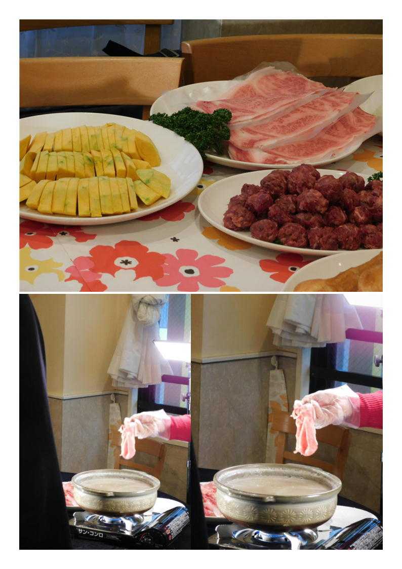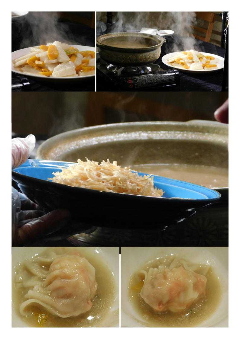 行ってみれば、2階で撮影をしていた。2席程度の小さなスペース。円卓以外のテーブルには、「海鮮類」➀海老➁帆立③いか④あさり⑤海鮮団子、「肉類」⑥鶏肉⑦ゼンマイ(ハチノス)⑧肉団子⑨牛肉(松阪牛A5ランク)⑩雲呑、「野菜類」⑪椎茸(ドンコ)⑫大根⑬南瓜、「仕上げ」⑭蒸し鶏⑮山芋⑯揚げパンなどが準備されていた。