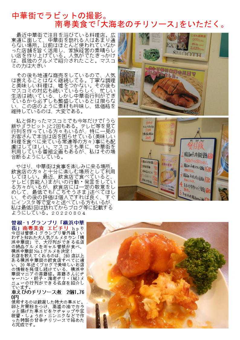 やはり、中華街は食事を楽しみに来る場所。飲食店の方々と十分に楽しむ場所として利用してほしい。最近、飲食店で食べていると、テレビ(芸能人)まがいの行動・発言をしている方々がいるが、飲食店には一定の敬意をしめして、最低でも「ごちそうさま」述べてほしい、その後の評価は個人ですれば良く、すぐにインスタ等で堂々と述べている方もいるが、私は最低3回は訪れてからブログ等に記載する ようにしている。20220804