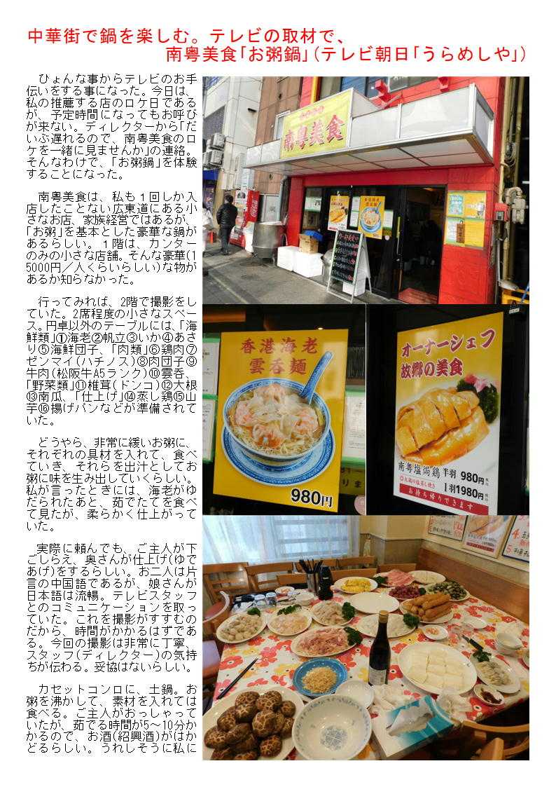 中華街で鍋を楽しむ。テレビの取材で、 南粤美食「お粥鍋」(テレビ朝日「うらめしや」) ひょんな事からテレビのお手伝いをする事になった。今日は、私の推薦する店のロケ日であるが、予定時間になってもお呼びが来ない。ディレクターから「だいぶ遅れるので、南粤美食のロケを一緒に見ませんか」の連絡。そんなわけで、「お粥鍋」を体験することになった。