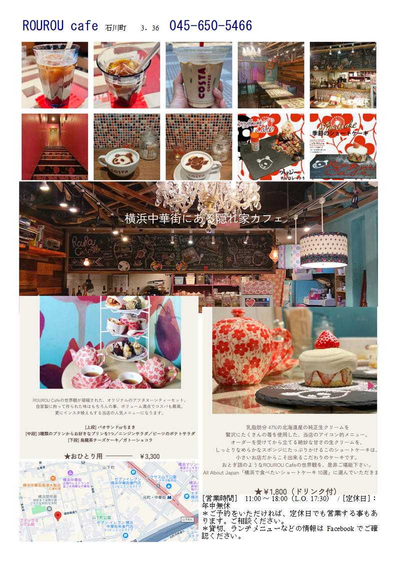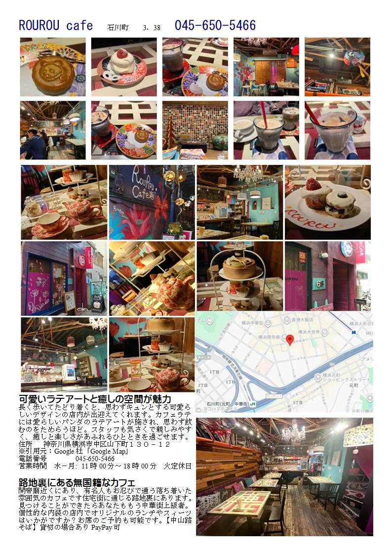 春節(正月の料理)も出始めています。 ROUROU Cafe 春節特別プレート 春節特別プレート 1,500円 じっくり煮込んだ角煮を挟んだ角煮パオサンド、いちごのショートケーキ、フォンダンショコラ月餅の3種のセットです。ドリンク付き。 住所 〒231-0023 神奈川県横浜市中区山下町130−12 ※引用元:Google社「Google Map」 電話番号 045-650-5466 営業時間 月曜日-日: 11時00分~18時00分 ROUROU cafe 石川町 3.38 045-650-5466 可愛いラテアートと癒しの空間が魅力 長く歩いてたどり着くと、思わずキュンとする可愛らしいデザインの店内が出迎えてくれます。カフェラテには愛らしいパンダのラテアートが施され、思わず飲むのをためらうほど。スタッフも気さくで親しみやすく、癒しと楽しさがあふれるひとときを過ごせます。 住所 神奈川県横浜市中区山下町130−12 ※引用元:Google社「Google Map」 電話番号 045-650-5466 営業時間 水-月: 11時00分~18時00分 火定休日 路地裏にある無国籍なカフェ 関帝廟近くにあり、有名人もお忍びで通う落ち着いた雰囲気のカフェです住宅街に通じる路地裏にあります。見つけることができたらあなたももう中華街上級者。個性的な内装の店内でオリジナルのランチやスィーツはいかがですか?お席のご予約も可能です。【中山路そば】貸切の場合ありPayPay可 ![]() ![]() ROUROU cafe 石川町 3.36 045-650-5466 [営業時間] 11:00~18:00(L.O. 17:30) / [定休日]:年中無休 *ご予約をいただければ、定休日でも営業する事もあります。ご相談ください。 *貸切、ランチメニューなどの情報はFacebookでご確認ください。