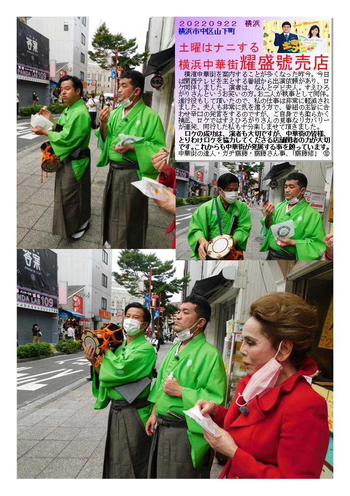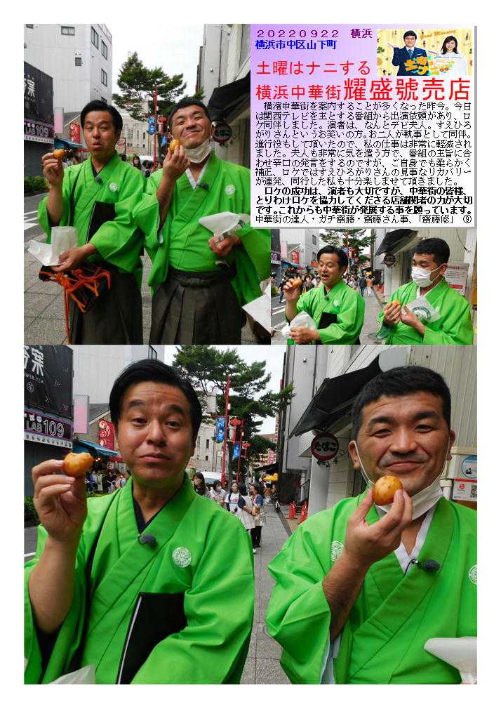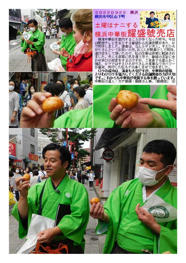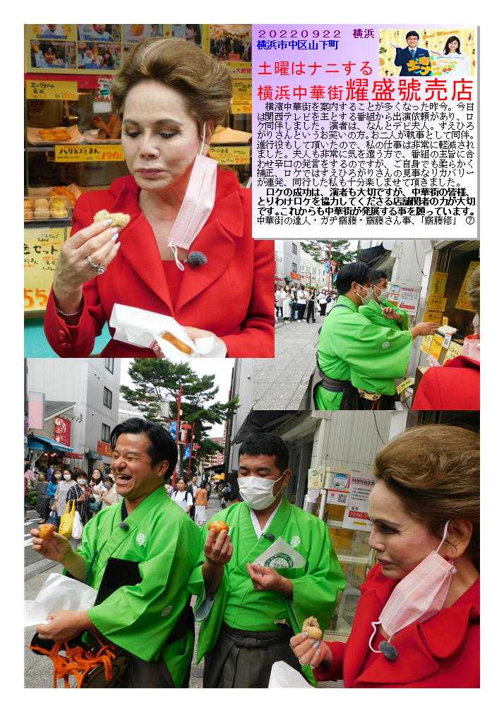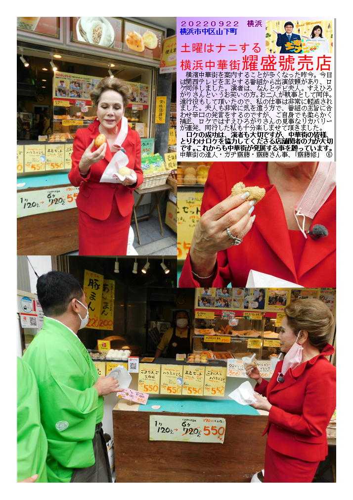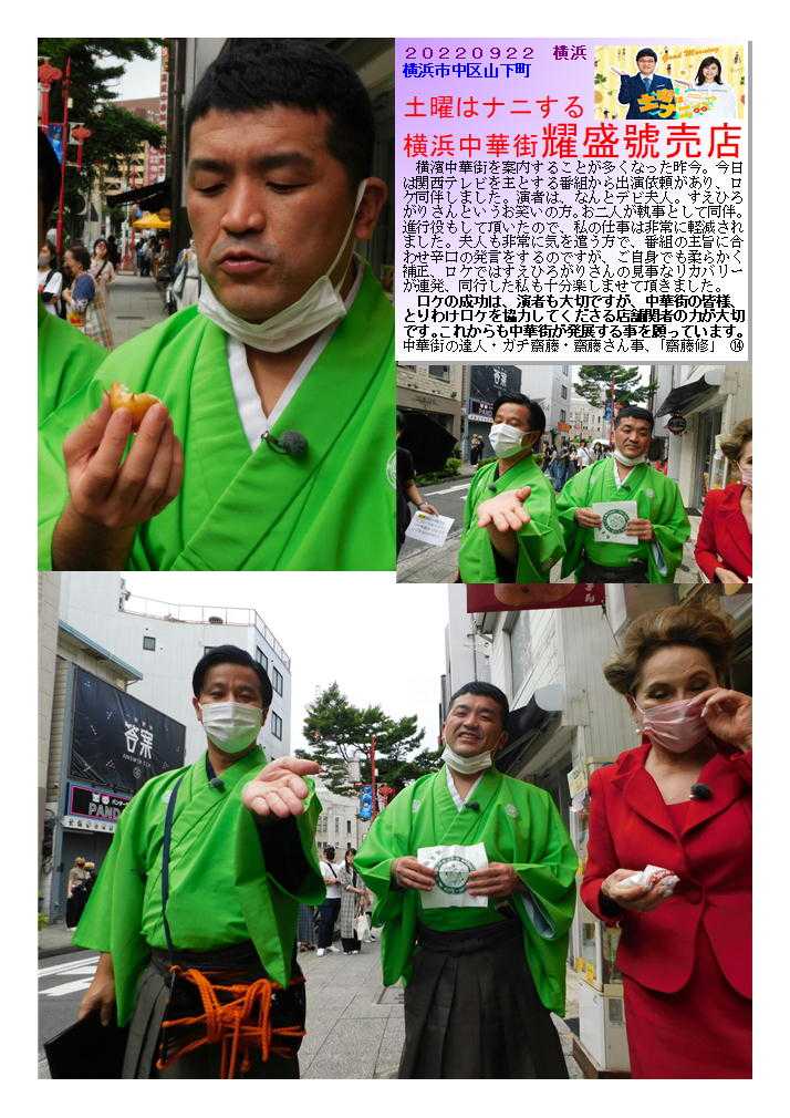 耀盛號➀ 老舗の売店、いろいろなアイディア饅頭も作り出す良店 ![]() 横浜中華街ならではの中華まんの魅力⑬ 売店(ティクアウト)の興味ある(美味しい)中華まん③-2 耀盛號② 老舗の売店、いろいろなアイディア饅頭も作り出す良店 1946年創業の老舗中華食材店 大人気のハリネズミまんや福福豚まんをはじめ食べ歩きお土産にぴったりのものから本格食材まで。全国発送可。通販(おとりよせ)もOK 中華街発展会hpより) 中華食材のことなら何でもおまかせ! 全国のプロ料理人からも信頼される、創業63年の中華街の老舗 ☆★ プロの料理人から料理愛好家まで常連客を有する専門店です ☆★ 耀盛號(ようせいごう)では、ピータン、ザーサイ、調味料、香辛料から、中国茶、中国酒、点心まで、中華食材は何でも揃っています。食材は常時7~800種類とマニアックな食材も取り揃えております。 なおかつ卸業も行っているため、価格もリーズナブル!点心など人気の冷凍食品や、珍しい調味料などは中華街のお土産としても最適! ![]() 20220922 横浜 横浜市中区山下町 土曜はナニする 横浜中華街耀盛號売店 横濱中華街を案内することが多くなった昨今。今日は関西テレビを主とする番組から出演依頼があり、ロケ同伴しました。演者は、なんとデビ夫人。すえひろがりさんというお笑いの方。お二人が執事として同伴。進行役もして頂いたので、私の仕事は非常に軽減されました。夫人も非常に気を遣う方で、番組の主旨に合わせ辛口の発言をするのですが、ご自身でも柔らかく補正、ロケではすえひろがりさんの見事なリカバリーが連発、同行した私も十分楽しませて頂きました。 ロケの成功は、演者も大切ですが、中華街の皆様、とりわけロケを協力してくださる店舗関者の力が大切です。これからも中華街が発展する事を願っています。中華街の達人・ガチ齋藤・齋藤さん事、「齋藤修」 ![]() ![]() ![]() ![]() ![]() ![]() ![]() ![]() ![]() ![]() ![]() ![]() ![]() ![]() お気に入りの記事を「いいね!」で応援しよう
