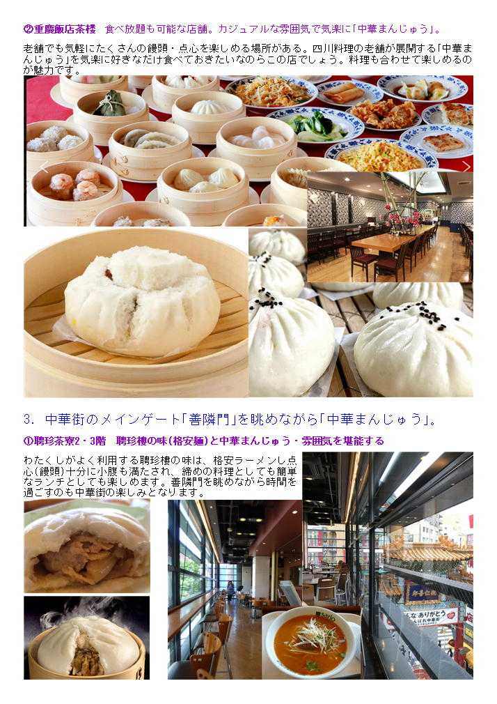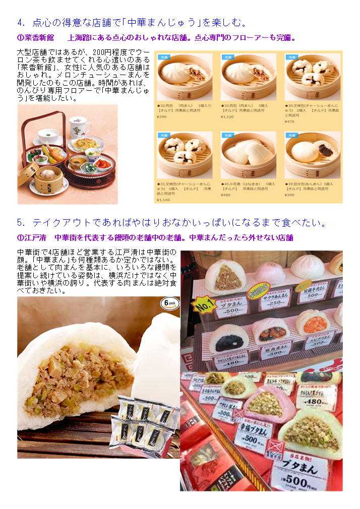 横浜中華街は、様々の業種が相互に助け合い中華街を形成してます。その成果、「中華まん」においてももオーソドックスな物から、気を狙った物まで様々な物が提供され、中華街を訪れる人たちの胃袋も満たしています。 ついつい、「中華まん」はテイクアウト・街歩きの楽しみと思っていらっしゃる方も多いと思いますが、きちんとした饅頭は、500円を超えるものもあり、ボリューム的には、ゆっくり食べたいもの、饅頭も1個食べればおなかも十分満たされるものである。 そんなわけで、横浜中華街ならではの「中華まん」の楽しみ方を提案してみます。