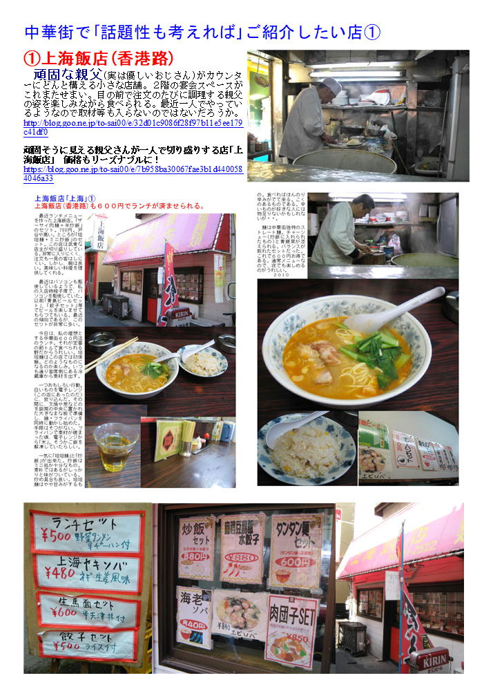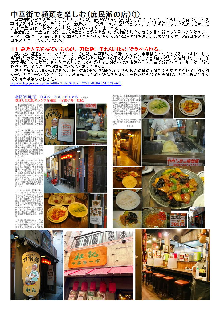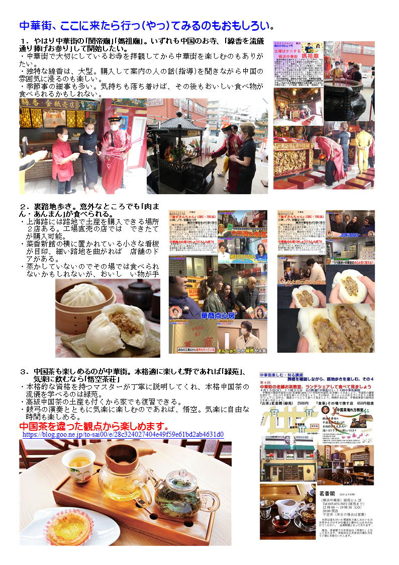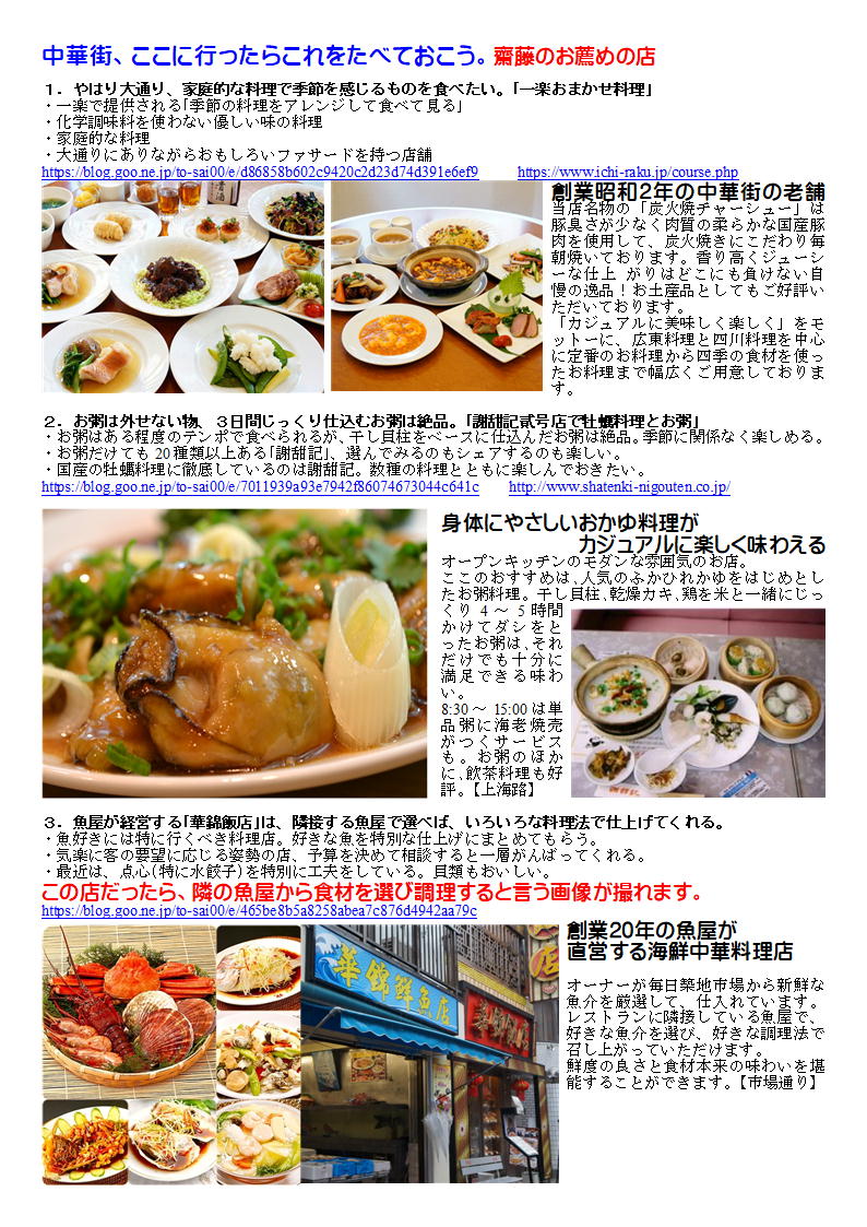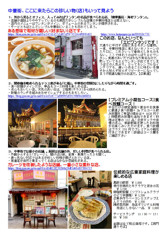 私の情報は、facebook twitter. を確認ください。「中華街を大切にする人」「ご利用する人」にはご協力をします。質問があれば、コメント欄 or sosamu@ya2.so-net.ne.jp にご連絡ください。中華街は、中華街の魅力を、最近の中華街は中年おじさんの散策part2-ご覧ください。私のもう一つの趣味、山登り(過去の記録をまとめています)。山好きおじさんの部屋 もご覧ください中華街、ここに来たらこの珍しい物(店)もいって見よう 1.外から見るとオフィス、入ってみればワンタンの名品が食べられる店、「慶華飯店・海老ワンタン」。・店舗が道路よりやや下っているのも原因だがシンプルな店構え中華料理店とは思えない。・店内のメニューはワンタンがメイン、ボリュームのあるワンタンが提供される。・サービスもほとんどシンプル中華街にいることも忘れてしまう。ある意味で取材が難しい(好まない)店です。https://blog.goo.ne.jp/to-sai00/e/34741457c1d07cf5973524c4f0883d35 https://www.hotpepper.jp/strJ000104779/このお店、なんといっても 「エビワンタン」です!大通りに平行する路にあるモダンな建物。一見、中華料理店に見えないモノトーンの入り口に、これといって看板らしきものもない。ここで味わうのはやっぱりエビワンタン。食通のあいだではかなり有名なので、黙っていてもエビワンタンが出てきてしまうほどの人気ぶり。とってもシンプルなインテリアも、通いつめるごとに味わいを増すから知らず知らずリピーターになってしまう不思議な魅力のお店だ。【広東道】 2.関帝廟を眺められるテラス席がある「七福」。中華街の雰囲気にしたりながら時間を過ごす。・食べ放題がメインだが、単品もコース料理も楽しめる店。・点心もおいしい店。天気の良い日は、2階席(テラス)から眺められる。・数種のランチを組み合わせてシェアするのもおもしろい。https://blog.goo.ne.jp/to-sai00/e/e45c6777a89f995d591598f64cb88f34【プレミアム小籠包コース】食べ放題コース!平日だけの限定価格≫宴会やお食事に最適♪食べ放題+2hアルコール飲み放題をご希望の場合は+1628円で2時間飲み放題も追加できます!料理は圧巻の112品!北京ダックや自慢の点心、季節野菜を使ったお料理がお楽しみいただけます。食べ放題はプラス550円でプレミアム小籠包付きにできます!詳細はコース欄をご確認下さい 3.中華街では最小の店舗、。厨房は店舗の外、珍しい料理が食べられる店。・外観からすると「ガレージ」、聞けば以前。倉庫・車庫だったとも聞く。・素っ気ない対応ではあるが珍しい料理が掲げられている店。・常連客が自然と集まってくる店はなかなか雰囲気がある。ガレージを改装したような店舗。一番小さな素朴な店。https://blog.goo.ne.jp/to-sai00/e/d3d622f2502b8a59df1d40c807884735伝統的な広東家庭料理が楽しめる店黒酢の酢豚 ¥1,000骨付き鶏肉とキクラゲと百合の花 ¥1,500椒塩軟殻蟹(ソフトシェルクラブのピリ辛唐揚)¥1,500広東手作りベーコンとスナップえんどうの炒め ¥1,500陳皮蒸肉餅 当店オリジナル料理 当店にしかない一品 ¥1,000サービスランチ 11:00~15:00 ¥500金額は全て税込価格です。【西門通りそば】