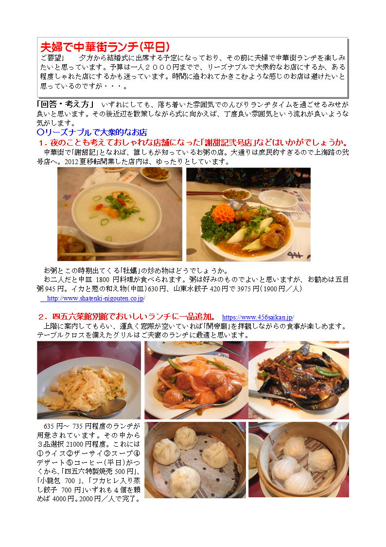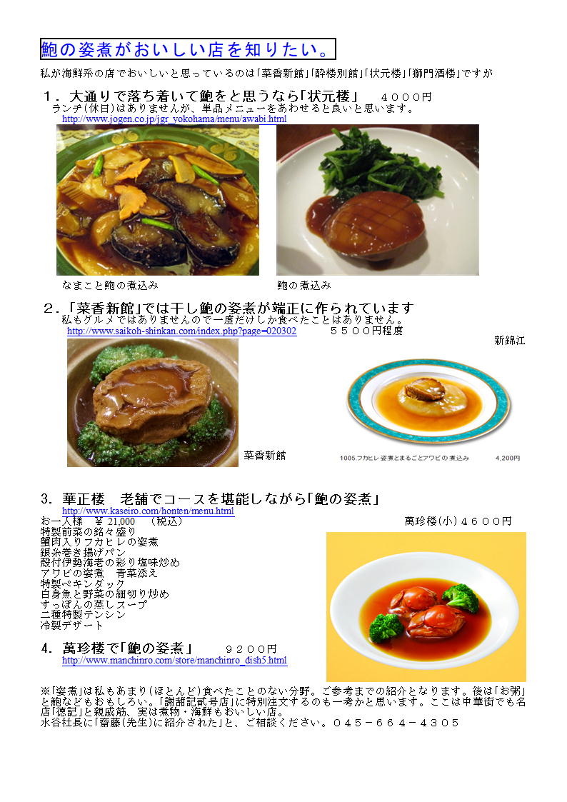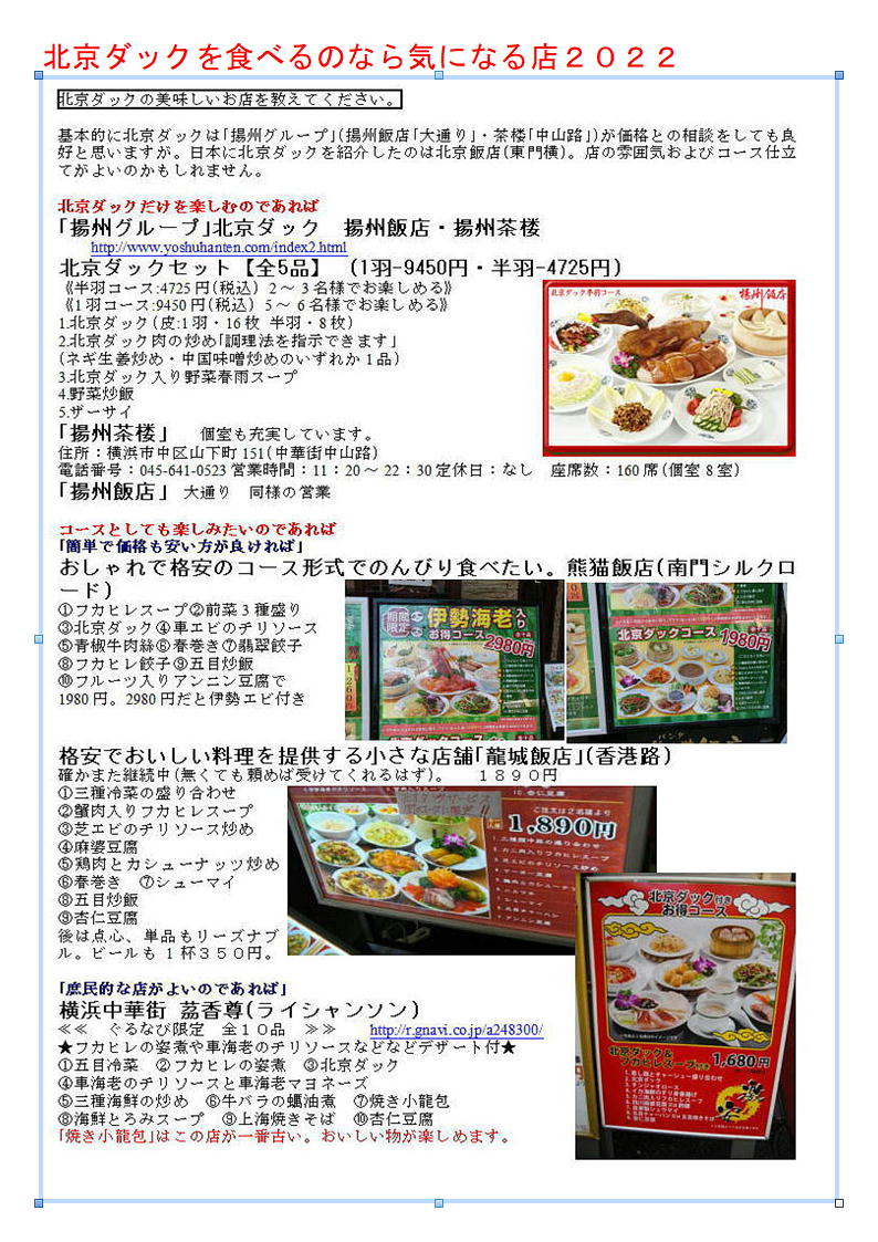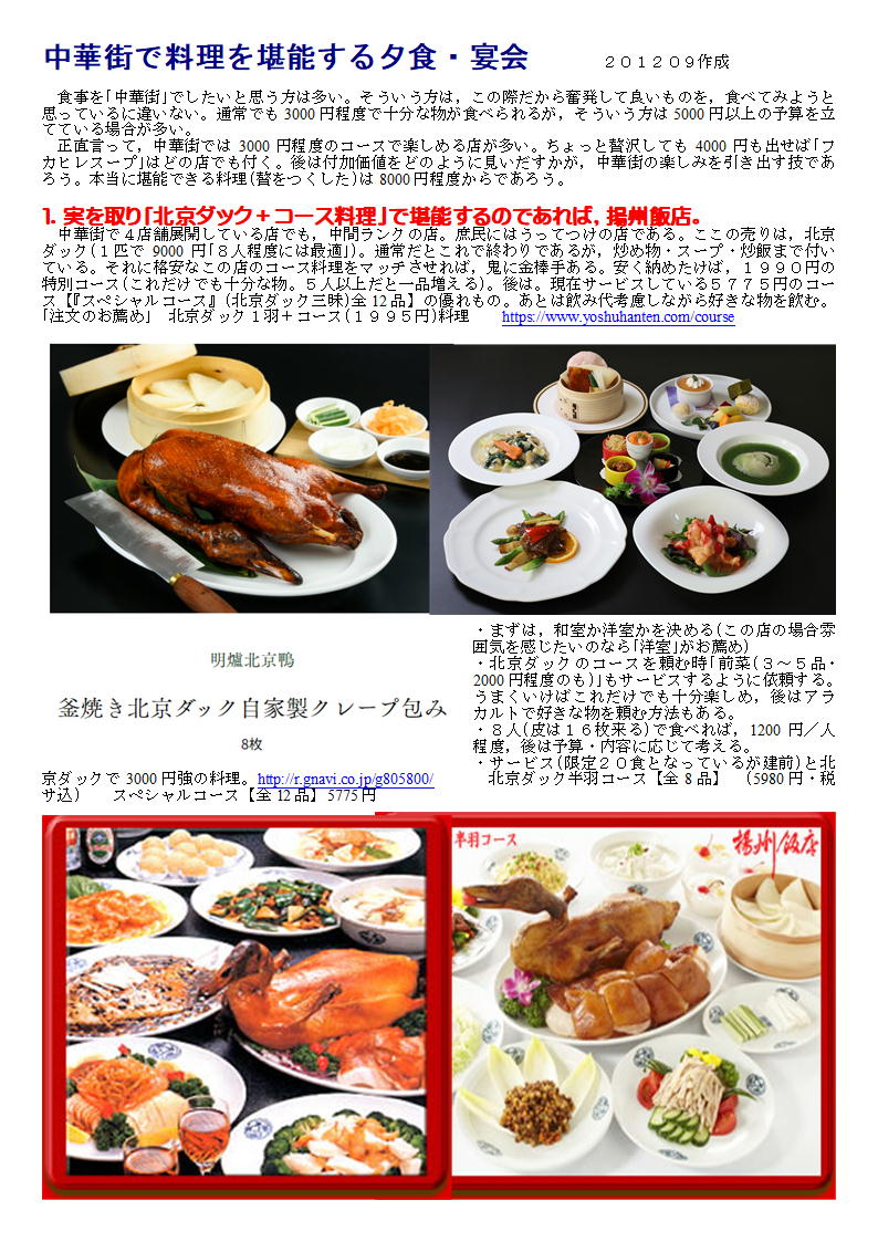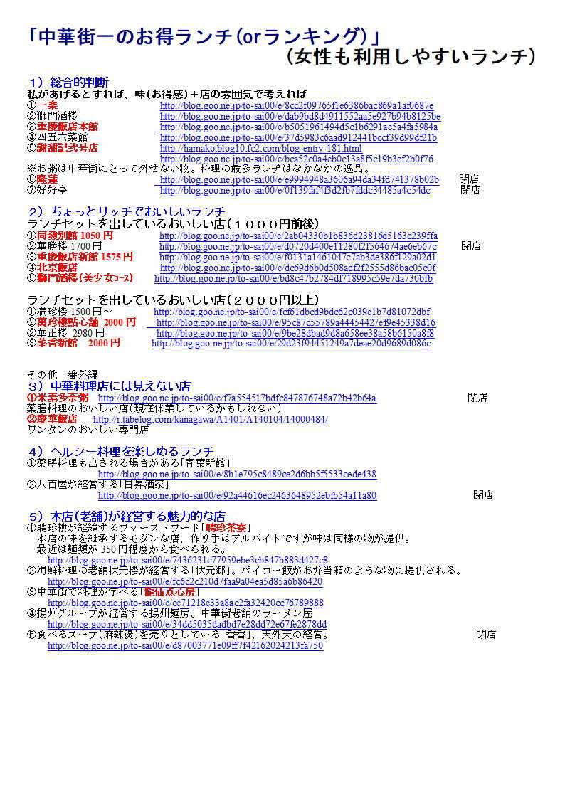私の情報は、facebook twitter. を確認ください。「中華街を大切にする人」「ご利用する人」にはご協力をします。質問があれば、コメント欄 or sosamu@ya2.so-net.ne.jp にご連絡ください。中華街は、中華街の魅力を、最近の中華街は中年おじさんの散策part2-ご覧ください。私のもう一つの趣味、山登り(過去の記録をまとめています)。山好きおじさんの部屋 もご覧ください中華街、ここに来たらこの珍しい物(店)もいって見よう 1.外から見るとオフィス、入ってみればワンタンの名品が食べられる店、「慶華飯店・海老ワンタン」。・店舗が道路よりやや下っているのも原因だがシンプルな店構え中華料理店とは思えない。・店内のメニューはワンタンがメイン、ボリュームのあるワンタンが提供される。・サービスもほとんどシンプル中華街にいることも忘れてしまう。ある意味で取材が難しい(好まない)店です。https://blog.goo.ne.jp/to-sai00/e/34741457c1d07cf5973524c4f0883d35 https://www.hotpepper.jp/strJ000104779/このお店、なんといっても 「エビワンタン」です!大通りに平行する路にあるモダンな建物。一見、中華料理店に見えないモノトーンの入り口に、これといって看板らしきものもない。ここで味わうのはやっぱりエビワンタン。食通のあいだではかなり有名なので、黙っていてもエビワンタンが出てきてしまうほどの人気ぶり。とってもシンプルなインテリアも、通いつめるごとに味わいを増すから知らず知らずリピーターになってしまう不思議な魅力のお店だ。【広東道】 2.関帝廟を眺められるテラス席がある「七福」。中華街の雰囲気にしたりながら時間を過ごす。・食べ放題がメインだが、単品もコース料理も楽しめる店。・点心もおいしい店。天気の良い日は、2階席(テラス)から眺められる。・数種のランチを組み合わせてシェアするのもおもしろい。https://blog.goo.ne.jp/to-sai00/e/e45c6777a89f995d591598f64cb88f34【プレミアム小籠包コース】食べ放題コース!平日だけの限定価格≫宴会やお食事に最適♪食べ放題+2hアルコール飲み放題をご希望の場合は+1628円で2時間飲み放題も追加できます!料理は圧巻の112品!北京ダックや自慢の点心、季節野菜を使ったお料理がお楽しみいただけます。食べ放題はプラス550円でプレミアム小籠包付きにできます!詳細はコース欄をご確認下さい 3.中華街では最小の店舗、。厨房は店舗の外、珍しい料理が食べられる店。・外観からすると「ガレージ」、聞けば以前。倉庫・車庫だったとも聞く。・素っ気ない対応ではあるが珍しい料理が掲げられている店。・常連客が自然と集まってくる店はなかなか雰囲気がある。ガレージを改装したような店舗。一番小さな素朴な店。https://blog.goo.ne.jp/to-sai00/e/d3d622f2502b8a59df1d40c807884735伝統的な広東家庭料理が楽しめる店黒酢の酢豚 ¥1,000骨付き鶏肉とキクラゲと百合の花 ¥1,500椒塩軟殻蟹(ソフトシェルクラブのピリ辛唐揚)¥1,500広東手作りベーコンとスナップえんどうの炒め ¥1,500陳皮蒸肉餅 当店オリジナル料理 当店にしかない一品 ¥1,000サービスランチ 11:00~15:00 ¥500金額は全て税込価格です。【西門通りそば】