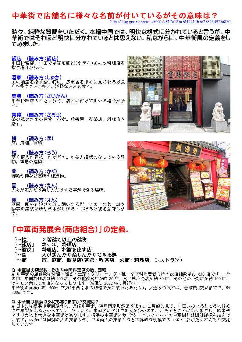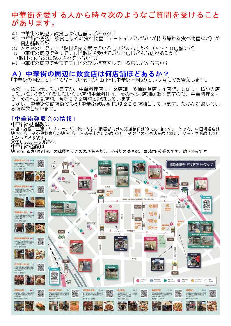 私の情報は、facebook twitter. を確認ください。「中華街を大切にする人」「ご利用する人」にはご協力をします。質問があれば、コメント欄 or sosamu@ya2.so-net.ne.jp にご連絡ください。中年おじさんの散策part2-2 から移行しています中華街の魅力は楽天ブログに今後移行していく予定です。https://plaza.rakuten.co.jp/sosamu02d/データーはライブドアーブログにも掲載します。「中華街の魅力part1」https://sosamu02dhide.livedoor.blog/ 合わせてご確認ください以前のデーターはアメバブログに移行しています。中華街の魅力お問い合わせは、sosamu@ya2.so-net.ne.jp までお願いします。中華街のいろいろなことを述べていきます。中華街を愛する人から時々次のようなご質問を受けることがあります。 A)中華街の周辺に飲食店は何店舗ほどあるか?B)中華街の周辺に飲食店以外の食べ物屋(イートインできないが持ち帰れる食べ物屋など)が 何店舗あるかC)AやBの中でテレビ取材を良く受けている店はどんな店か?(5~10店舗ほど)D)中華街の周辺で今までテレビ取材を受けていない店はどんな店があるか? (取材OKなのに取材されていない店)E)中華街の周辺で今までテレビの取材拒否をしている店はどんな店か? A)中華街の周辺に飲食店は何店舗ほどあるか?「中華街の周辺」とすべてなっていますが、山下町(中華街+周辺)という考えでお答えします。 私のhpにも示していますが、中華料理店242店舗、多種飲食店24店舗。しかし、私が入店していない(ランチをしていない店舗中華料理1、その他5)店舗がありますので、中華料理243、その他29店舗、合計272店舗と認識しています。しかし、中華街の商店街である「中華街発展会」では226店舗としています。たぶん加盟している店舗数と思います。 「中華街発展会の情報」中華街の店舗数は料理・雑貨・土産・クリーニング・靴・など対消費者向けの総店舗数は約630店です。 その内、中国料理店は約200店、その他飲食店が約80店、食品系小売店が約80店、その他の小売店が約100店、サービス業約170店となっております。※但し2022年5月調べ。中華街の面積は約500m四方(東西南北の牌楼でかこまれたあたり)。大通りの長さは、善隣門~交番までで、約300mです