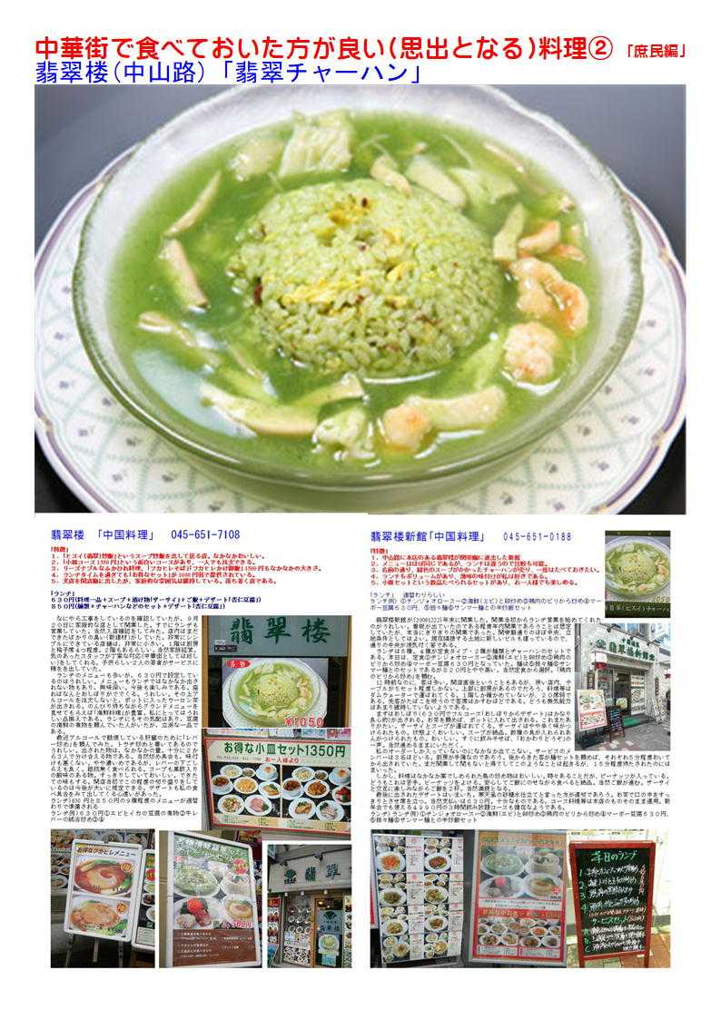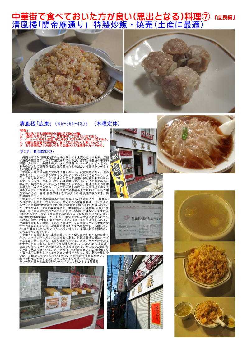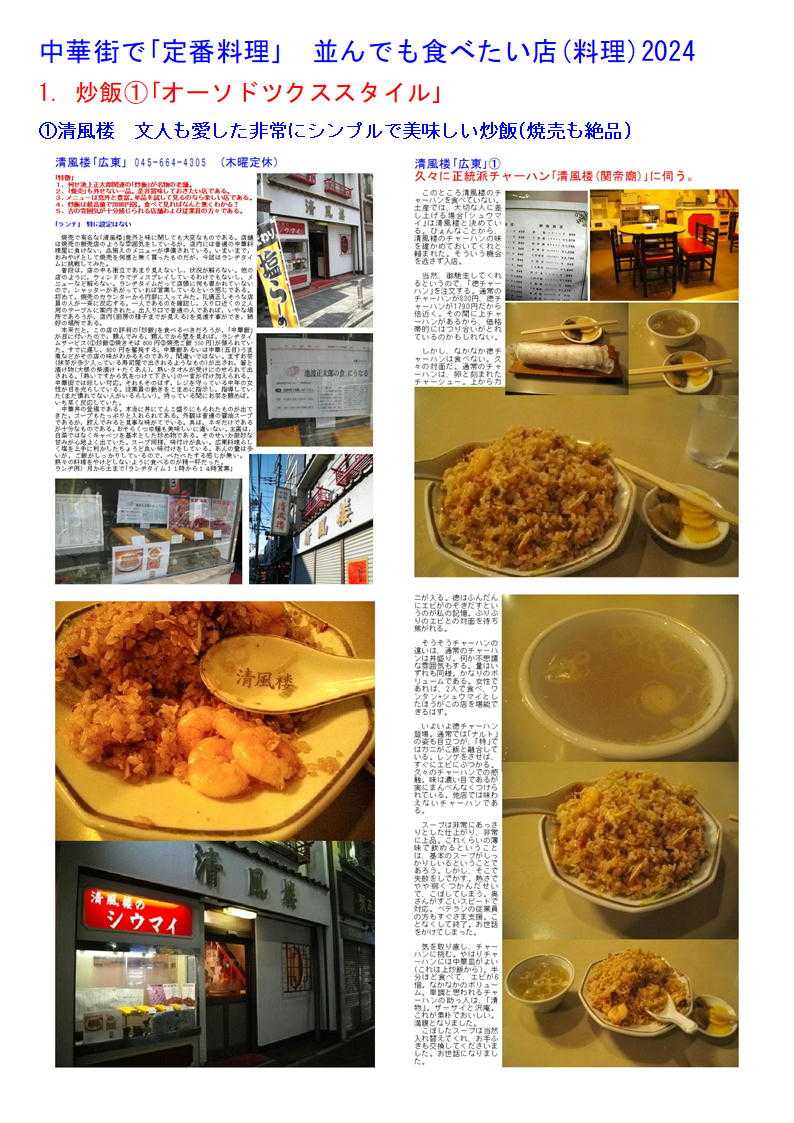 私の情報は、facebook twitter. を確認ください。「中華街を大切にする人」「ご利用する人」にはご協力をします。質問があれば、コメント欄 or sosamu@ya2.so-net.ne.jp にご連絡ください。中年おじさんの散策part2-2 から移行しています中華街の魅力は楽天ブログに今後移行していく予定です。https://plaza.rakuten.co.jp/sosamu02d/データーはライブドアーブログに掲載します。「中華街の魅力」https://sosamu02dhide.livedoor.blog/以前のデーターはアメバブログに移行しています。中華街の魅力お問い合わせは、sosamu@ya2.so-net.ne.jp までお願いします。中華街のいろいろなことを述べていきます。中華街で「定番料理」 並んでも食べたい店(料理)2024 1.炒飯①「オーソドツクススタイル」 ①清風楼 文人も愛した非常にシンプルで美味しい炒飯(焼売も絶品)清風楼「広東」 045-664-4305 (木曜定休) 「特徴」1.何せ池上正太郎関連の「炒飯」が名物の老舗。2.「焼売」も外せない一品。是非賞味しておきたい店である。3.メニューは意外と豊富。単品を試して見るのなら楽しい店である。4.炒飯は最高値で2000円弱。食べて見ればなんと無くわかる?5.古の雰囲気が十分感じられる店舗および従業員の方々である。 「ランチ」 特に設定はない 焼売で有名な「清風楼」意外と味に関しても大変なものである。店舗は焼売の販売店のような雰囲気をしているが,店内には普通の中華料理屋に負けない,品揃えのメニューが準備されている。いまいまで,おみやげとして焼売を何度と無く買ったものだが,今回はランチタイムに挑戦してみた。 普段は,店の中も衝立であまり見えないし,状況が解らない。他の店のように,ウィンドウでディスプレイしているわけでもないし,メニューなど解らない。ランチタイムだって店頭に何も書かれていないので,シャッターがあがっていれば営業しているという感じである。初めて,焼売のカウンターから内部に入ってみた。礼儀正しそうな店員の人が一斉に反応する。一人であるのを確認し,入り口近くの2人用のテーブルに案内された。出入り口で普通の人であれば,いやな場所であろうが,店内(厨房の様子までが見える)を見渡す事ができ,絶好の場所である。 本来だと,この店の評判の「炒飯」を食べるべきだろうが,「中華飯」が目に付いたので,頼んでみる。頼んでから壁を見れば,ランチタイムサービス(①炒飯②焼きそば600円③焼売ご飯550円)が張られていた。すでに遅し,800円を奮発する。中華飯あるいは中華(五目)うま煮などがその店の味がわかるものであり,間違いではない。まずお茶(抹茶が多少入っている寿司屋で出されるようなもの)が出され,箸と漬け物(大根の柴漬け+たくあん),熱いタオルが受けにのせられて出される。「熱いですから気をつけて下さい」の一言が付け加えられる。中華街では珍しい対応。それもそのはず,レジを守っている中年の女性が目を光らしている。従業員の動きをこまめに指示し,指導していた(まだ慣れてない人がいるらしい)。待っている間にお茶を頼めば,いち早く反応していた。 中華丼の登場である。本当に丼にてんこ盛りにもられたものが出てきた。スープもたっぷりと入れられてある。外観は普通の醤油スープであるが,飲んでみると見事な味がてでいる。具は,ネギだけであるが十分なものである。おそらくつゆ麺も美味しいに違いない。主賓は,白菜ではなくキャベツを基本とした炒め物である。そのせいか微妙な甘みが心地よく出ていた。スープ同様,味付けが良い。広東料理らしく塩を上手に利かしたちょうど良い味付けをしている。あんの量は多いが,ご飯がしっかりしているので,べたべたする感じが無い。熱々の料理をやけどしないように食べるのが精一杯だった。ランチ例)月から土まで「ランチタイム11時から14時営業」清風楼「広東」①久々に正統派チャーハン「清風楼(関帝廟)」に伺う。 このところ清風楼のチャーハンを食べていない。土産では、大切な人に差し上げる場合「シュウマイ」は清風楼と決めている。ひょんなことから、清風楼のチャーハンの味を確かめておいてくれと頼まれた。そういう機会を逃さず入店。 当然、御馳走してくれるというので、「徳チャーハン」を注文する。通常のチャーハンが830円、徳チャーハンが1790円だから倍近く。その間に上チャーハンがあるから、価格帯的にはつり合いがとれているのかもしれない。 しかし、なかなか徳チャーハンは食べない。久々の対面だ。通常のチャーハンは、卵と刻まれたチャーシュー。上からカニが入る。徳はふんだんにエビがのぞきだすというのが私の記憶。ぶりぶりのエビとの対面を待ち焦がれる。 そうそうチャーハンの違いは、通常のチャーハンは丼盛り。何か不思議な雰囲気もする。量はいずれも同様。かなりのボリュームである。女性であれば、2人で食べ、ワンタン+シュウマイとしたほうがこの店を堪能できるはず。 いよいよ徳チャーハン登場。通常では「ナルト」の姿も目立つが、「特」ではカニがご飯と融合している。