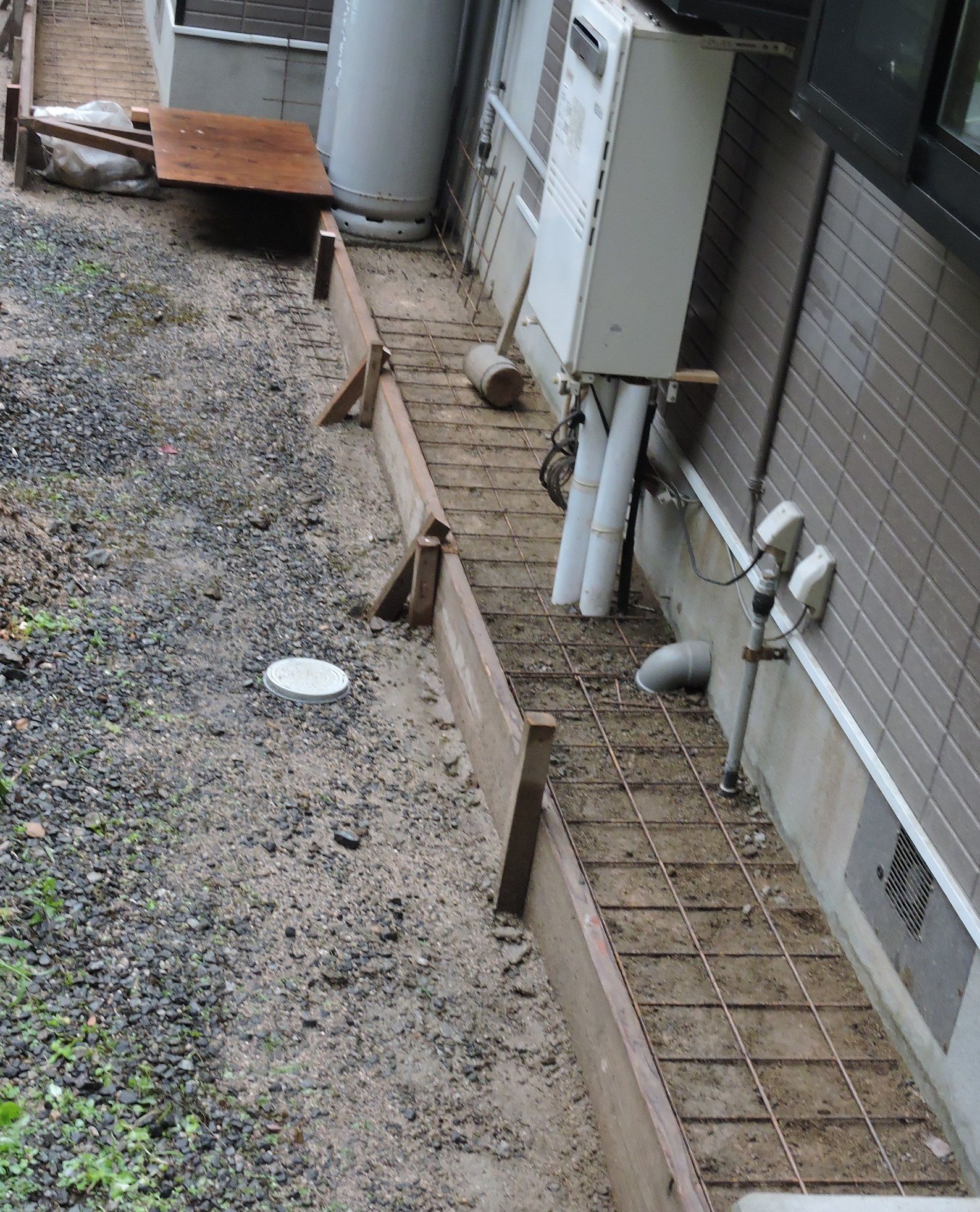 玄関横にチェーンポール設置と 犬走の 鉄筋が入りました