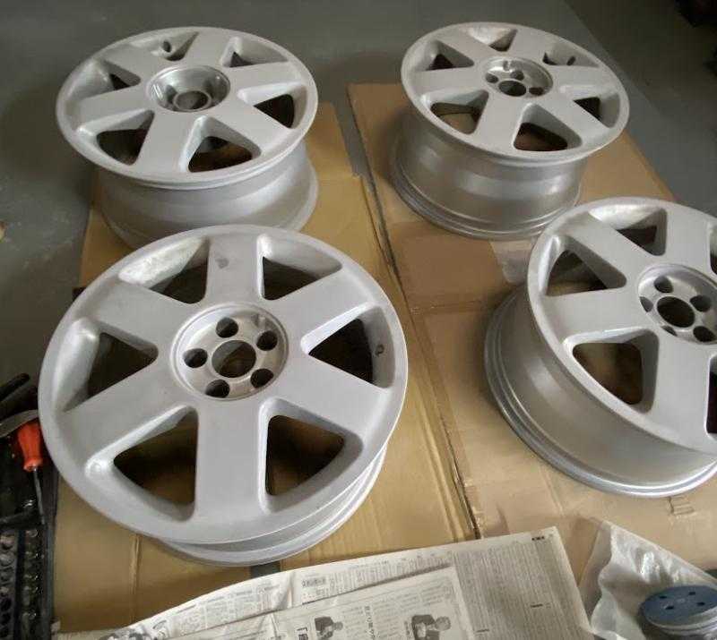 ホイール 傷修理 リフレッシュ 塗装へ 傷 整形 古い塗装も 研ぎ落として 足付け~ 研ぎ マスキングして 表側を サフェーサー塗装 下地処理 完成です サフェーサーの時 マスキングしなくたっていいじゃん いう方がいますが この後の 塗装前の 水研ぎ~の時 無駄にあちこちに飛んだ サフェーサーがざらざらして 研ぎにくくなるんですっ センターキャップは エンブレム外して 塗装へ と思いましたが これ 表面 アルミ地で 出来てるタイプ 少し 傷があったりしますが アルミ地の仕上げ このままが良いかなと思いますので 今回は このままにしようっ AUDI アウディ TT 8N 純正 ホイール リフレッシュ