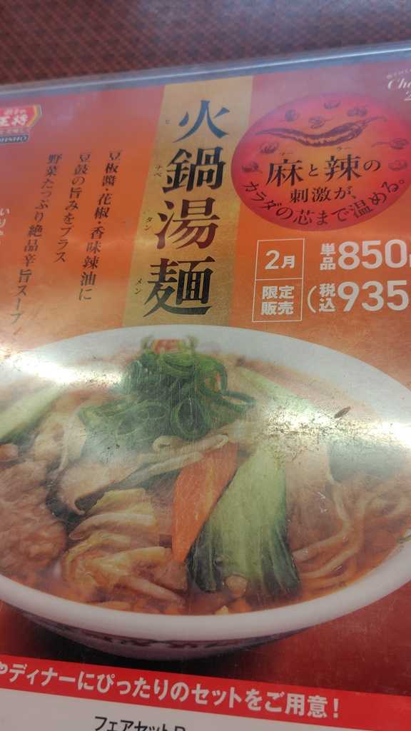 餃子の王将 期間限定の「火鍋湯麺(…