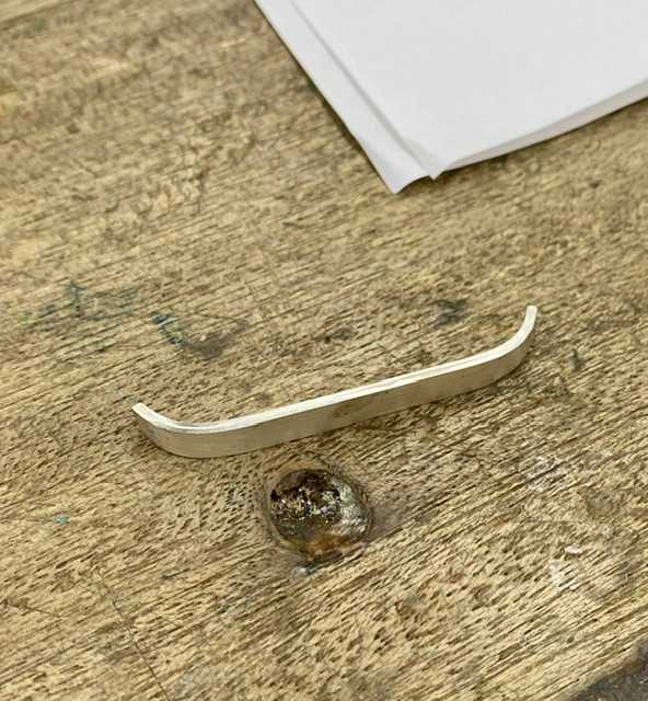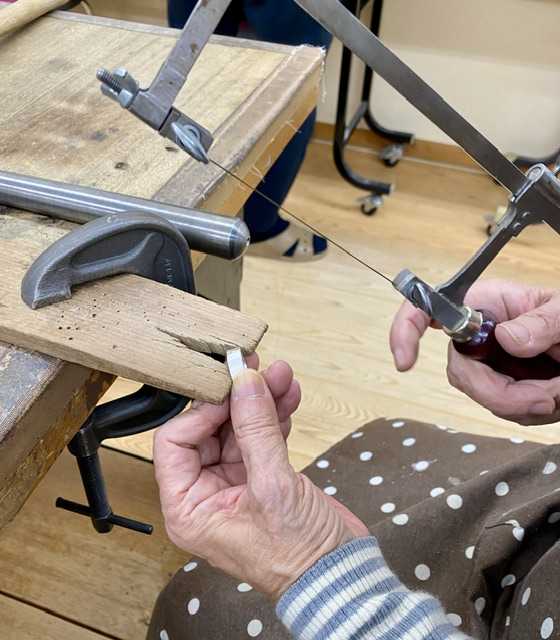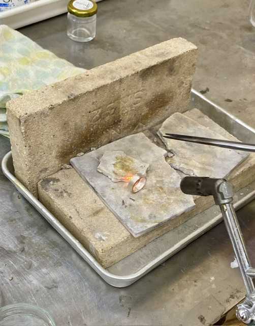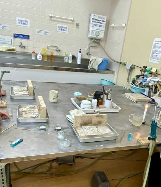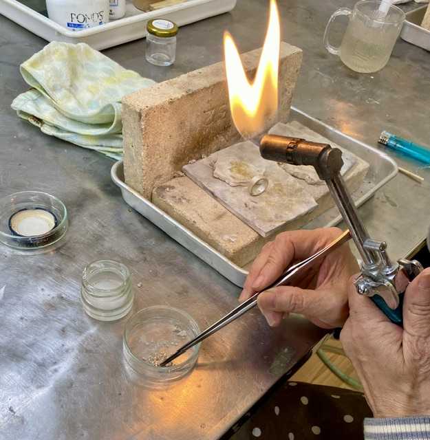 第一回は平打ちのリング まずは道具の調達 ![]() この金属類高騰の中 銀もご多分に漏れず高いわ💦 ![]() 工具も多分、職人が減ってて😢 日本の技術者を守るため ささやかな貢献ができたらよし、です ドーン⬇️ まずは指サイズから長さを計算しノコで切ってから バーナーでなます(柔らかくする) ガスとエアーのふたつで火を調整 ![]() なましたらシルバーの刻印を打つ ![]() 両端の丸みをハンマーで作る ![]() 継ぎ目を糸のこで切る ![]() 棒芯に巻きつけ木のハンマーでリングになったのを 継ぎ目をフラックス、銀ローでくっつける ![]() ![]() 継ぎ目だけではなく下の方から炙り 全体を熱する ![]() フラックス、銀ロー⬇️ ![]() 銀ローが溶けてくっ付いたら希硫酸に浸し 全体が白くなるまで置く ![]() ![]() 棒芯にはめて真円になるまでハンマーで叩く ![]() 丸くなった両サイドをヤスリで整え 表面に模様として2本の線を入れる ![]() 掘るのがなかなか大変で今日はここまで 教室の様子 ![]() まるで理科室やね(^◇^;) これはオーブンかな?⬇️ ![]() 震災以前から通ってる方もいて 常連さんが多いみたいです 初級、中級で課題を終えたら 自由に作品を作れるようになります 材料費がかなりかかりそうですが お勤めできる間は続けたいなあ 文化センターの下の階はスーパーで 半額になる時間帯 今後、それも考慮して メニュー決めよう 暖かくなったら自転車で通ってもいいな 楽しくなってきました😊 晩御飯はおでん ![]() ご馳走様でした😋 お気に入りの記事を「いいね!」で応援しよう